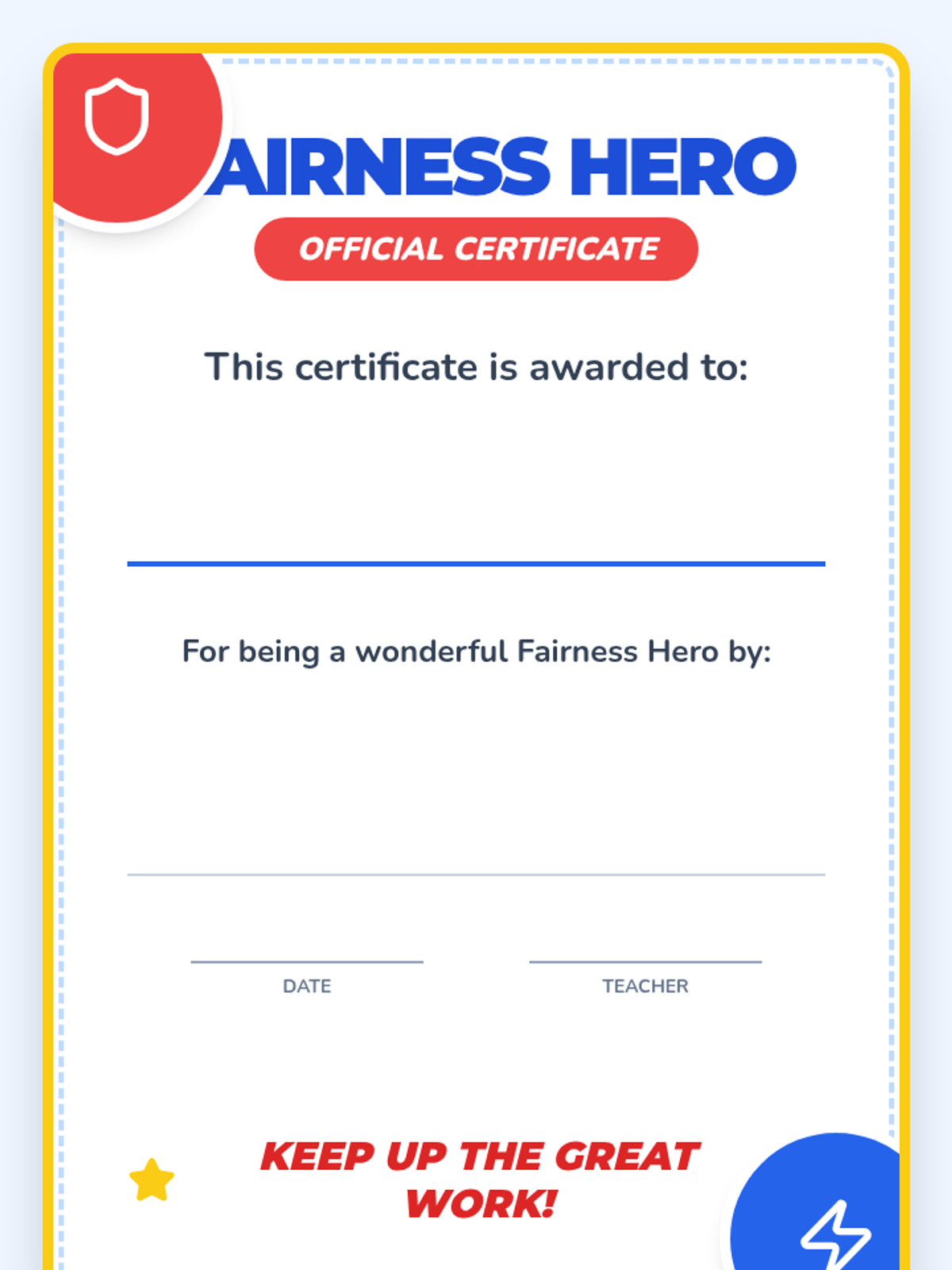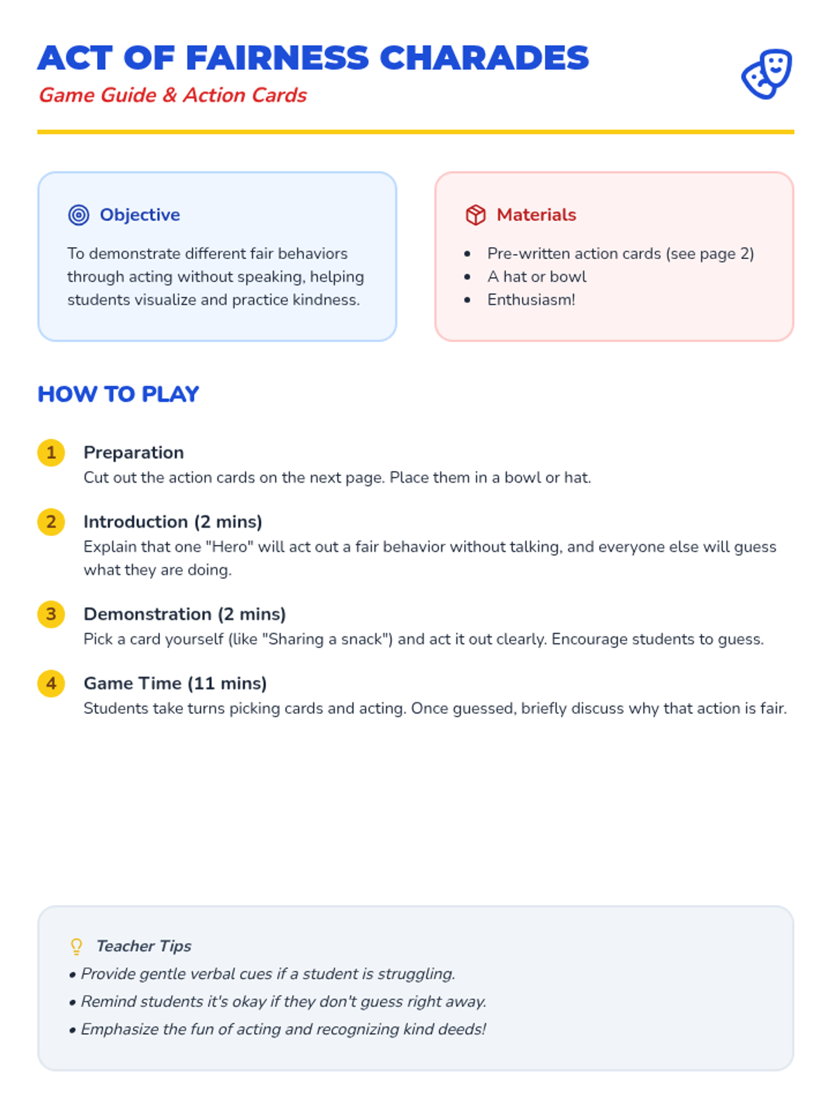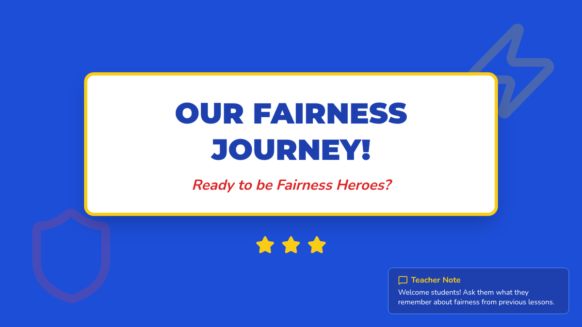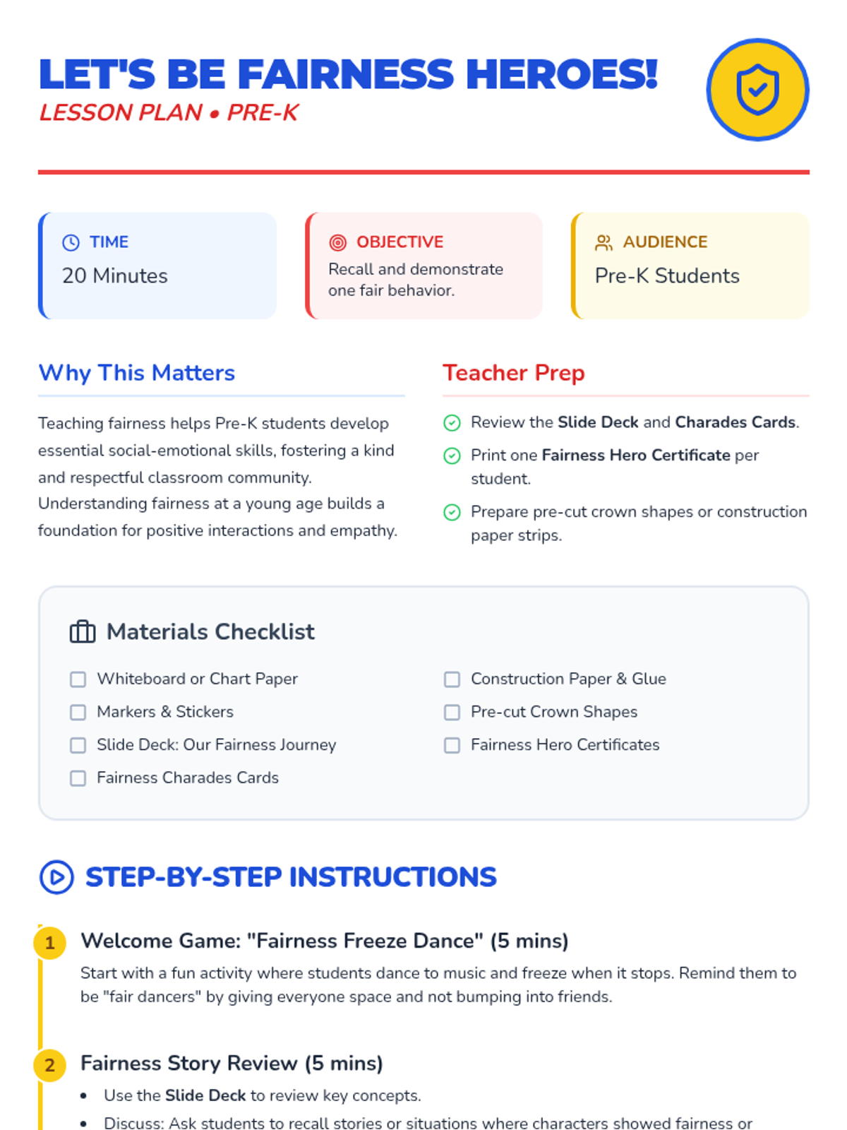 A 20-minute Pre-K lesson focused on identifying and practicing fair behaviors like sharing and taking turns through a superhero-themed interactive experience.
