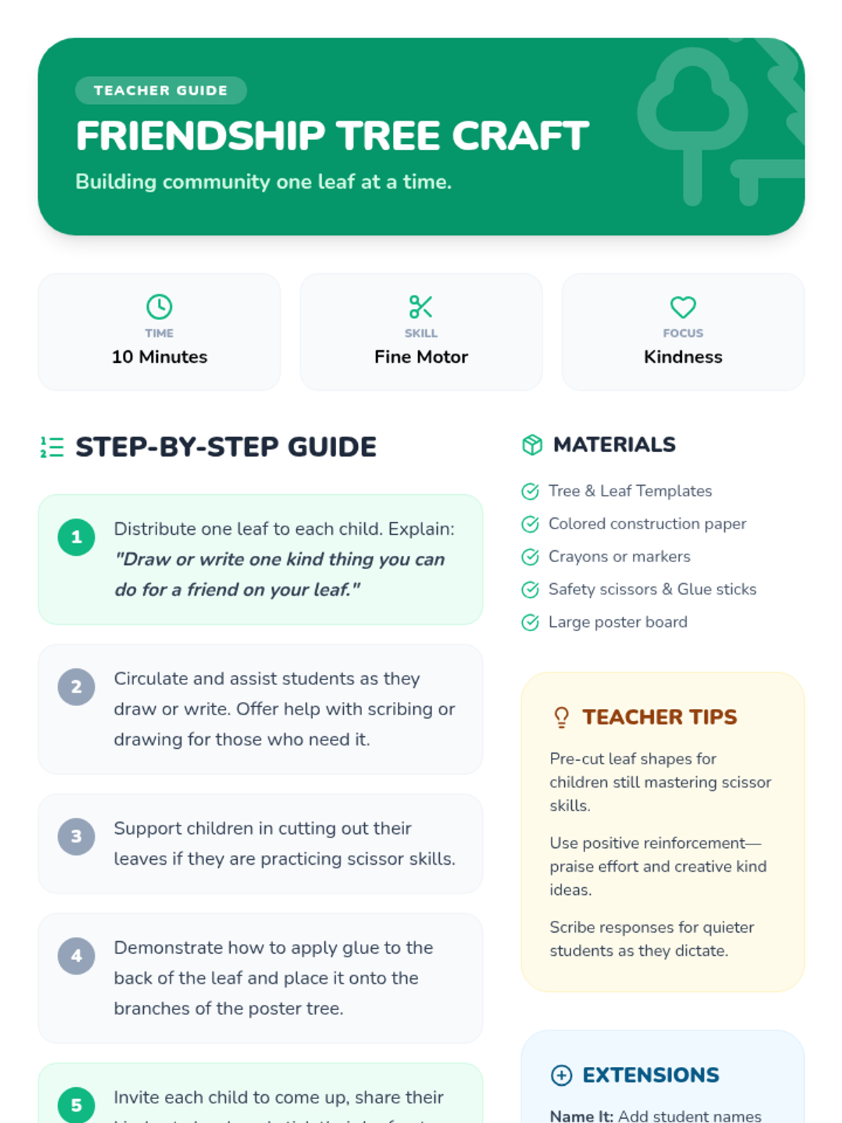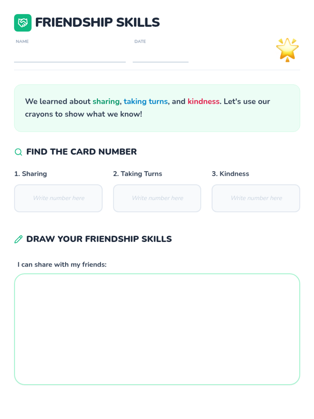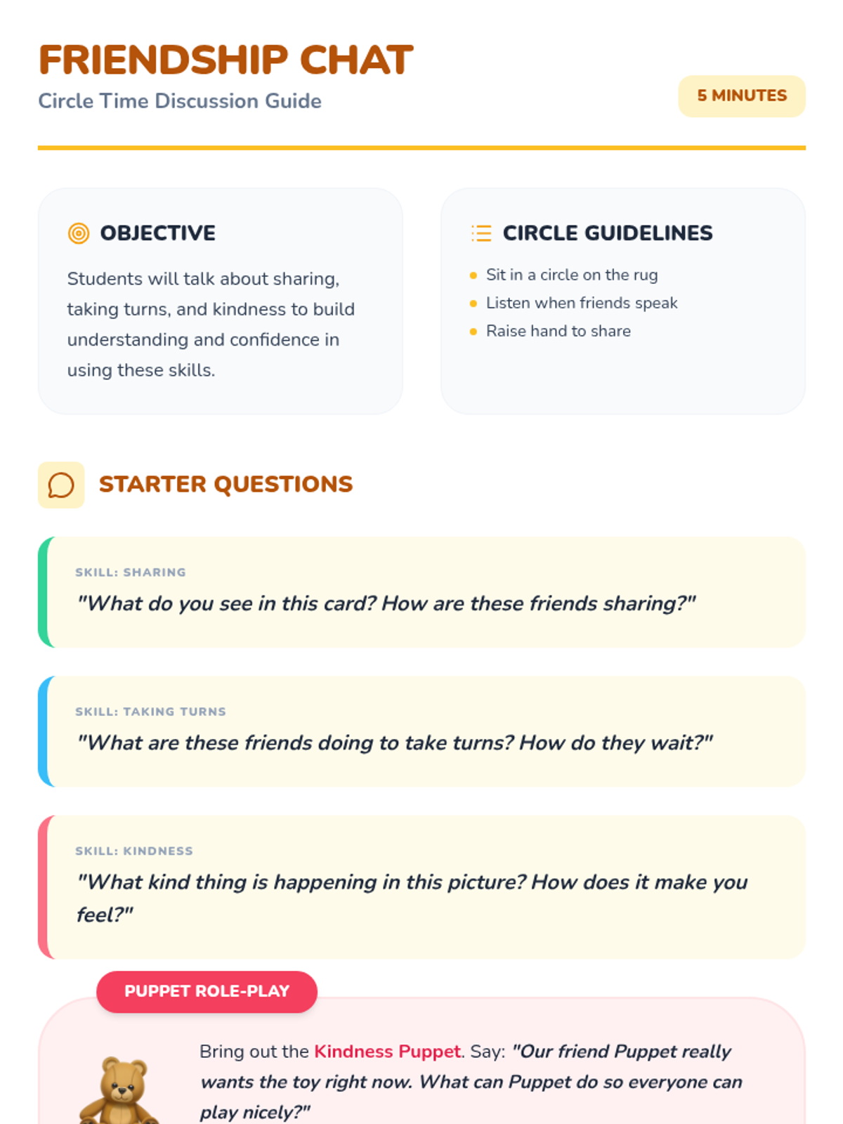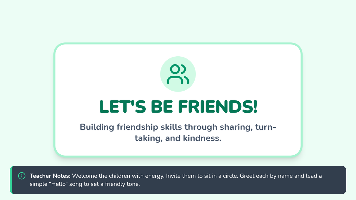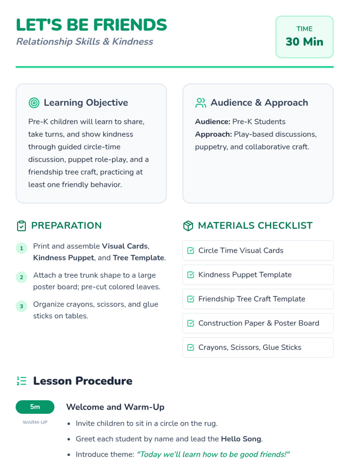A 30-minute Pre-K lesson focused on building relationship skills like sharing, turn-taking, and kindness through circle-time activities, role-play, and a collaborative craft.