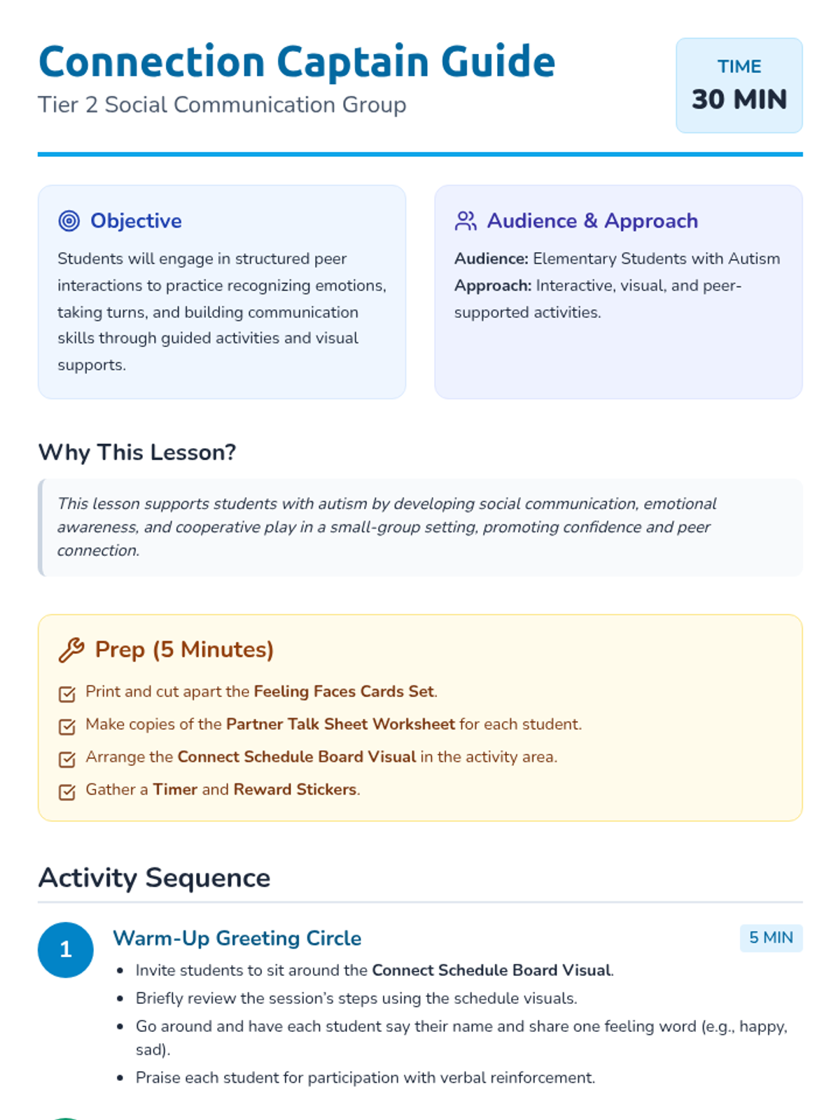 A 30-minute group lesson designed to engage students with autism through structured activities that build communication and social interaction skills. This lesson fosters peer connection, emotional recognition, and turn-taking in a supportive small-group setting.