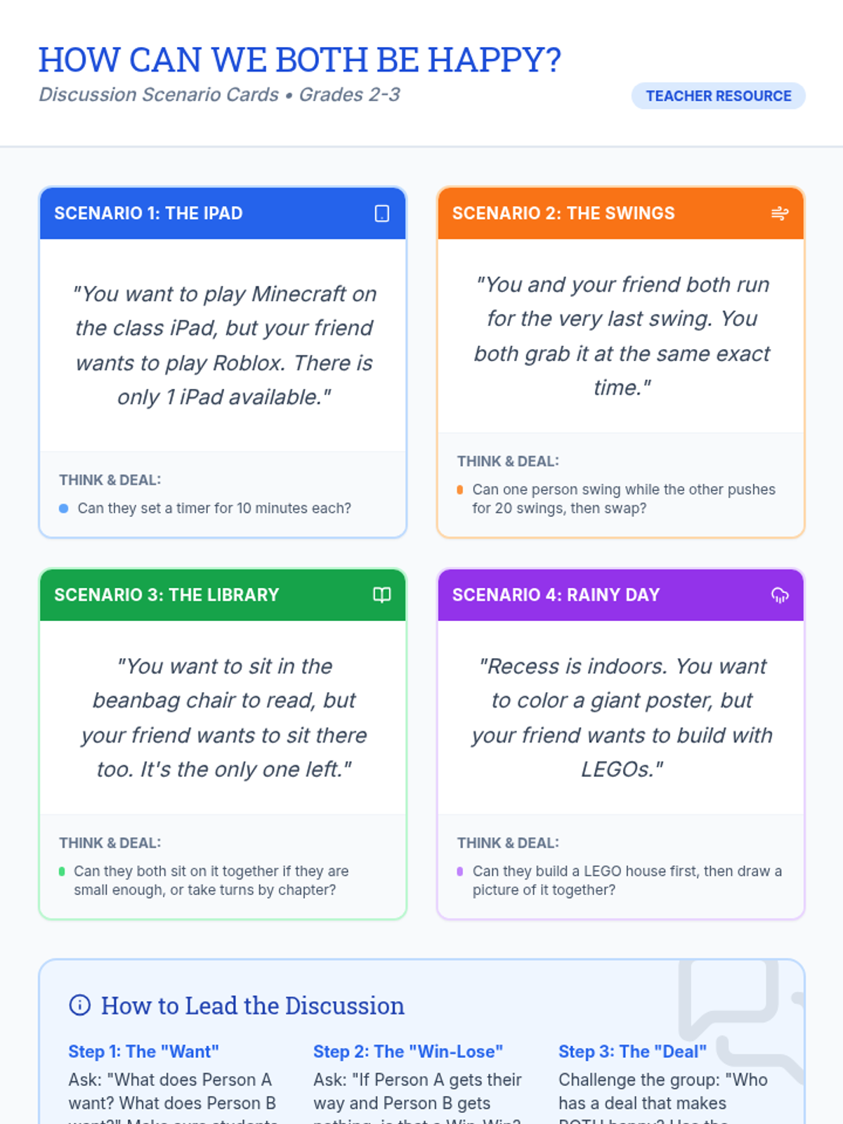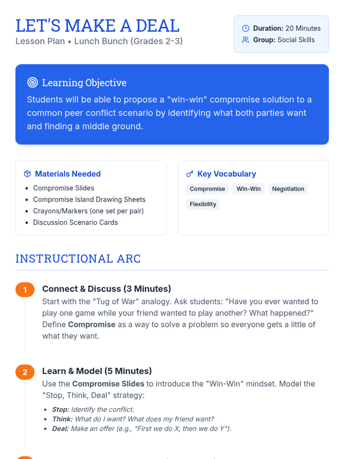 A 20-minute social skills lesson for grades 2-3 focused on finding 'win-win' solutions through compromise and negotiation.