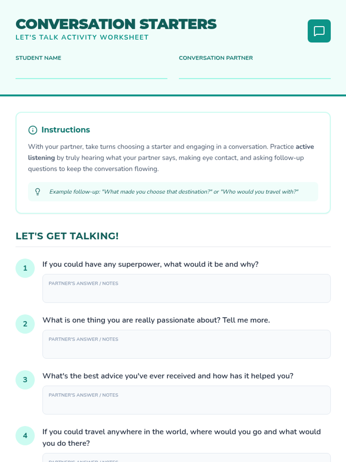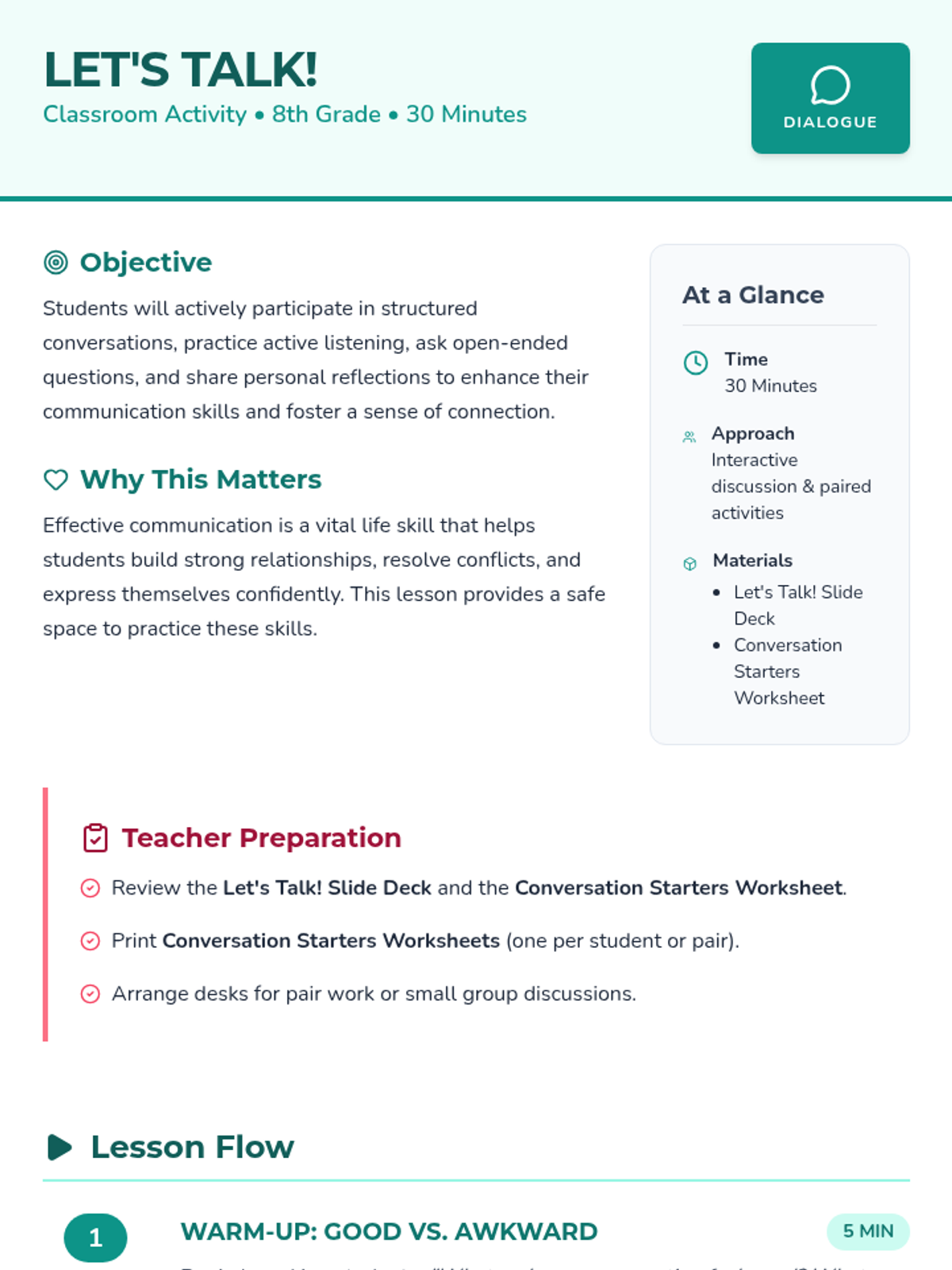 A 30-minute therapeutic classroom activity for 8th graders to develop active listening and conversation skills through structured practice and reflection.