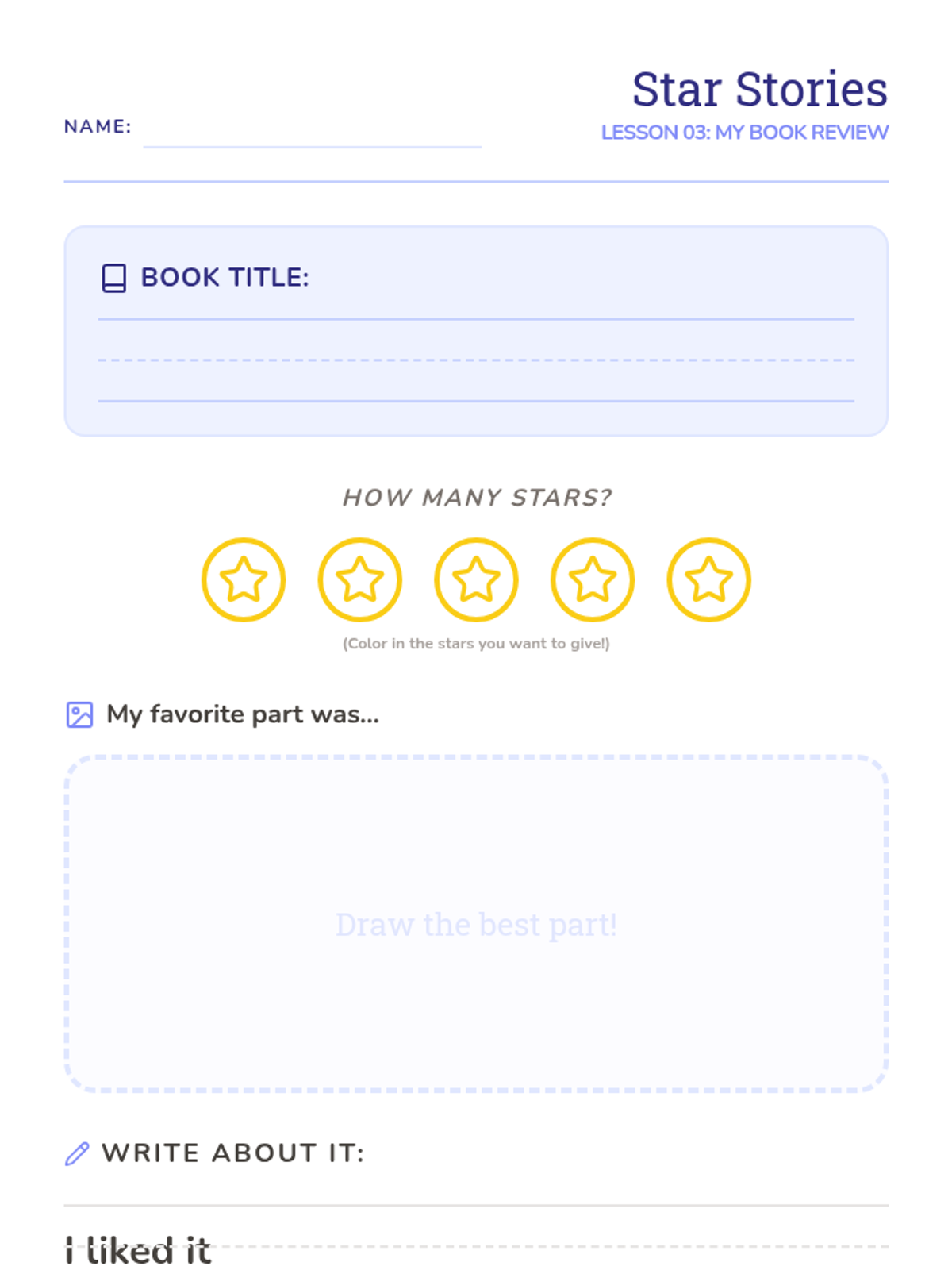 Students apply their opinion writing skills to review a class-read book, providing a rating and a written preference.
