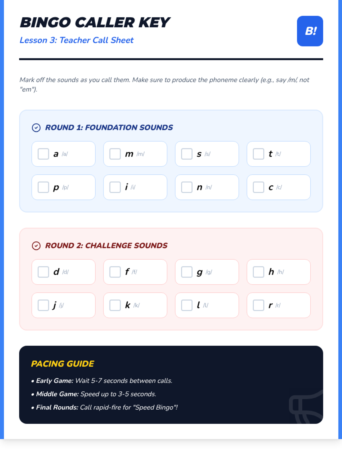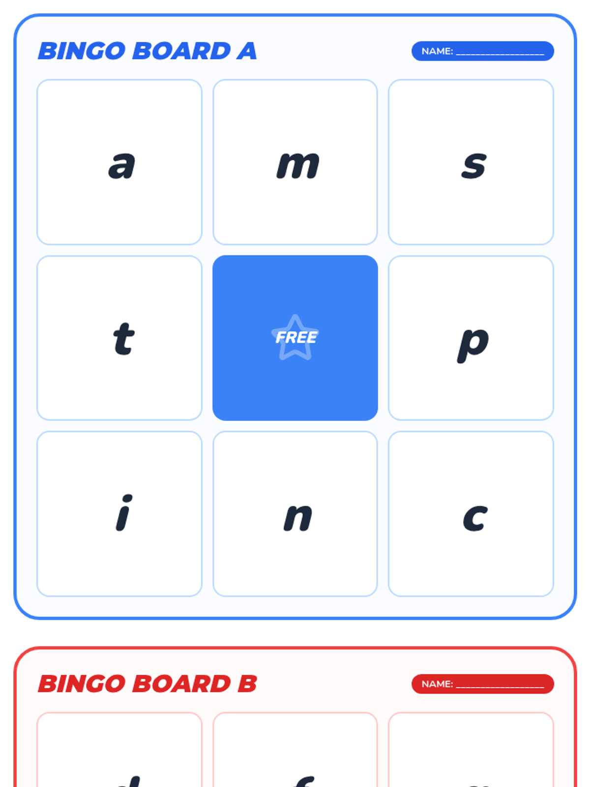 A listening-focused bingo game where students identify and mark lowercase letters on their boards based on the sounds produced by the teacher.