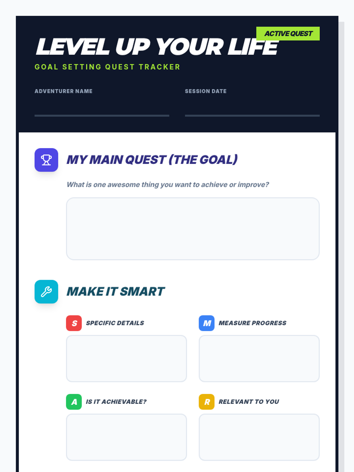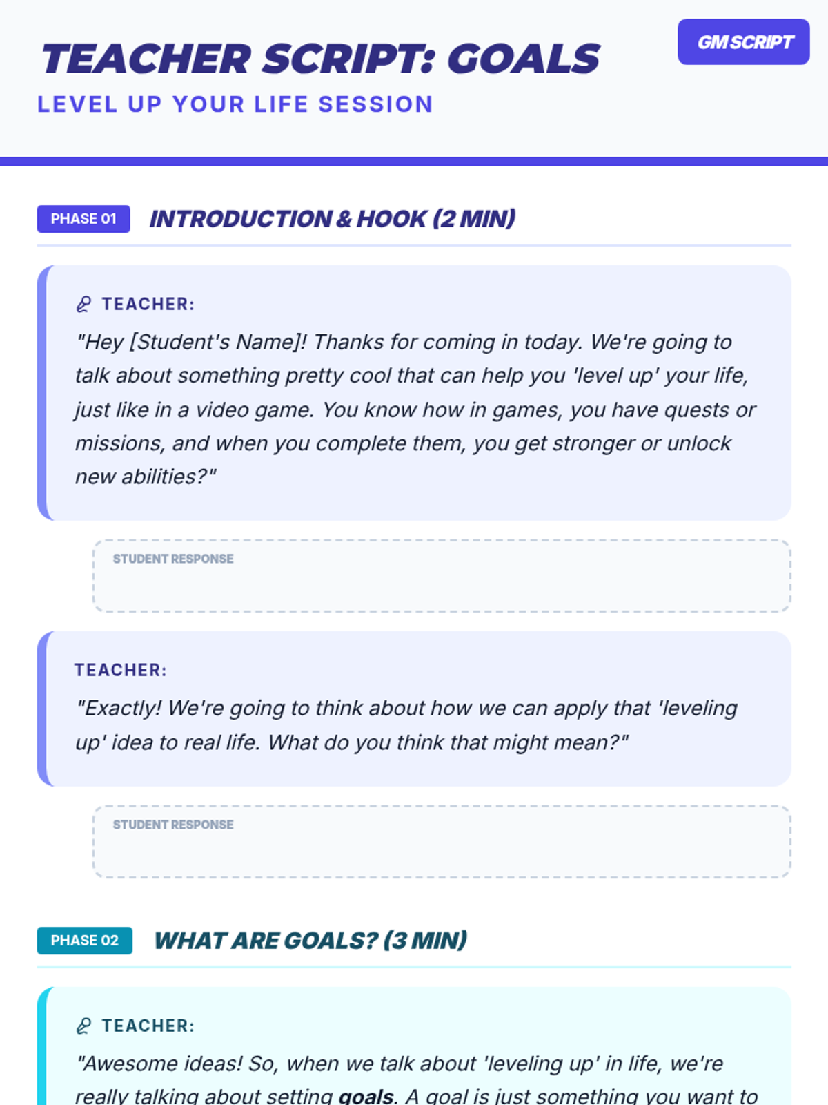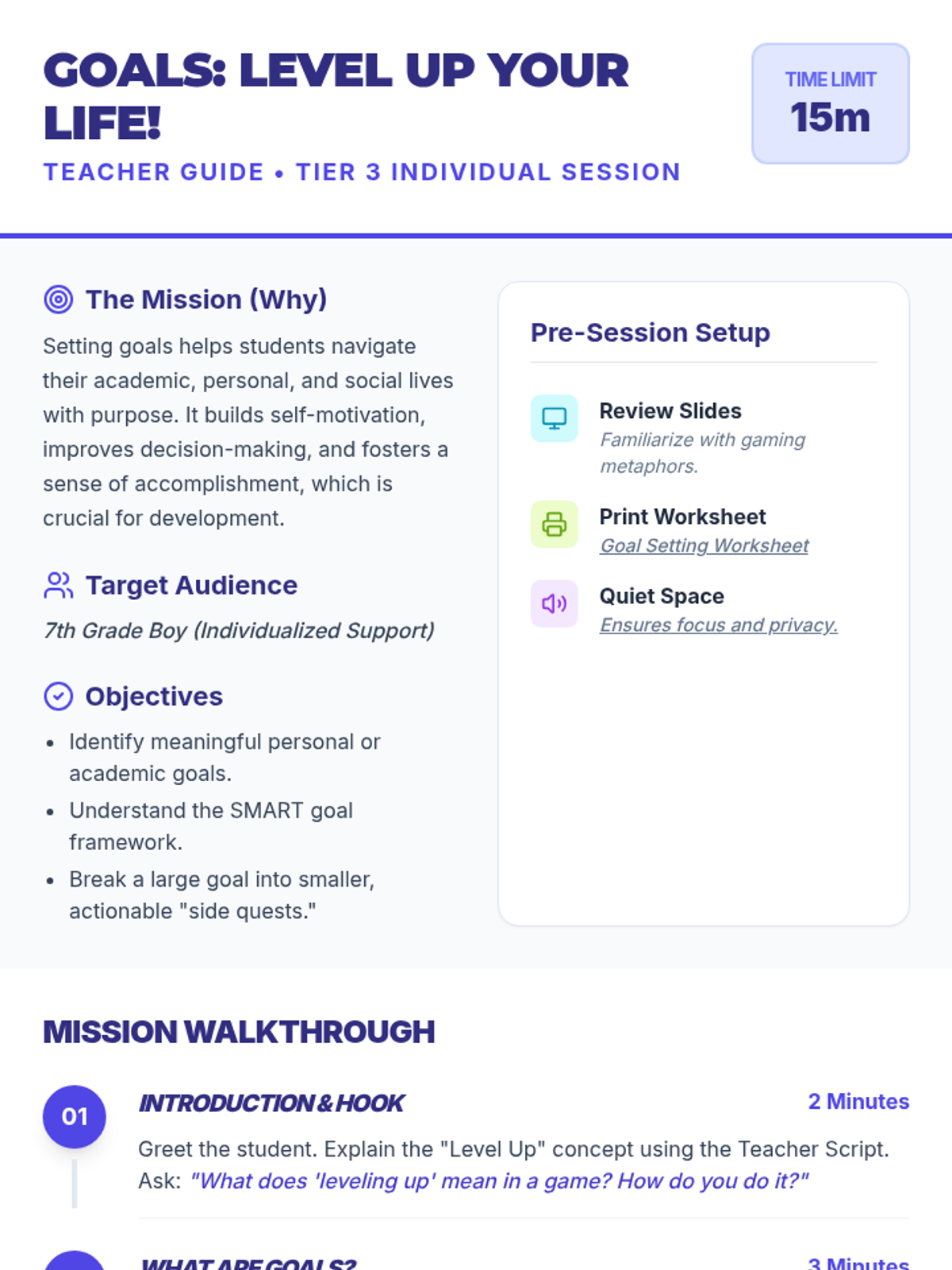 A 15-minute Tier 3 individual session for 7th-grade boys focused on setting SMART goals using a gaming "level up" metaphor. The lesson includes a slide deck, script, and interactive worksheet to help students identify and plan their personal growth quests.