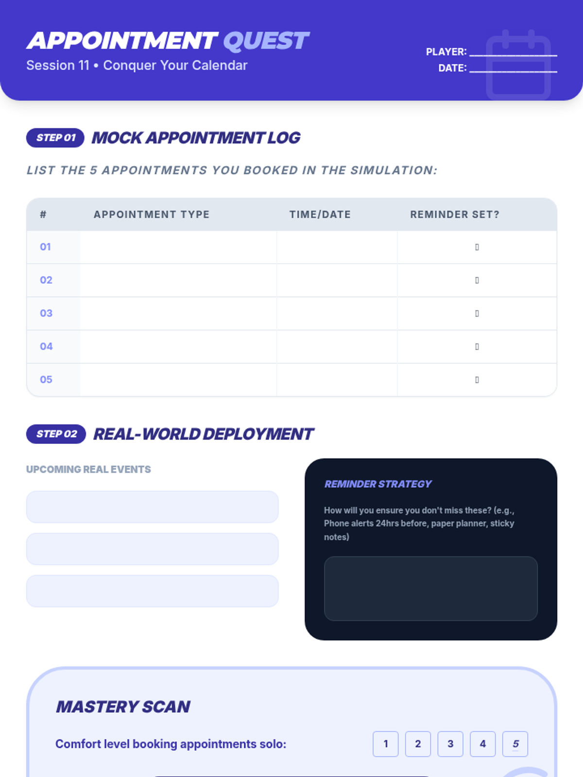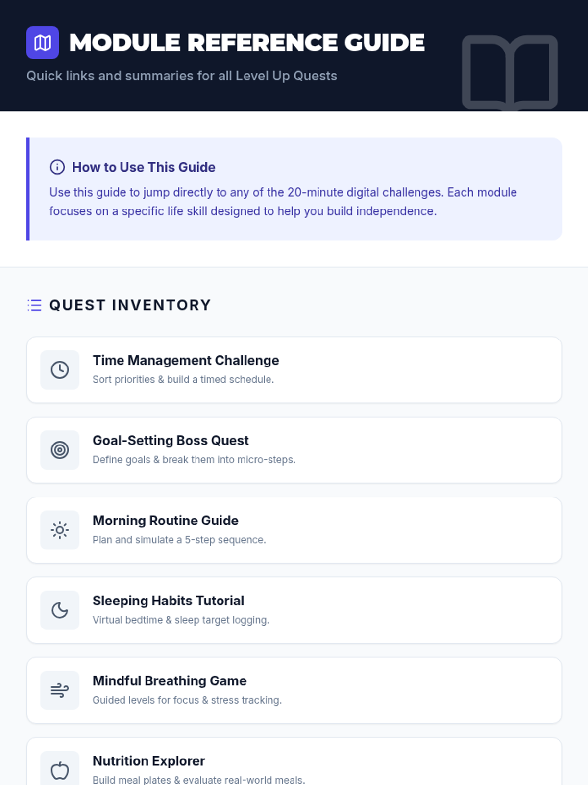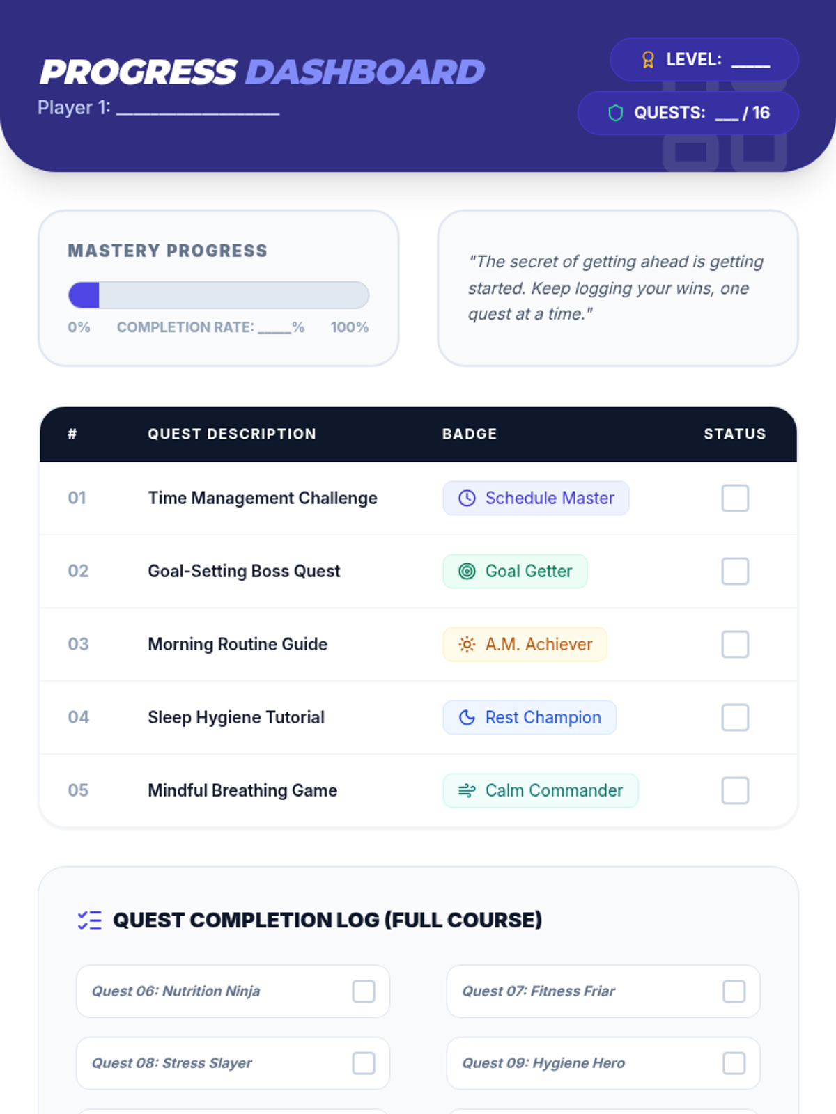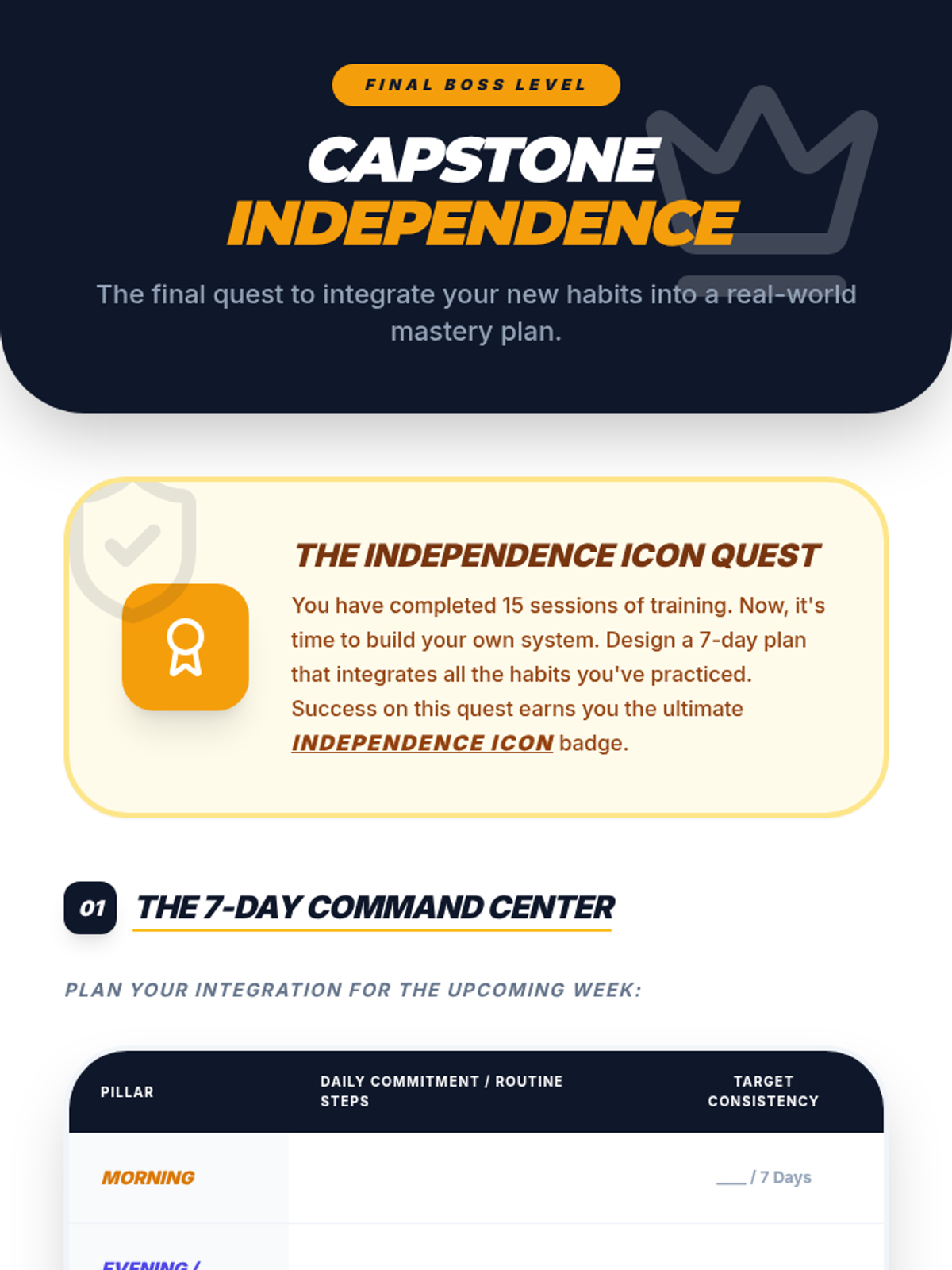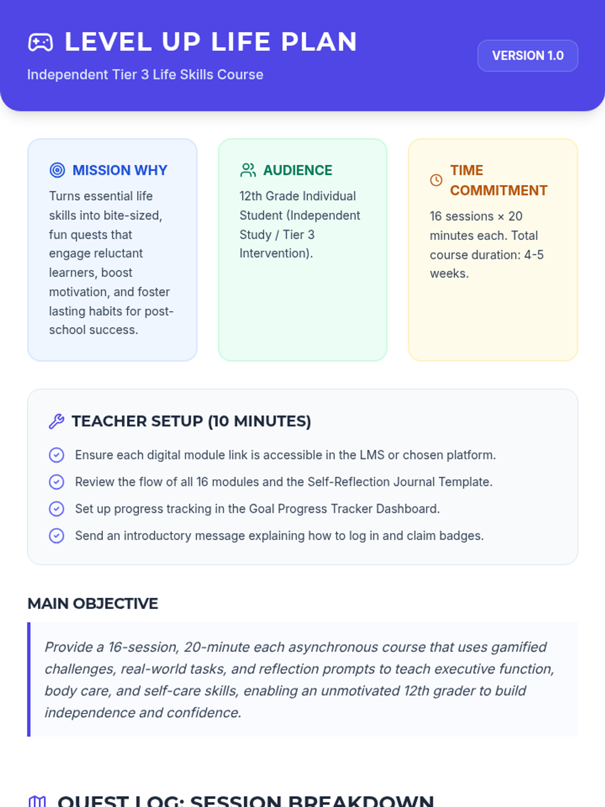 A comprehensive 16-session independent course designed for 12th graders to master executive function and life skills through gamified challenges and reflection.