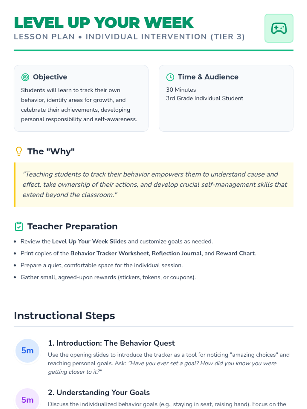 A personalized Tier 3 behavior intervention lesson designed for individual 3rd-grade students to foster self-management and positive habit formation through a 'gaming-style' tracker.