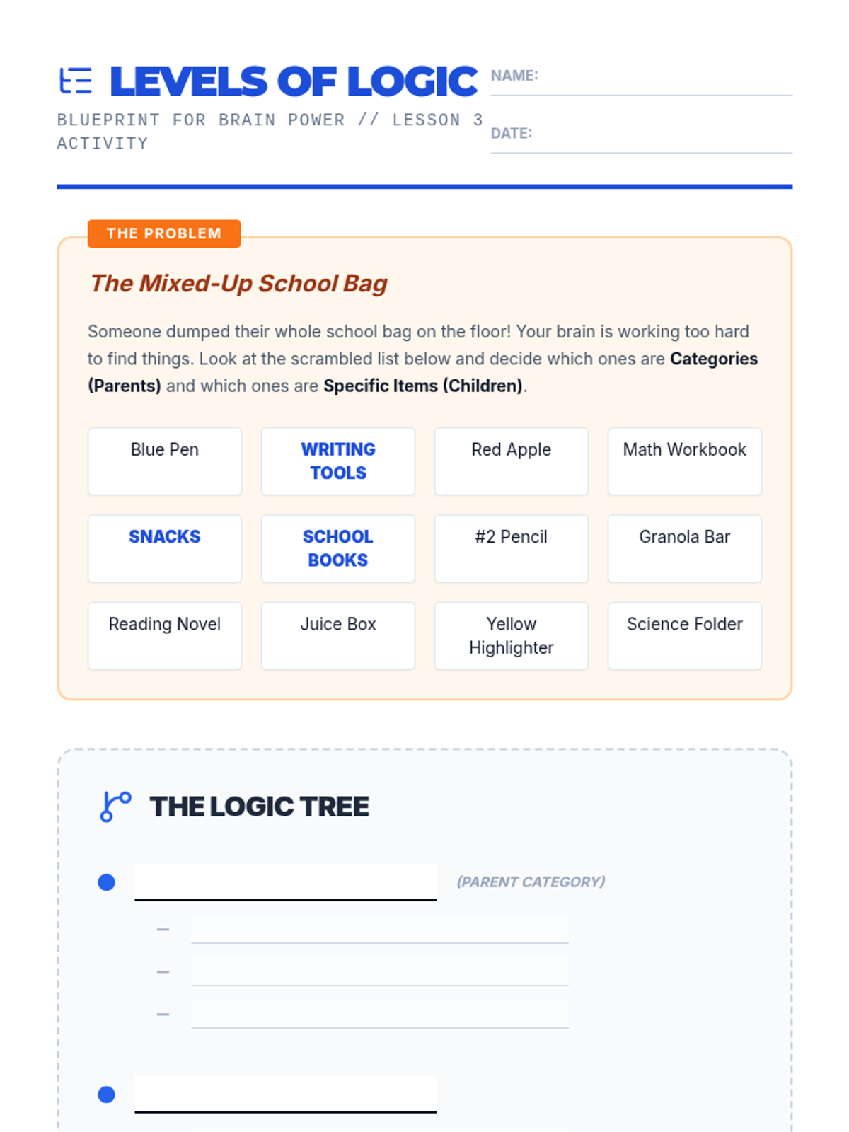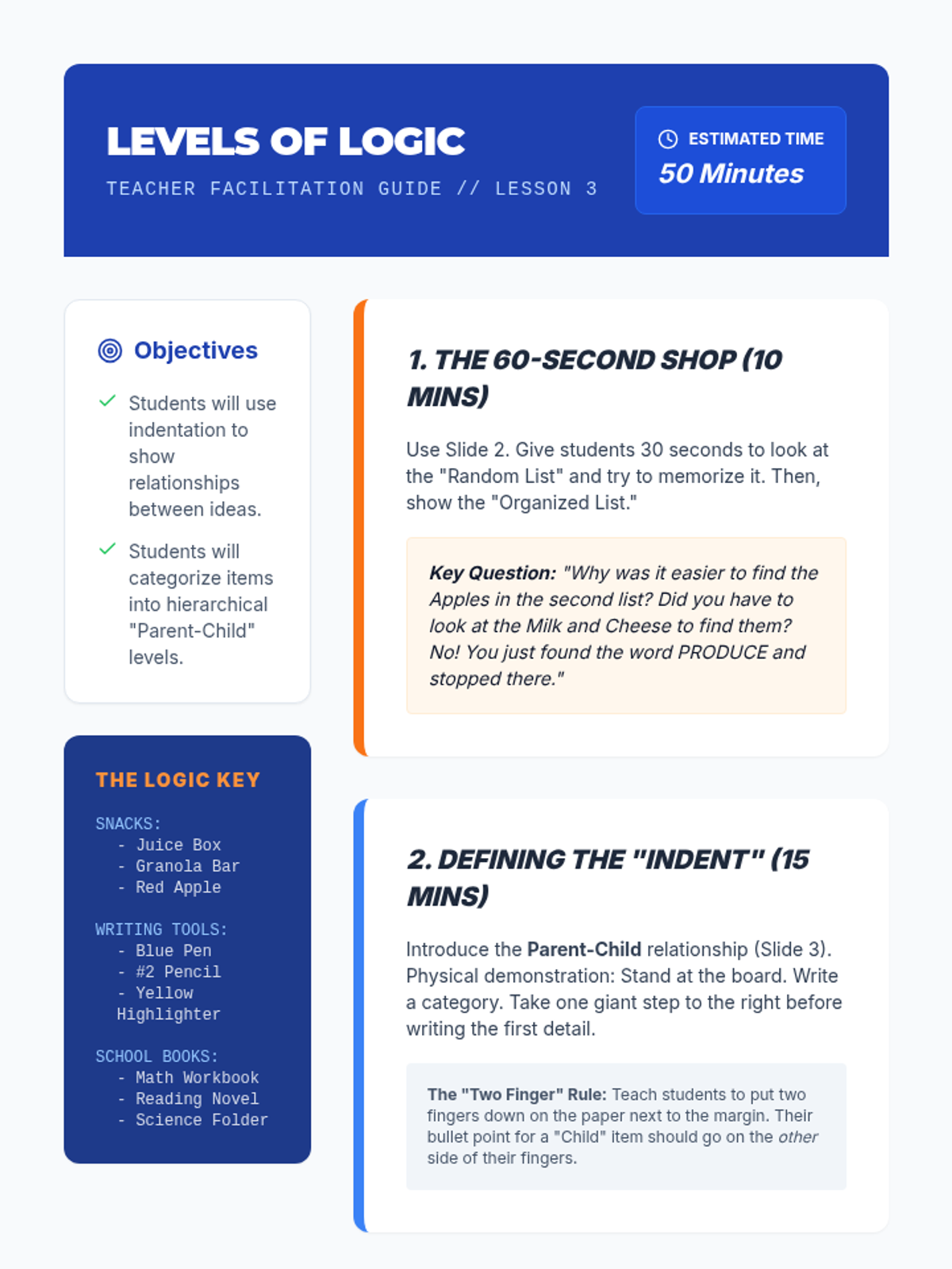 This lesson teaches the hierarchy of information using bullets and indentation. Students practice organizing mixed-up sentences into a logical parent-child structure to visualize relationships between ideas.
