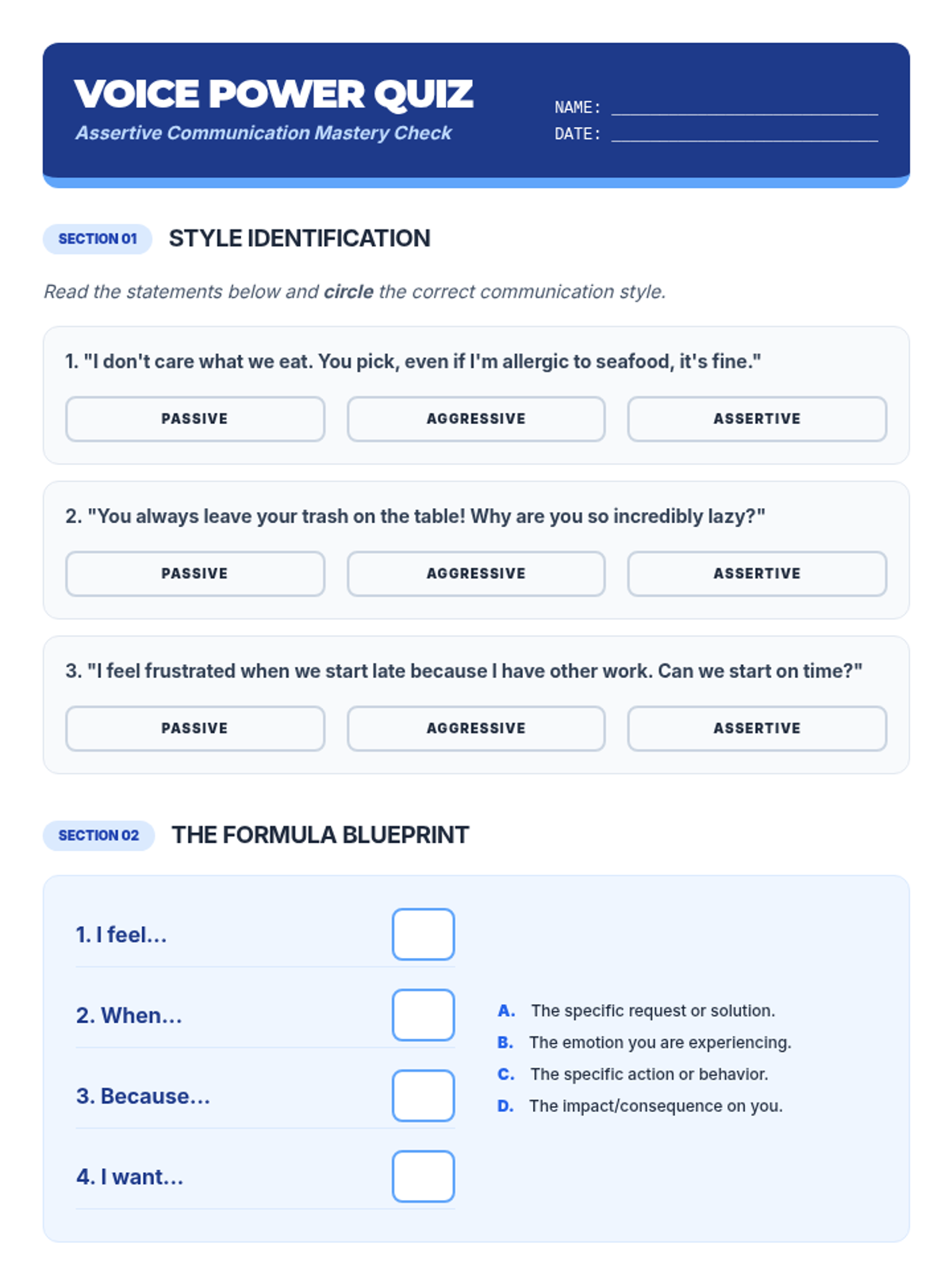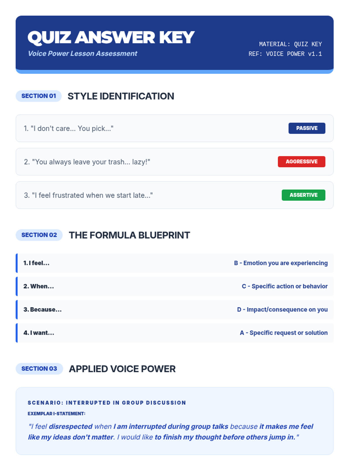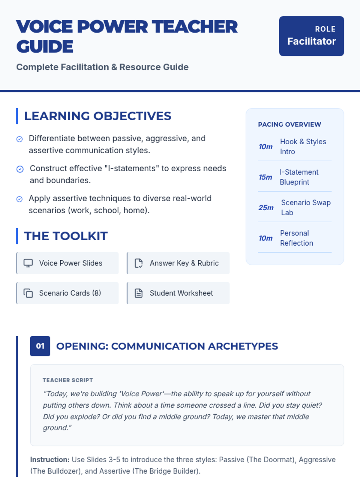A high-energy lesson on assertive communication for high schoolers, focusing on the 'I-statement' framework and distinguishing between passive, aggressive, and assertive styles. Students will analyze scenarios across social, academic, and professional settings.