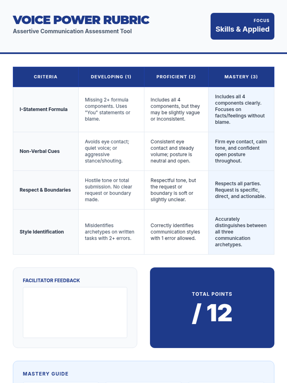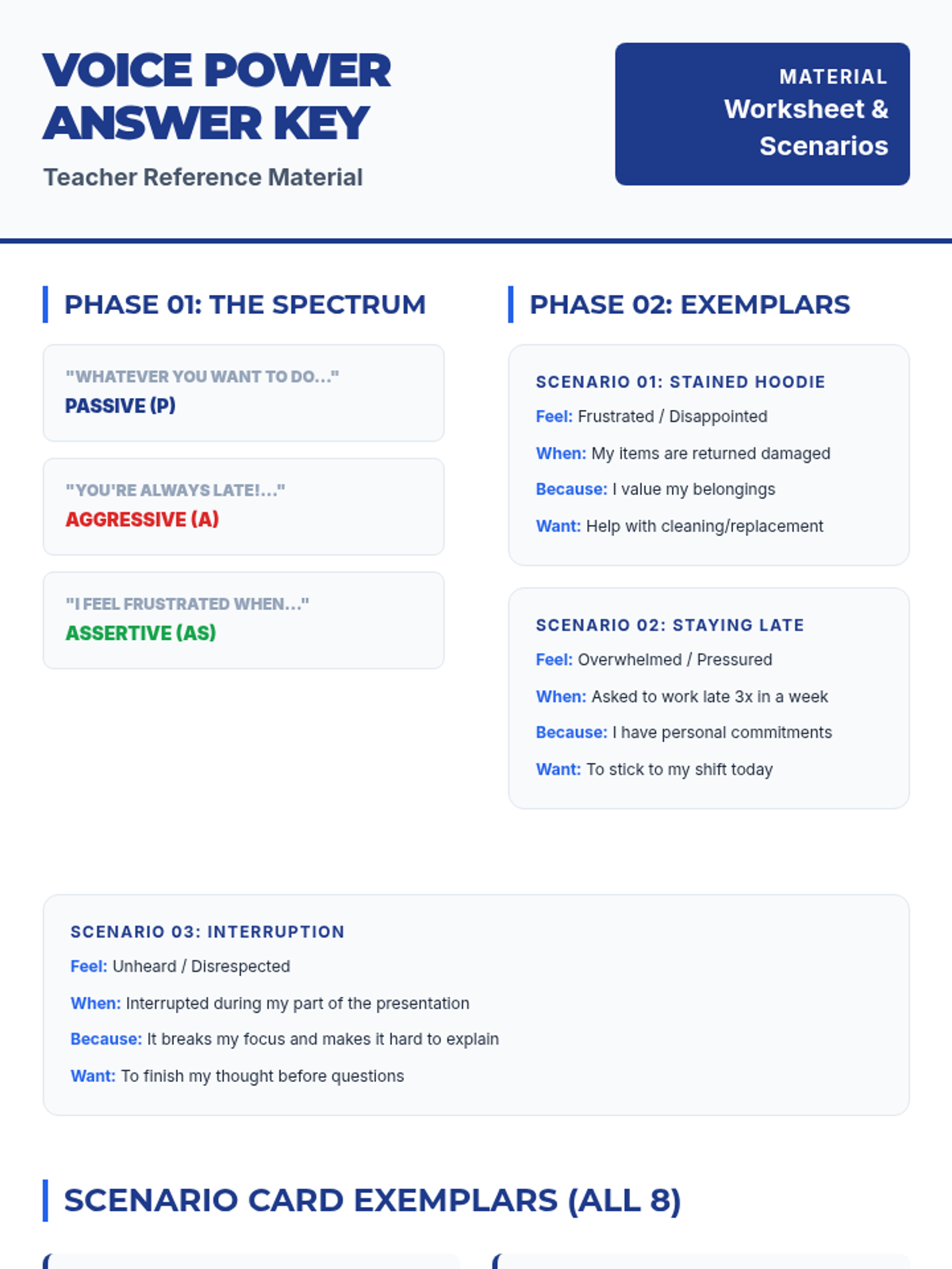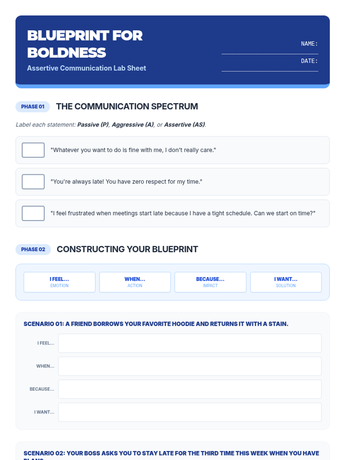 A high-energy lesson on assertive communication for high schoolers, focusing on the 'I-statement' framework and distinguishing between passive, aggressive, and assertive styles. Students will analyze scenarios across social, academic, and professional settings.