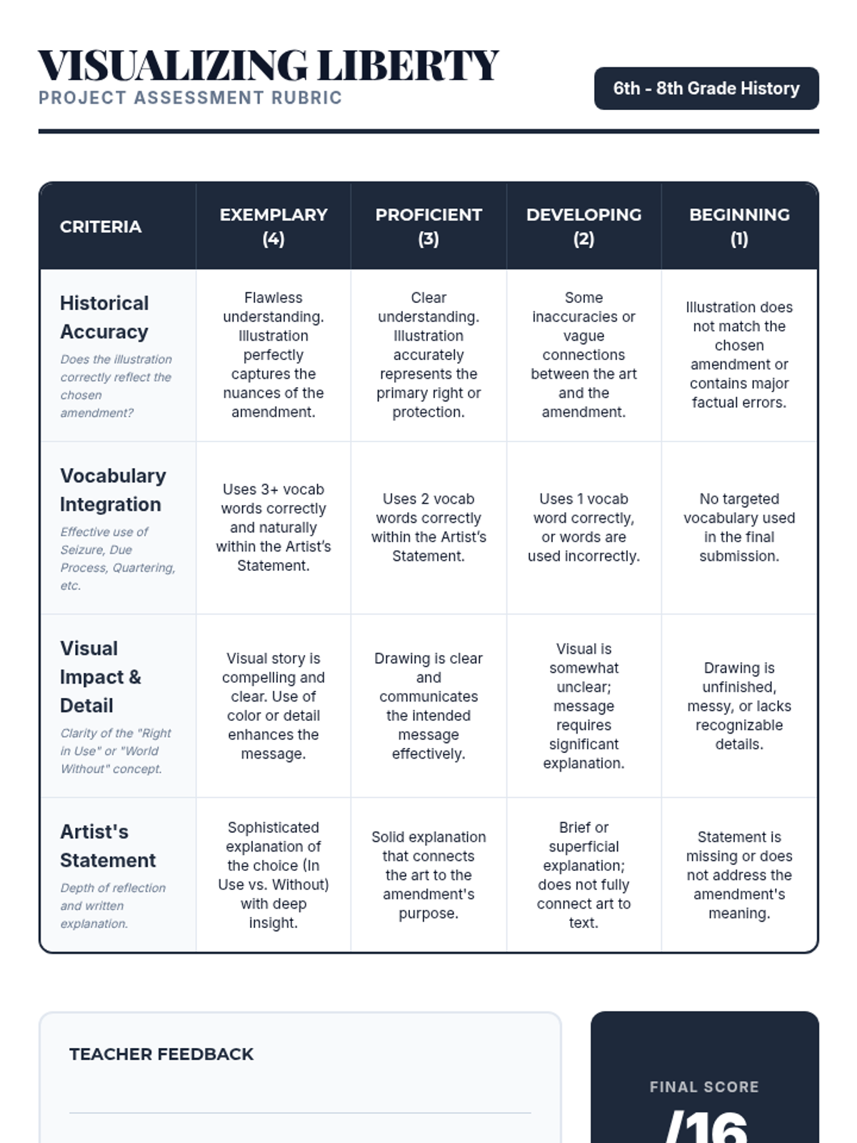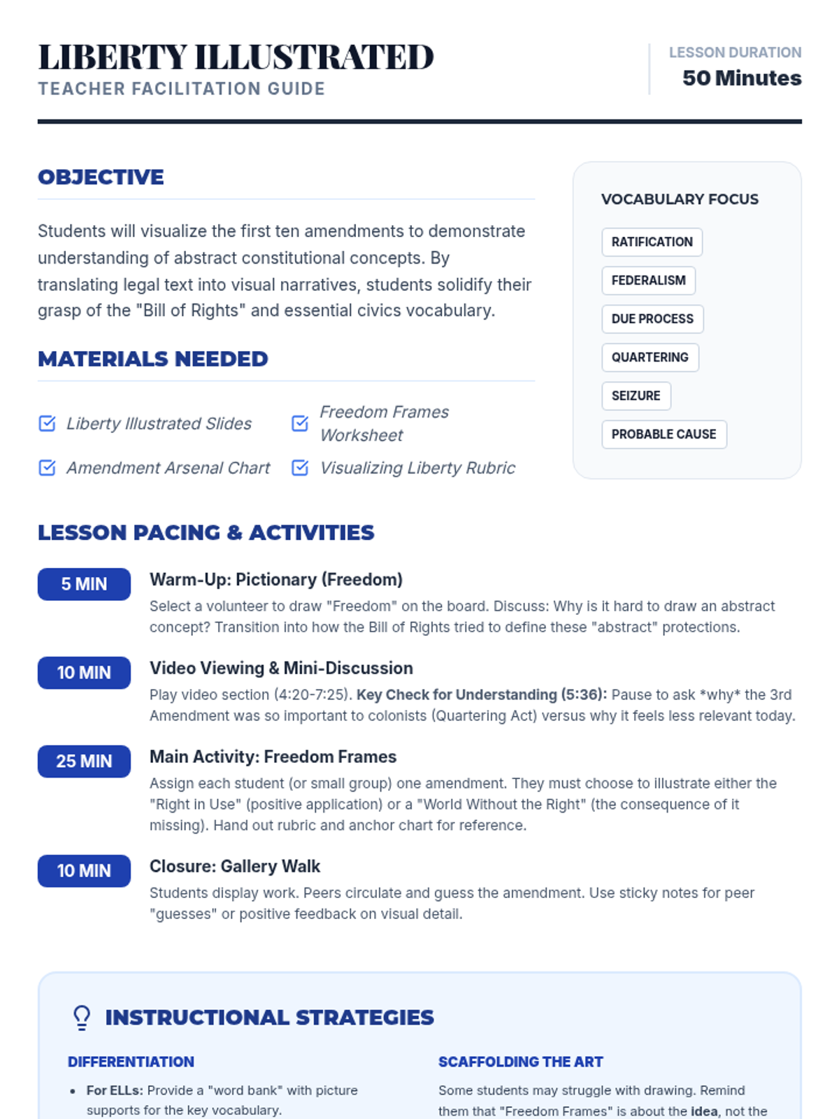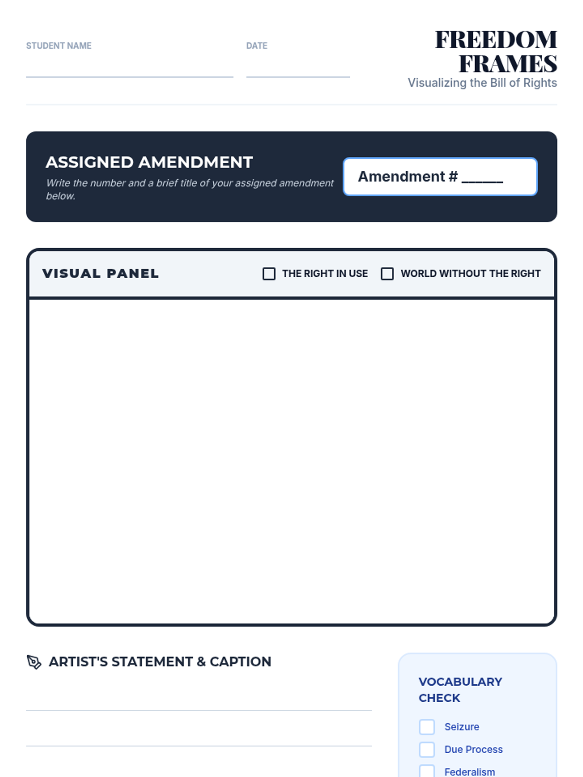 Students will visualize the Bill of Rights by creating comic-style panels that depict the application or absence of specific amendments, using key vocabulary from a provided video breakdown.