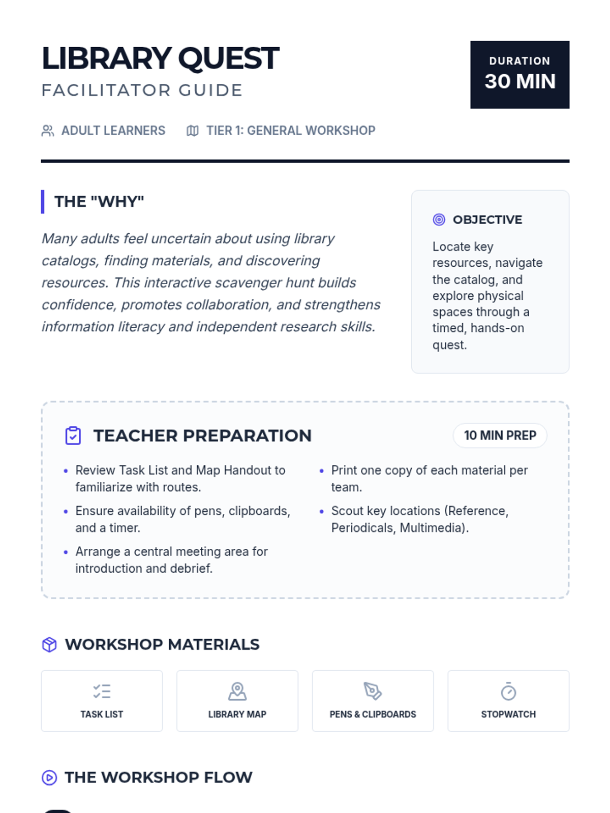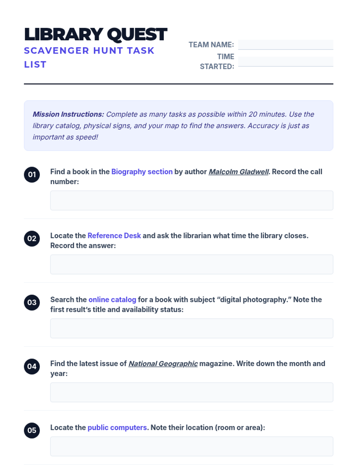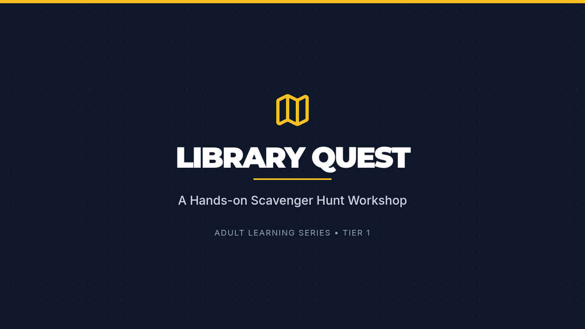 A 30-minute hands-on workshop for adult learners to build confidence in navigating library catalogs, physical collections, and digital resources through a collaborative scavenger hunt.