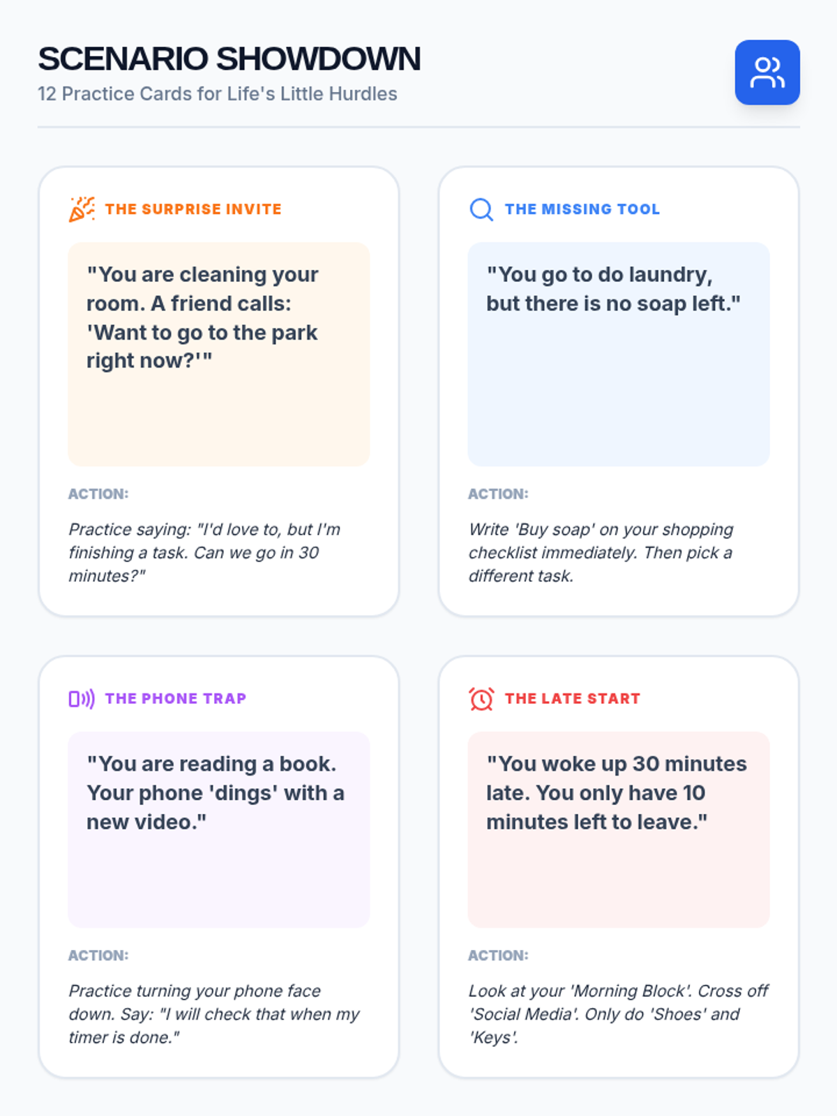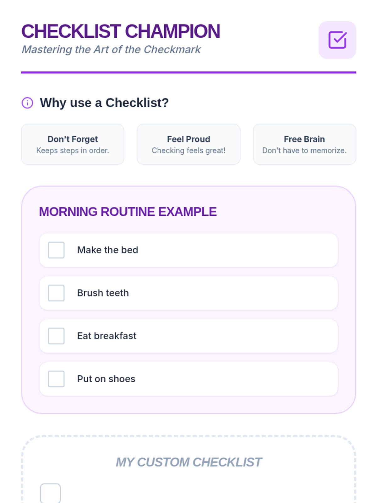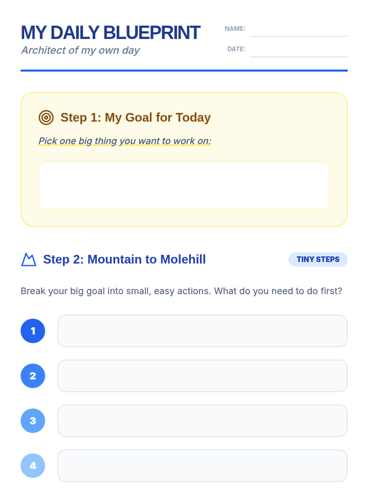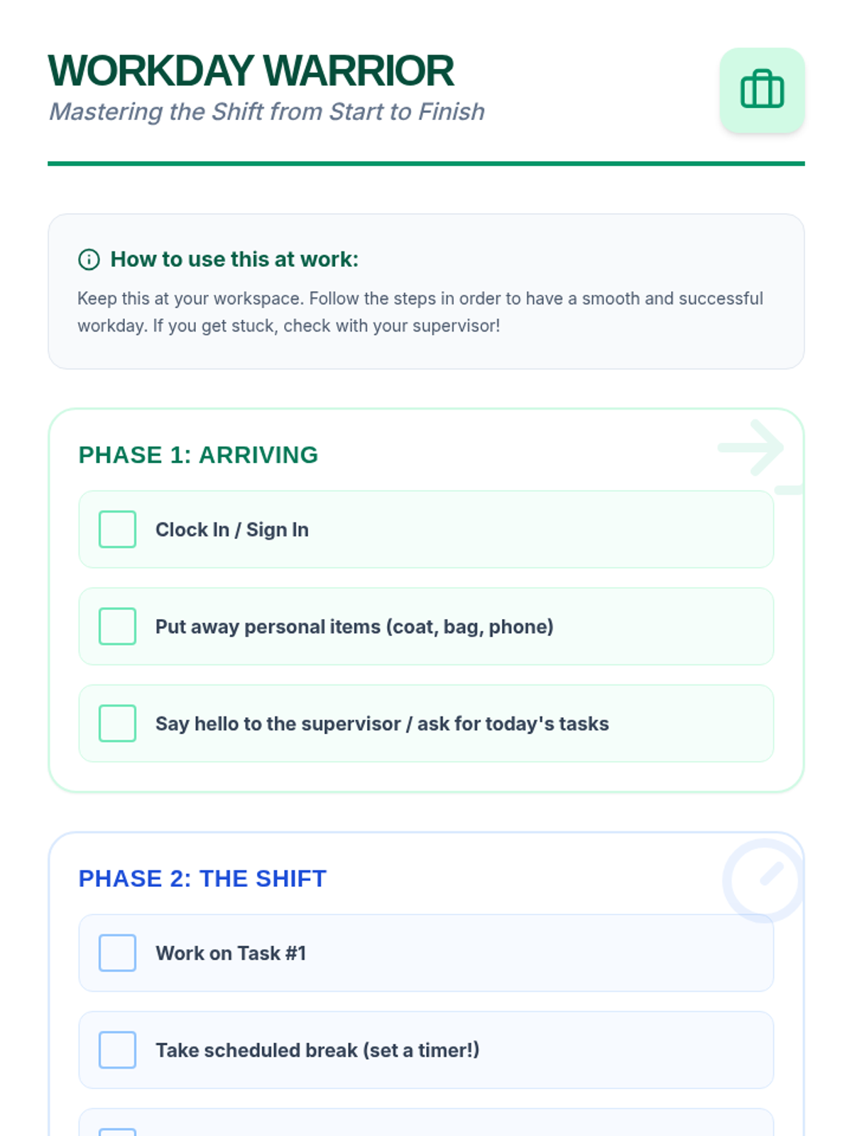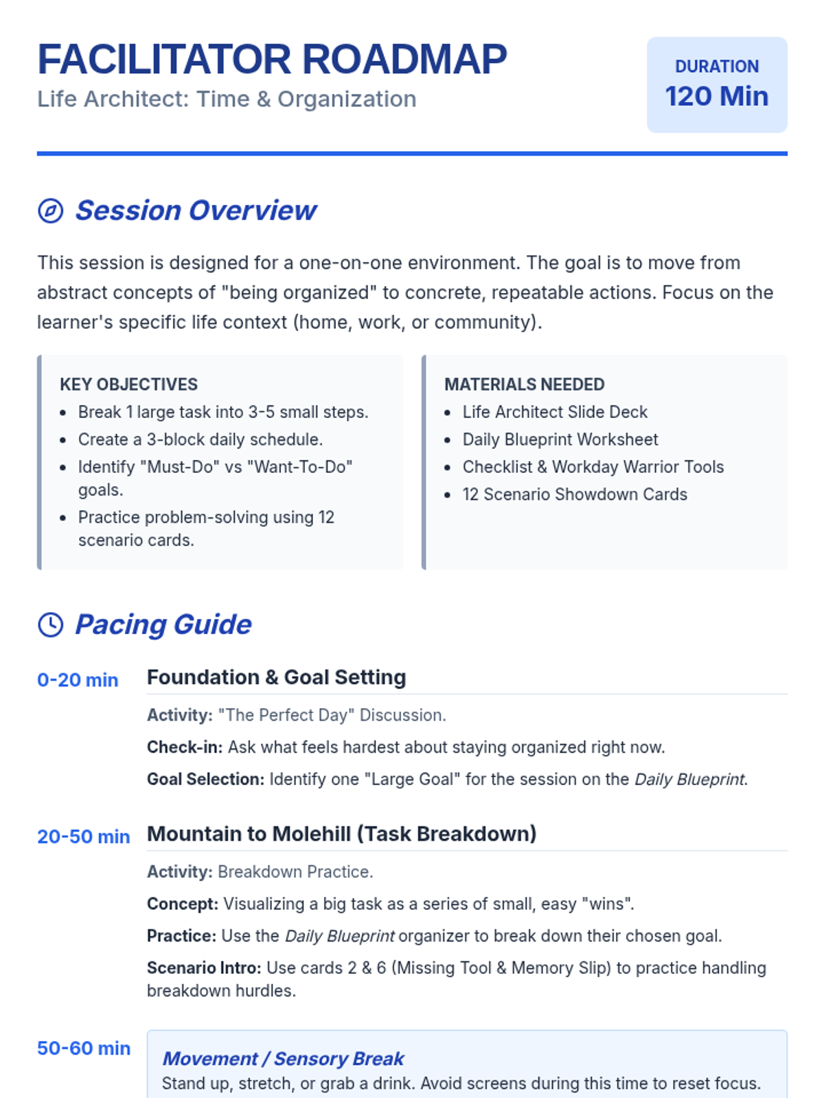 A comprehensive one-on-one session for adults focusing on task breakdown, scheduling, checklists, and goal setting through interactive activities and visual organizers.
