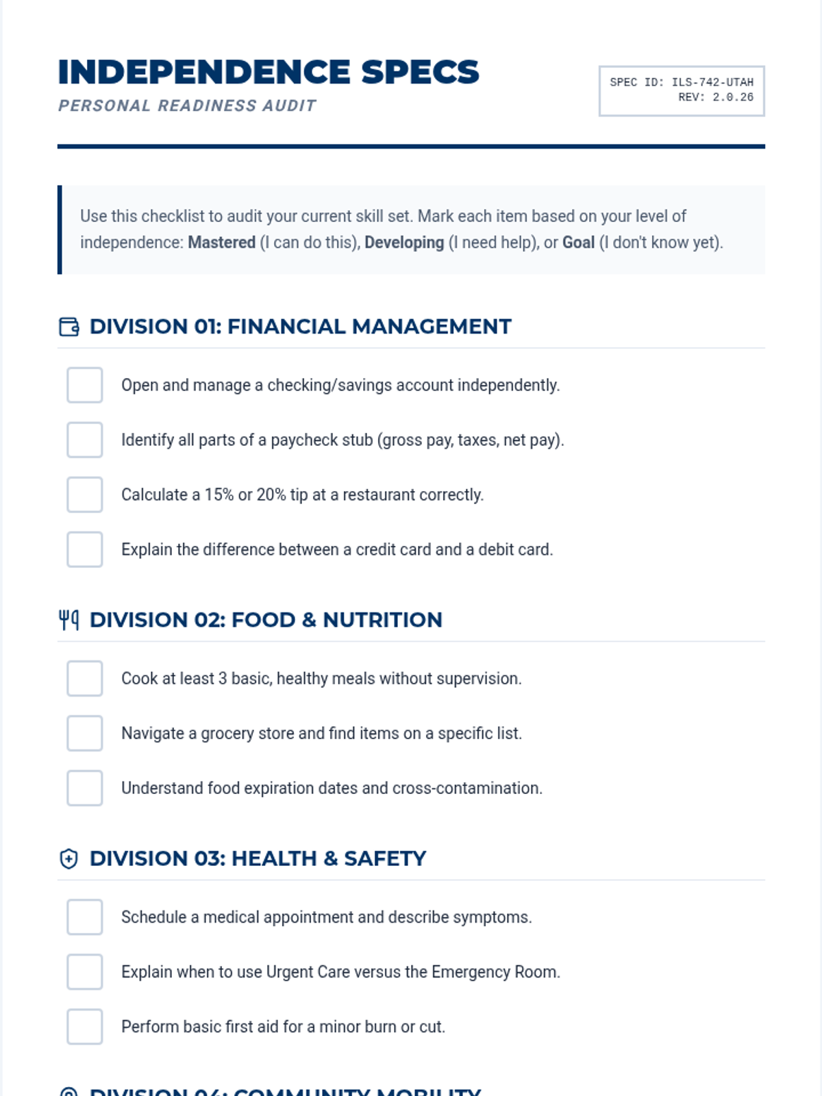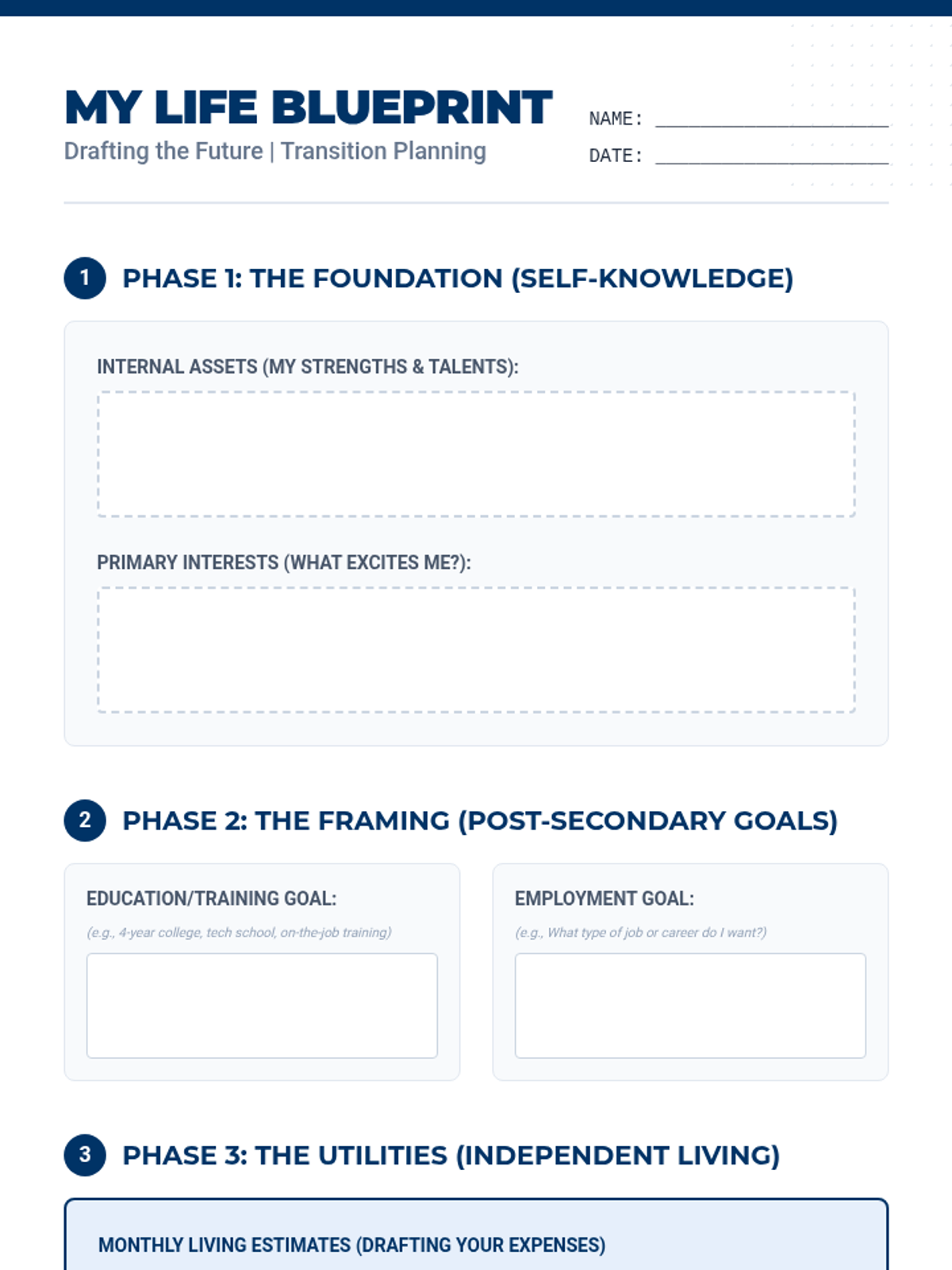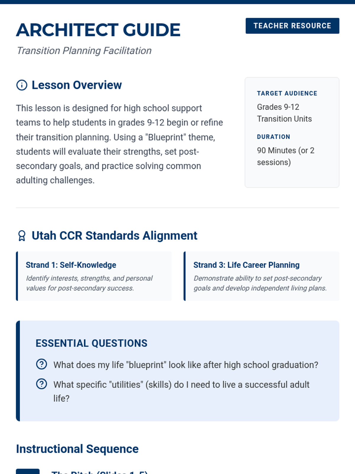 A comprehensive transition planning lesson for high school students focused on post-secondary goals and independent living skills, aligned with Utah College and Career Readiness standards.