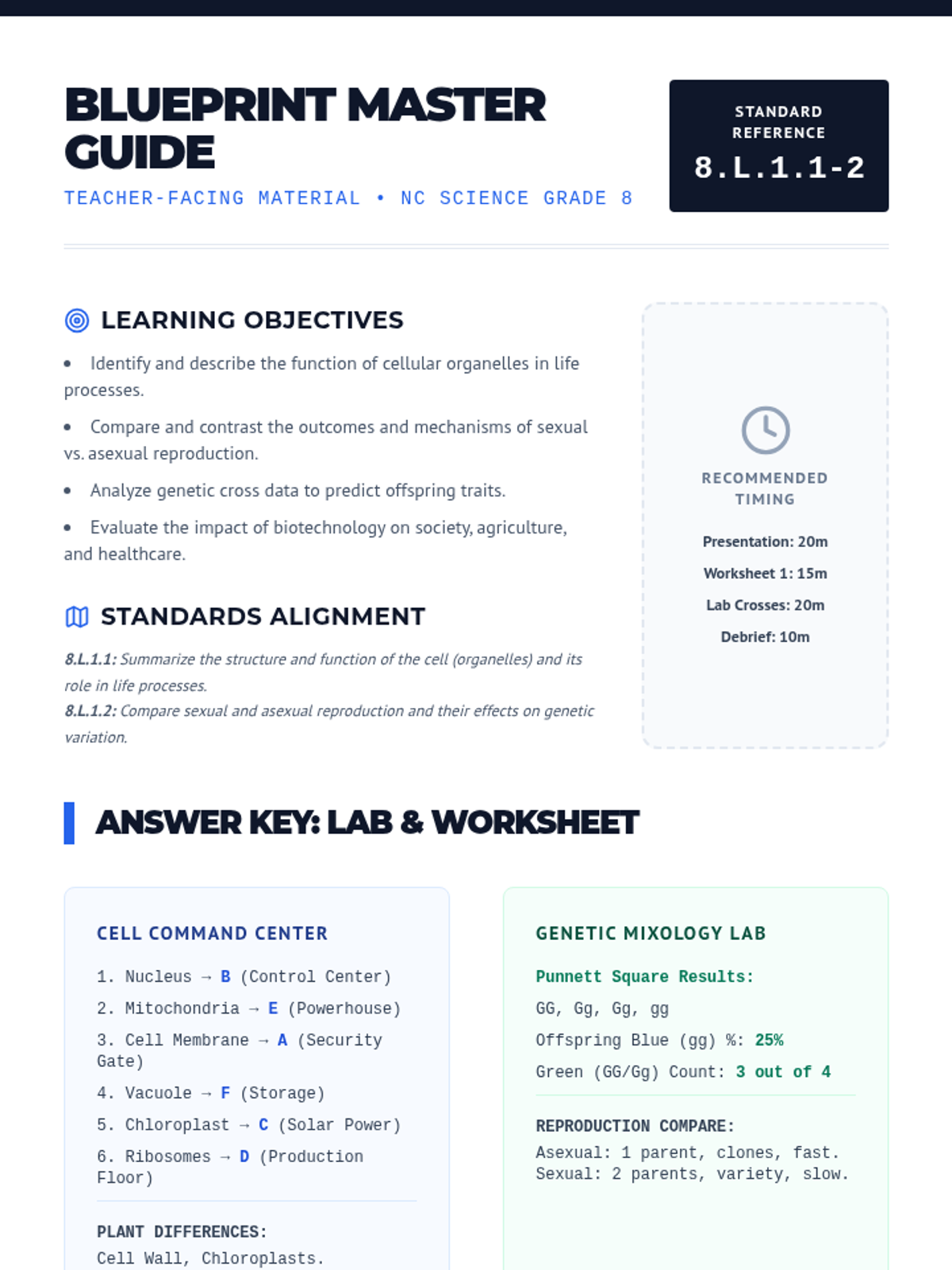 This lesson explores the fundamental structures of life, the mechanisms of reproduction, and the modern impacts of biotechnology on society and health, aligned with NC Essential Standard 8.L.1.