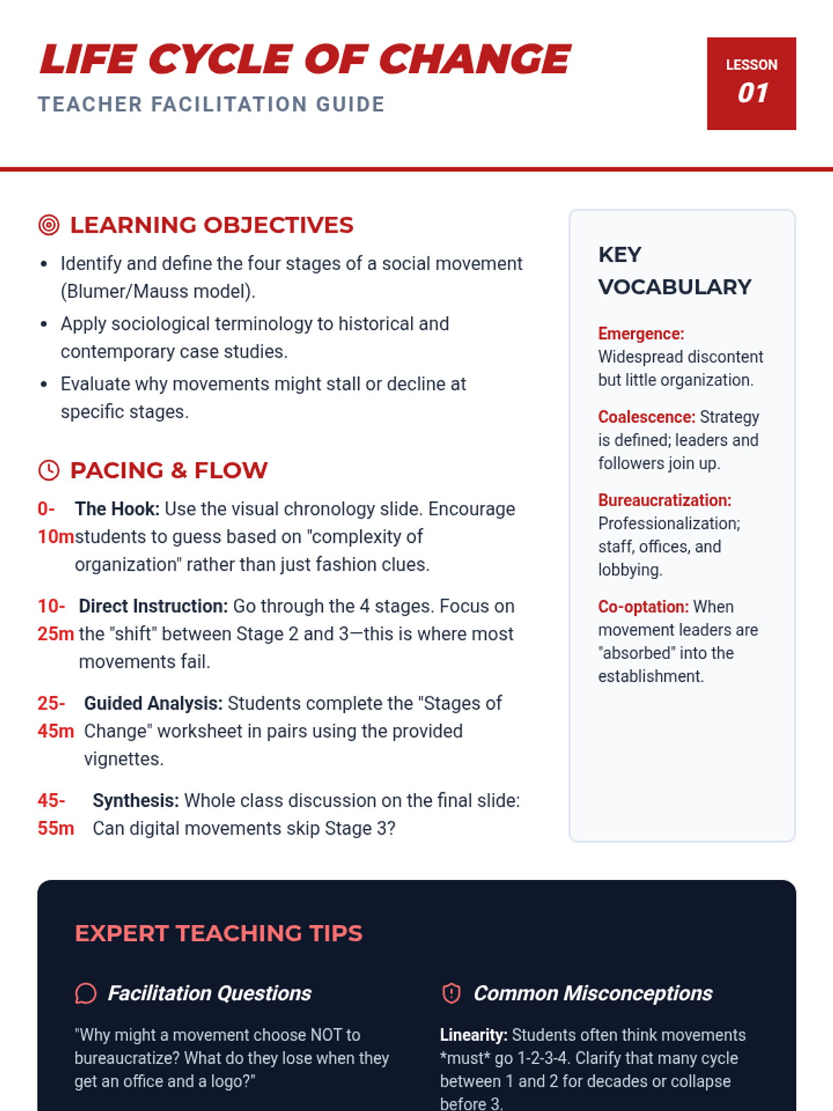 Introduces the theoretical stages of social movements: emergence, coalescence, bureaucratization, and decline, using historical vignettes to apply sociological concepts.