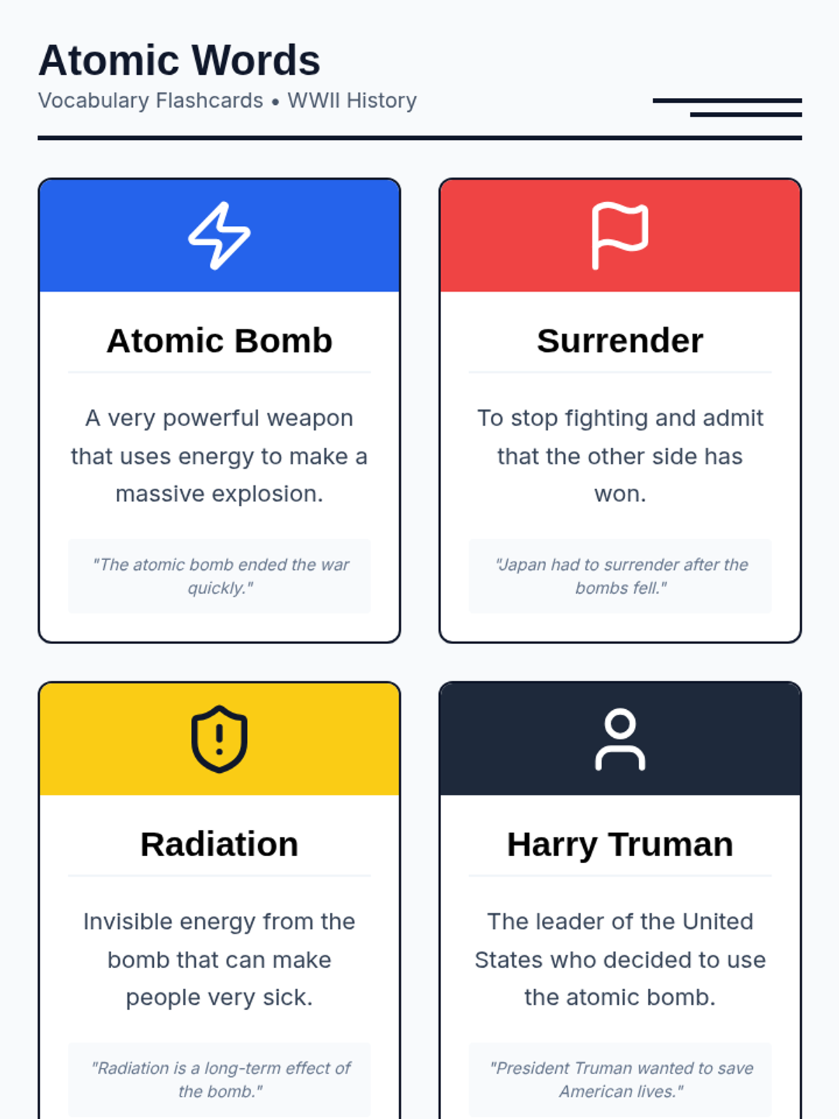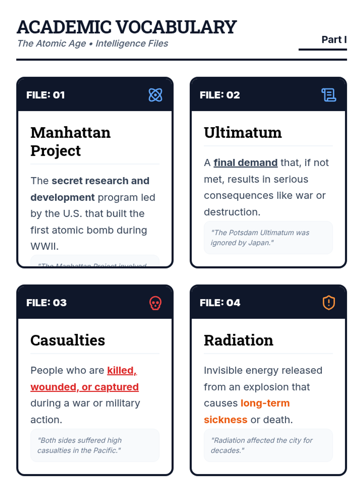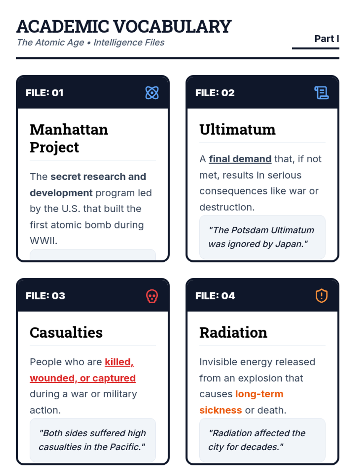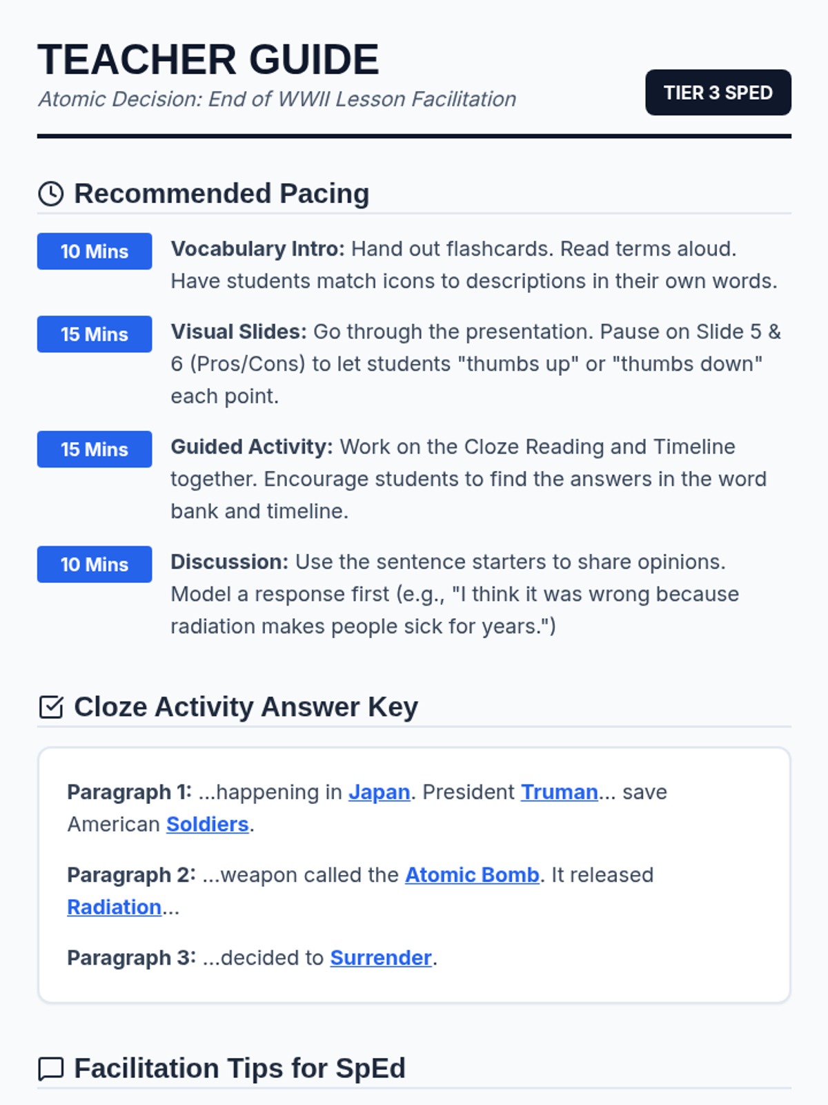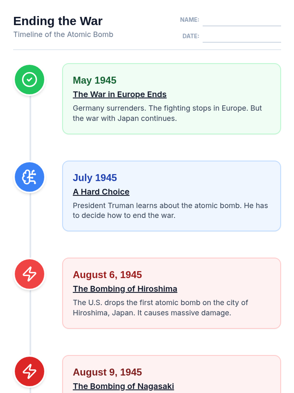 A highly scaffolded lesson for Tier 3 special education students exploring the end of WWII, the Manhattan Project, and the complex decision to use atomic weapons on Hiroshima and Nagasaki. Students use visual timelines, vocabulary cards, and structured sentence starters to analyze the ethical implications and historical impact of these events.