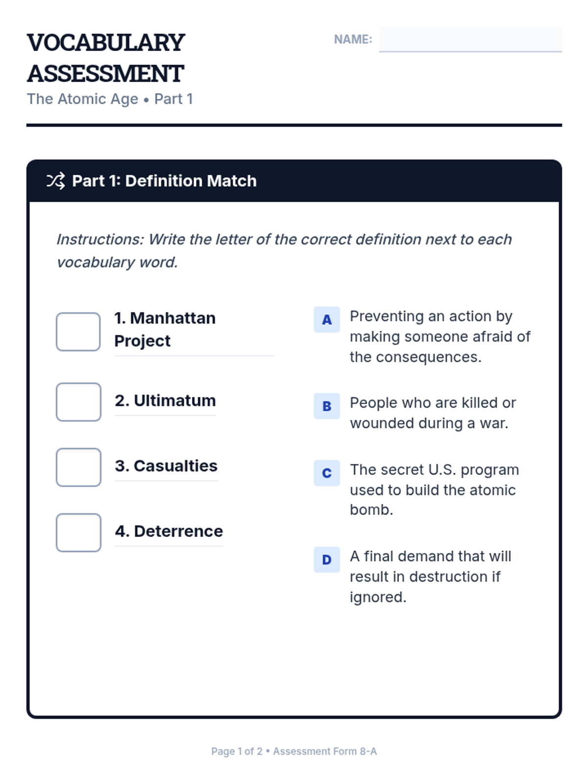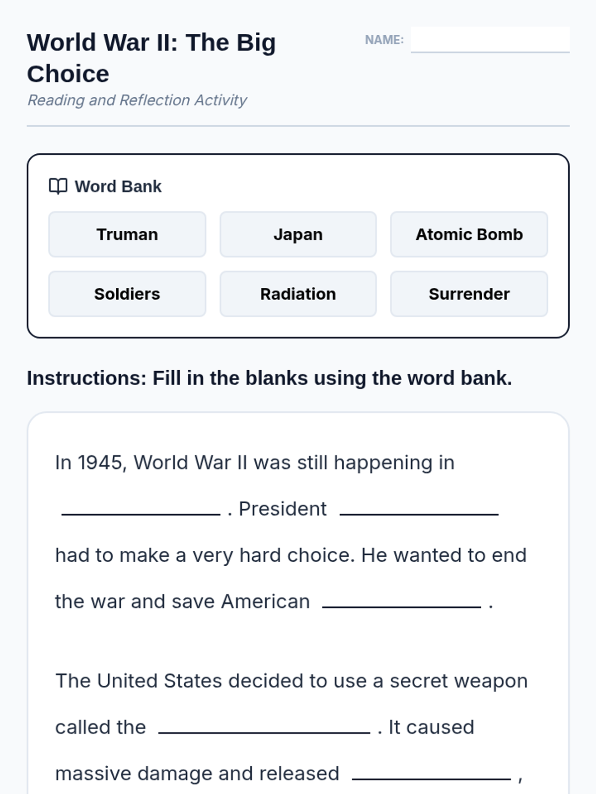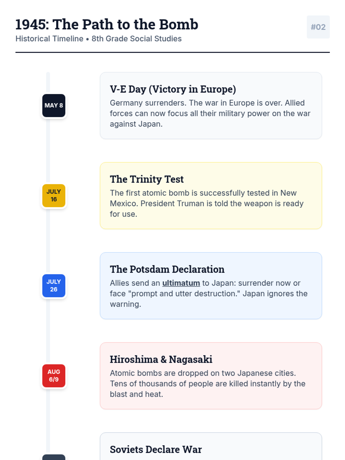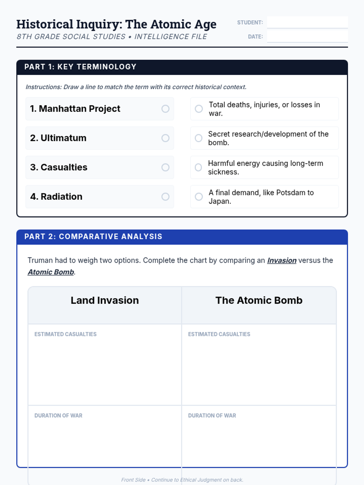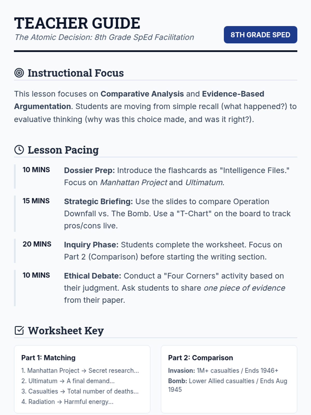 A highly scaffolded lesson for Tier 3 special education students exploring the end of WWII, the Manhattan Project, and the complex decision to use atomic weapons on Hiroshima and Nagasaki. Students use visual timelines, vocabulary cards, and structured sentence starters to analyze the ethical implications and historical impact of these events.