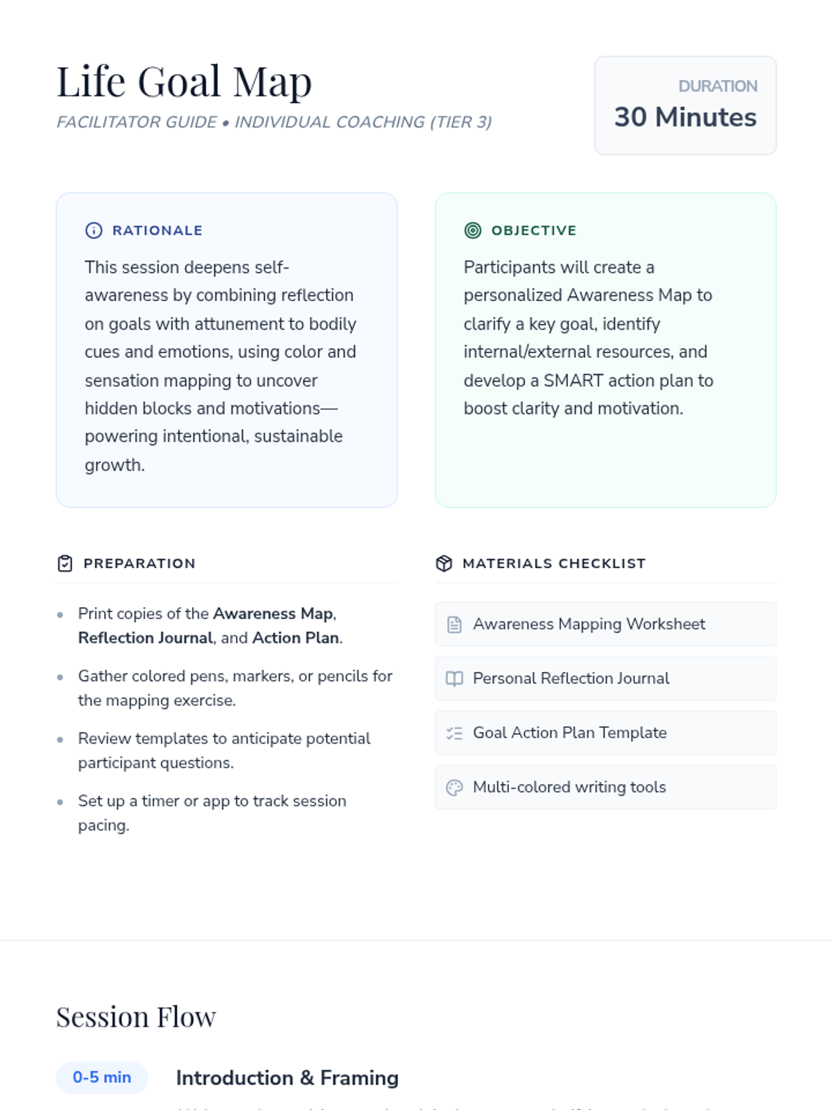A 30-minute individual coaching session focused on clarifying personal and professional goals through embodied awareness mapping and SMART action planning. Participants will identify strengths, resources, and obstacles to build a clear path forward.