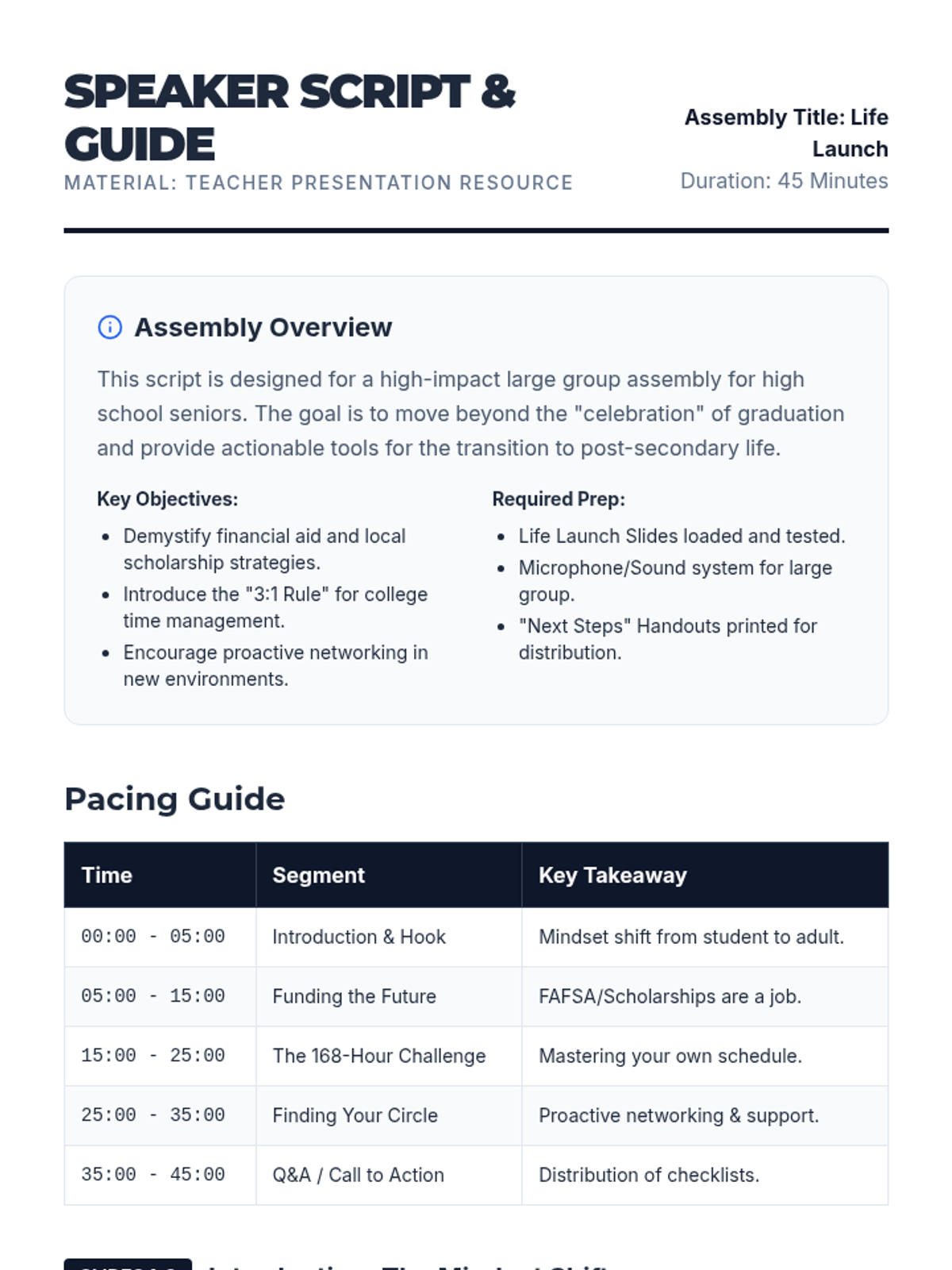 A comprehensive assembly package for high school seniors preparing for graduation. This lesson includes a visual slide deck, a detailed speaker script, and a student takeaway checklist covering financial aid, time management, and social transitions.