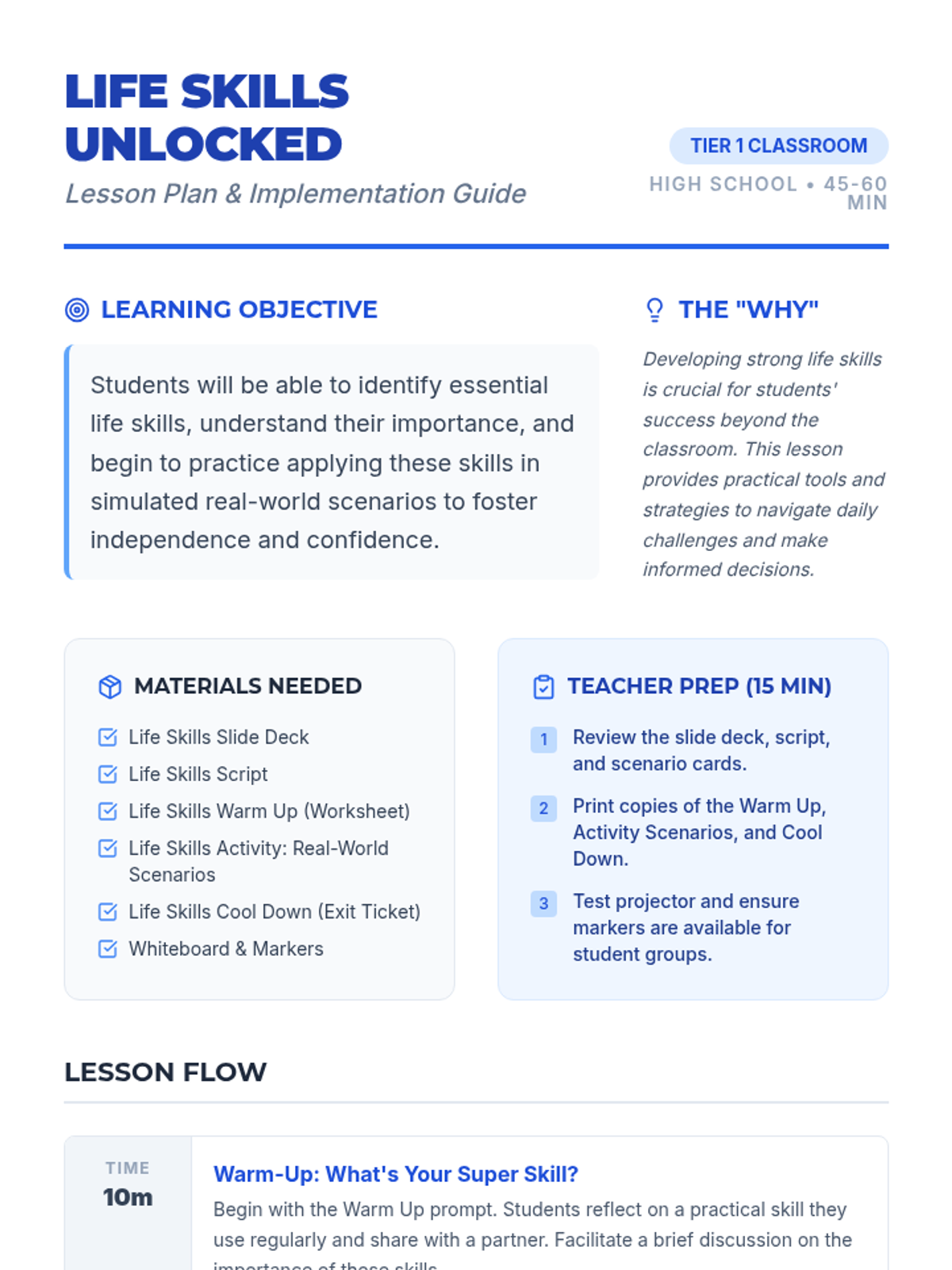 This lesson equips high school students with essential practical skills for navigating everyday challenges, fostering independence, and building confidence through interactive scenarios and discussions.