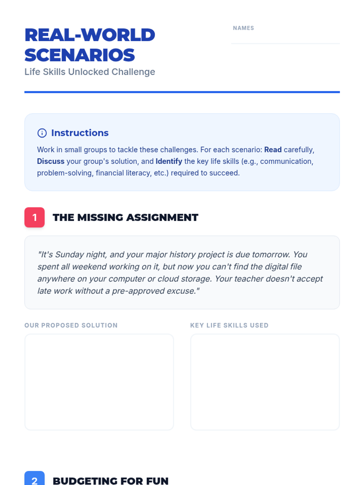 Practical team-based synergy challenges to apply collaborative problem-solving skills.