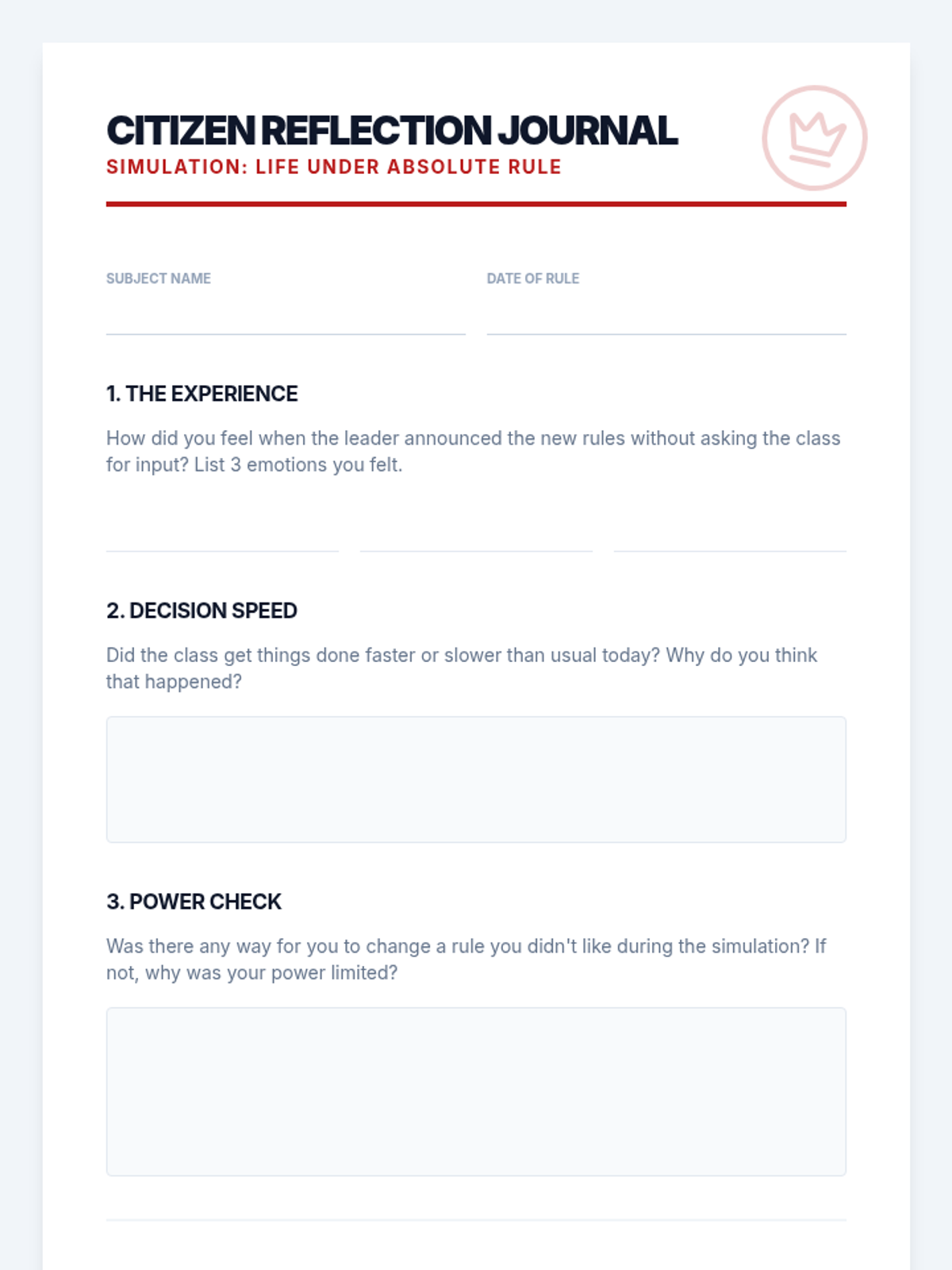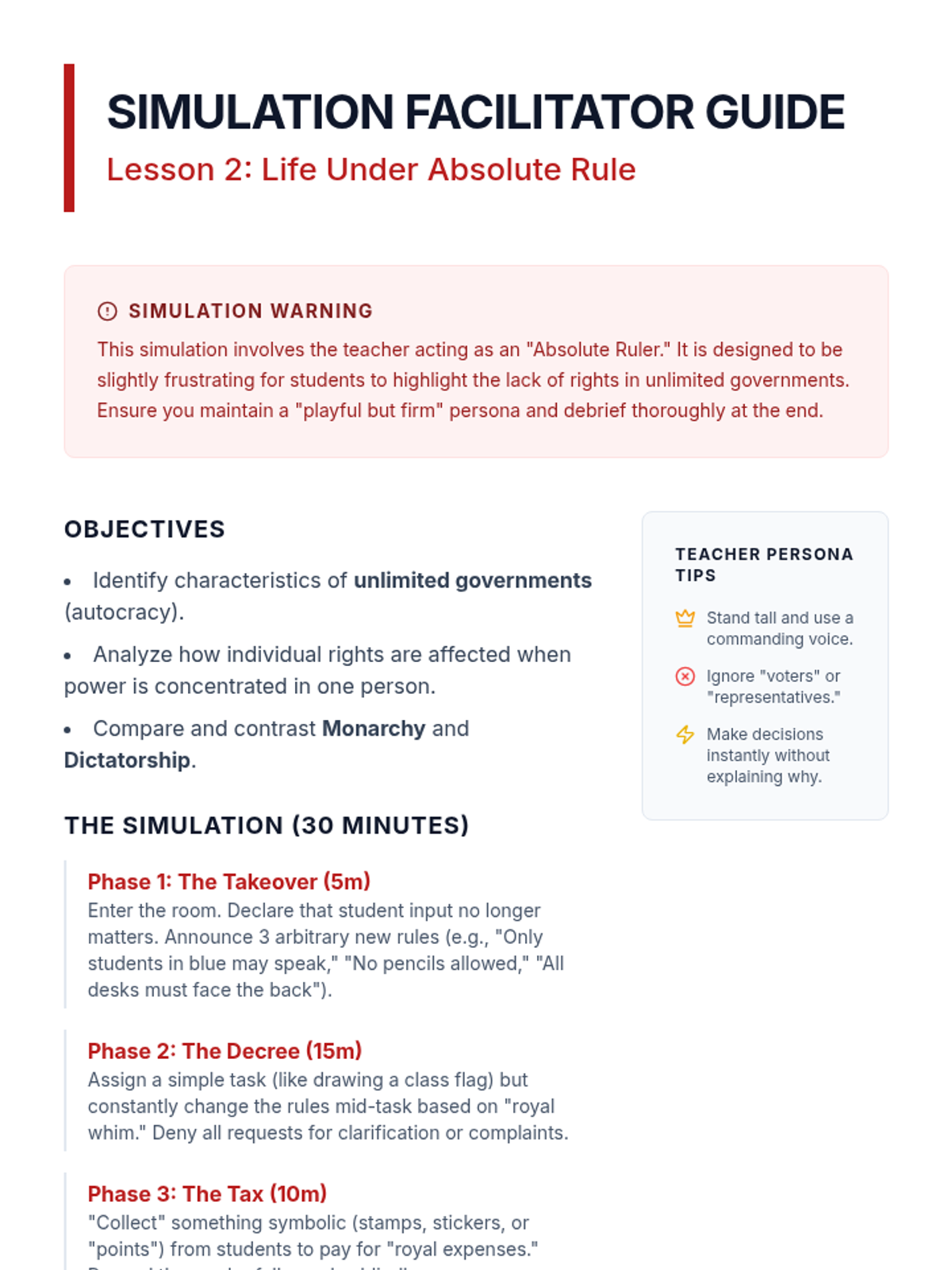 A classroom simulation of absolute rule to experience the characteristics and impacts of autocracy, monarchy, and dictatorship.