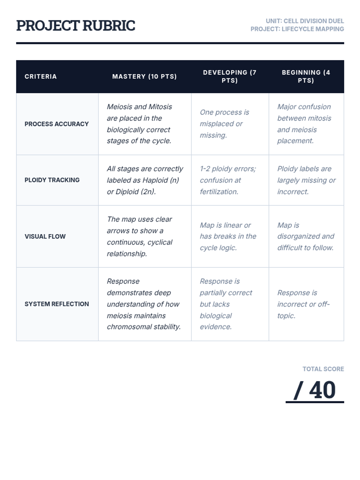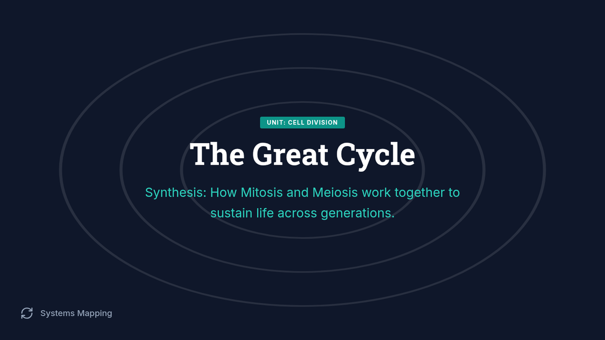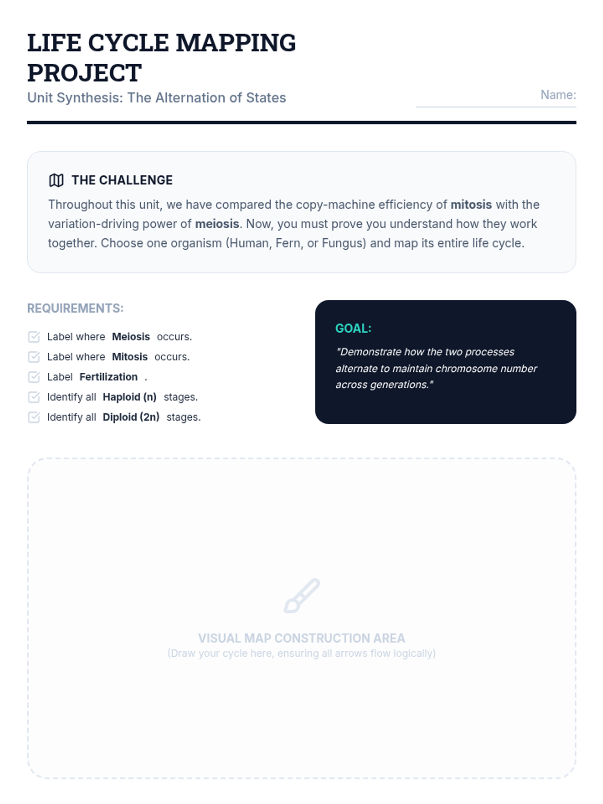 Students synthesize their learning by drawing complete life cycles of different organisms, showing where mitosis and meiosis occur. They demonstrate how the two processes alternate to maintain chromosome number across generations.