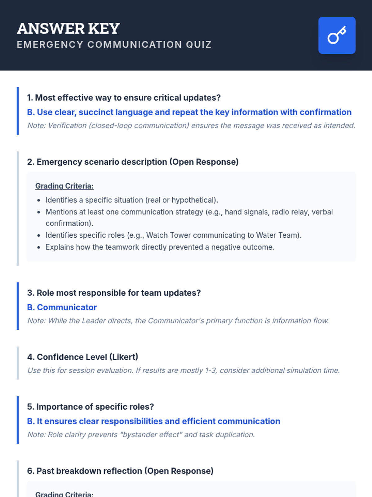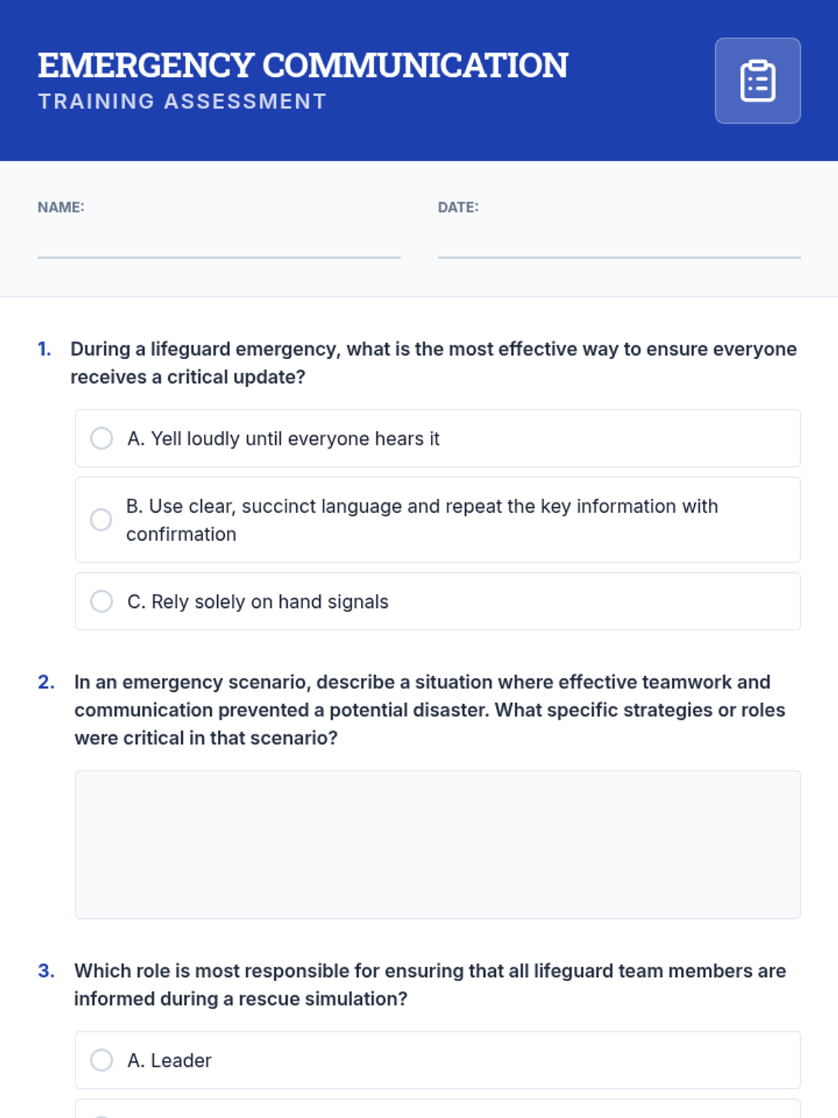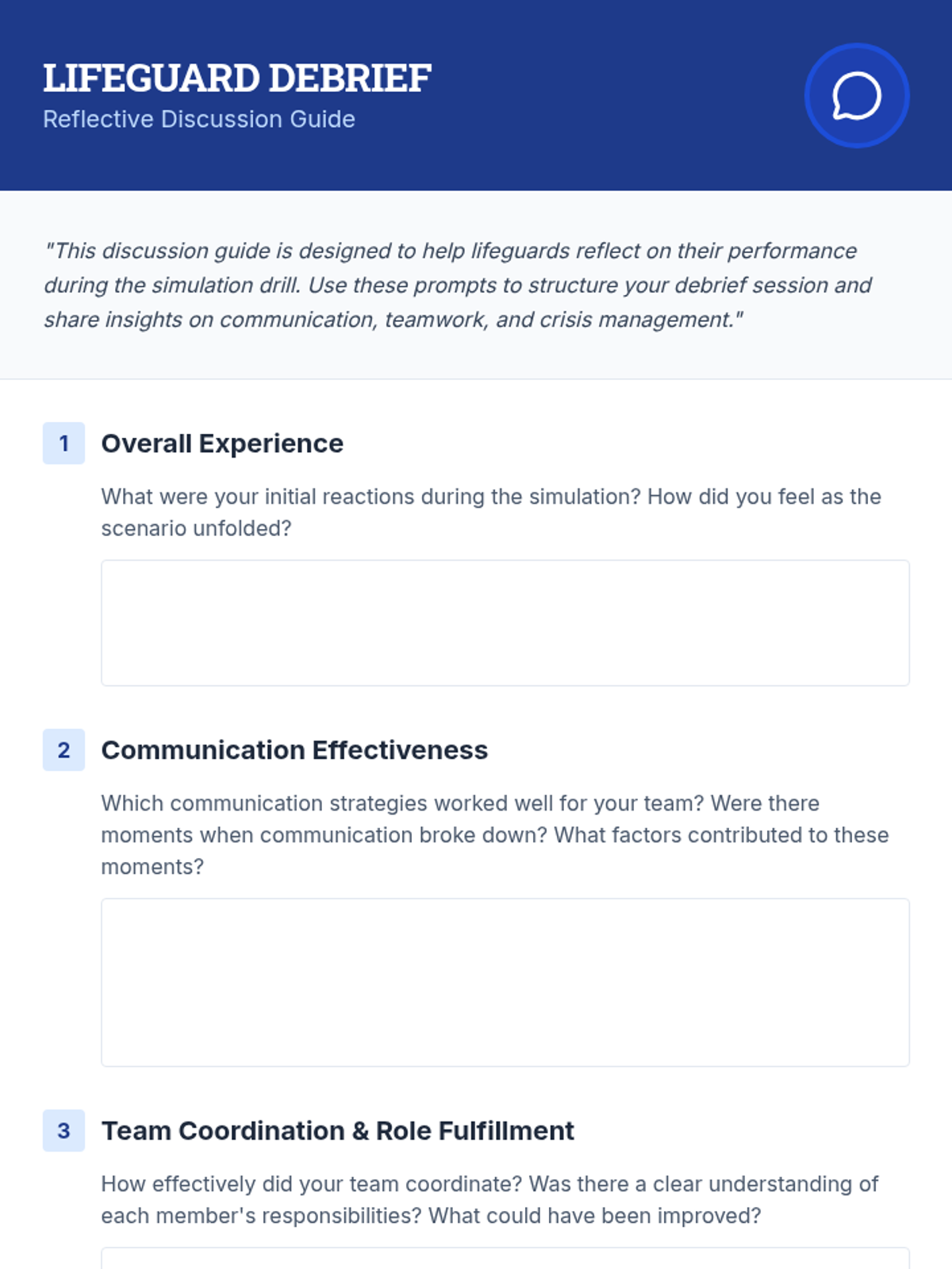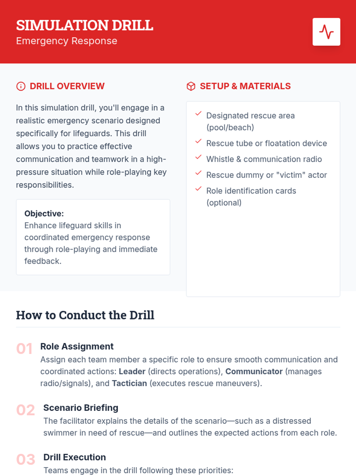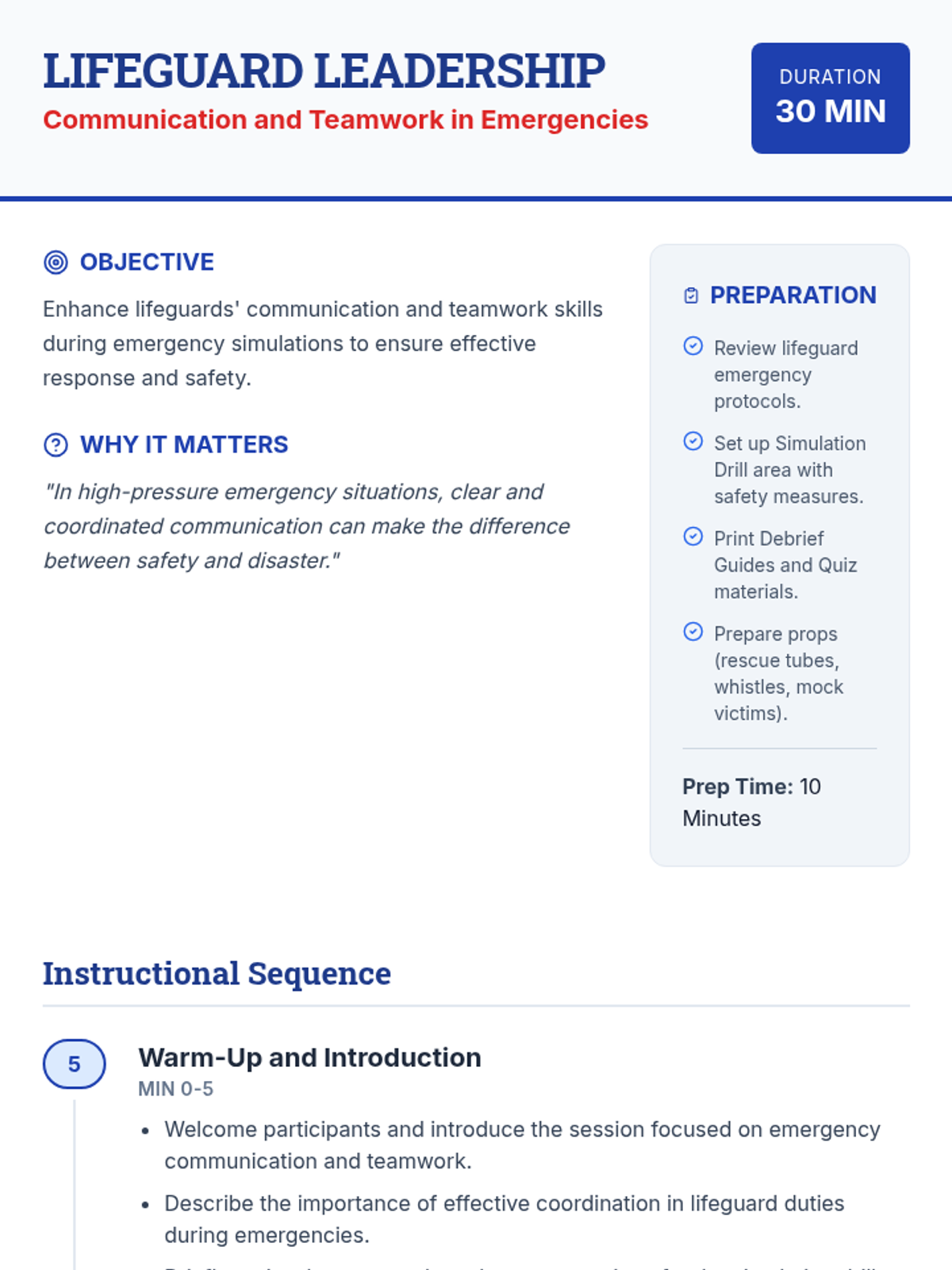 A 30-minute training session for lifeguards focused on enhancing communication and teamwork during high-pressure emergency scenarios through simulations and structured reflection.