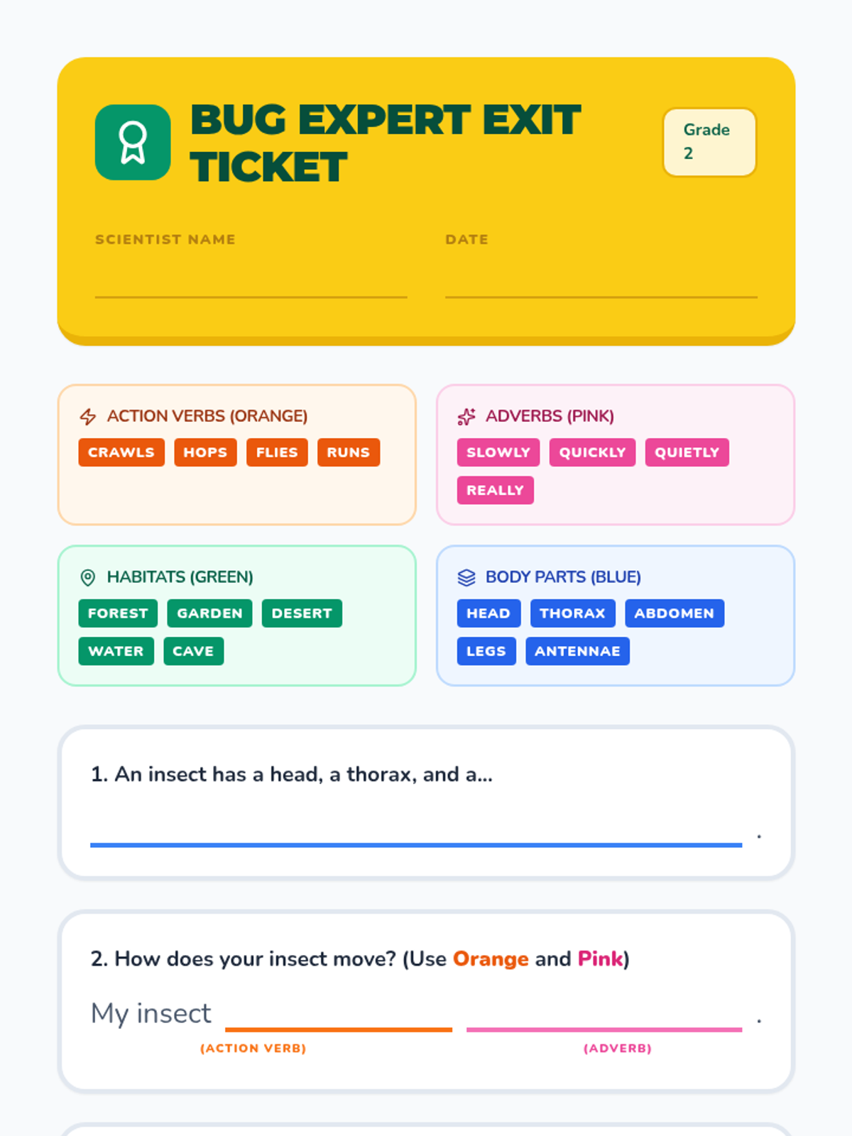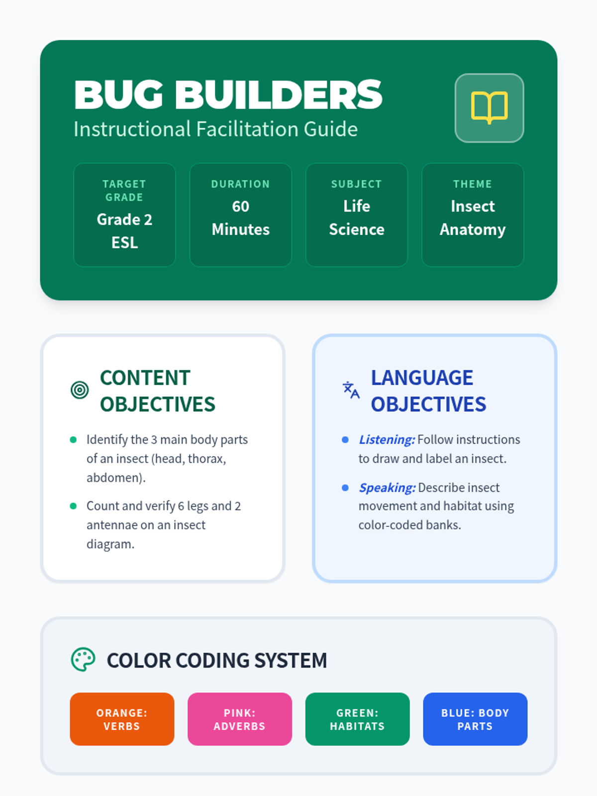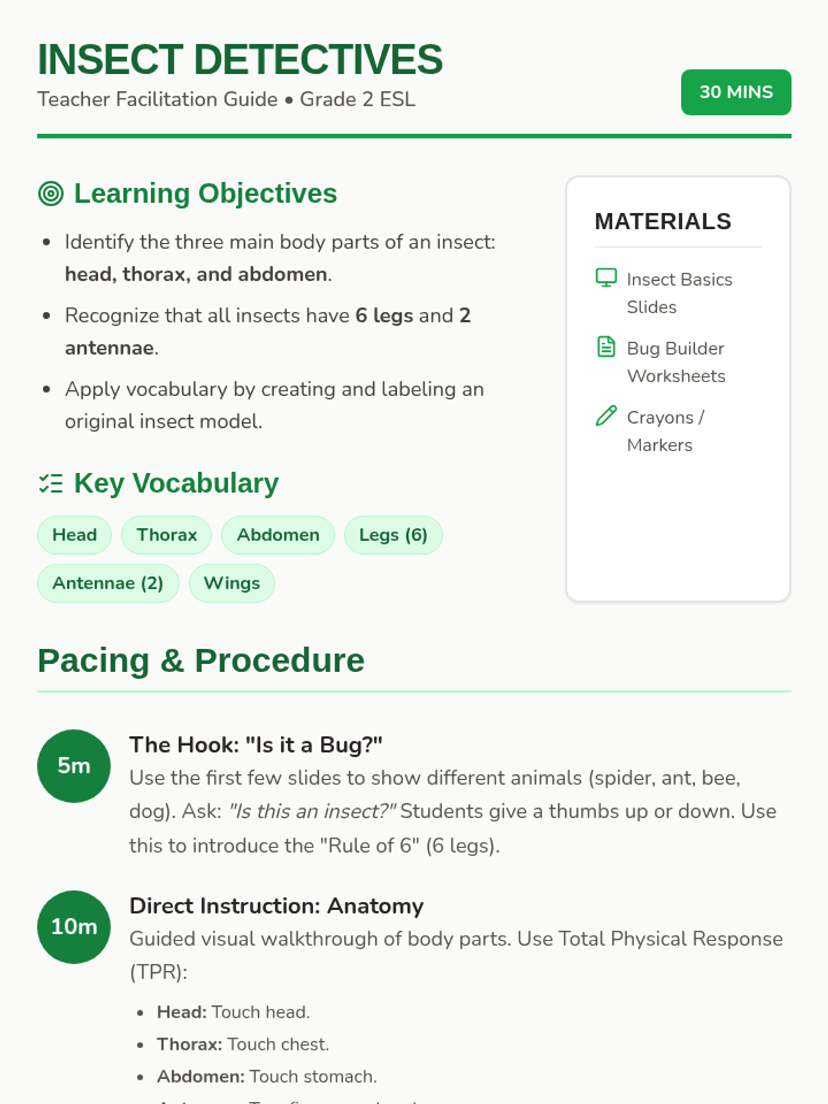 A fast-paced 30-minute lesson for Grade 2 ESL students to identify core insect characteristics through visual aids and a creative hands-on activity.