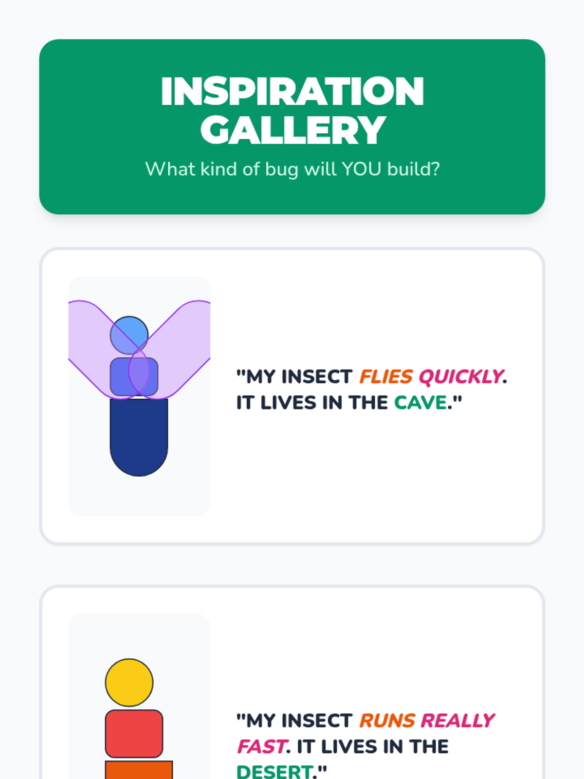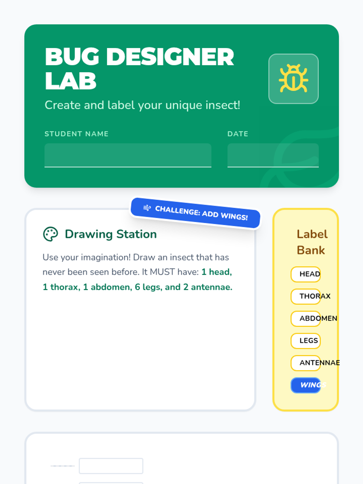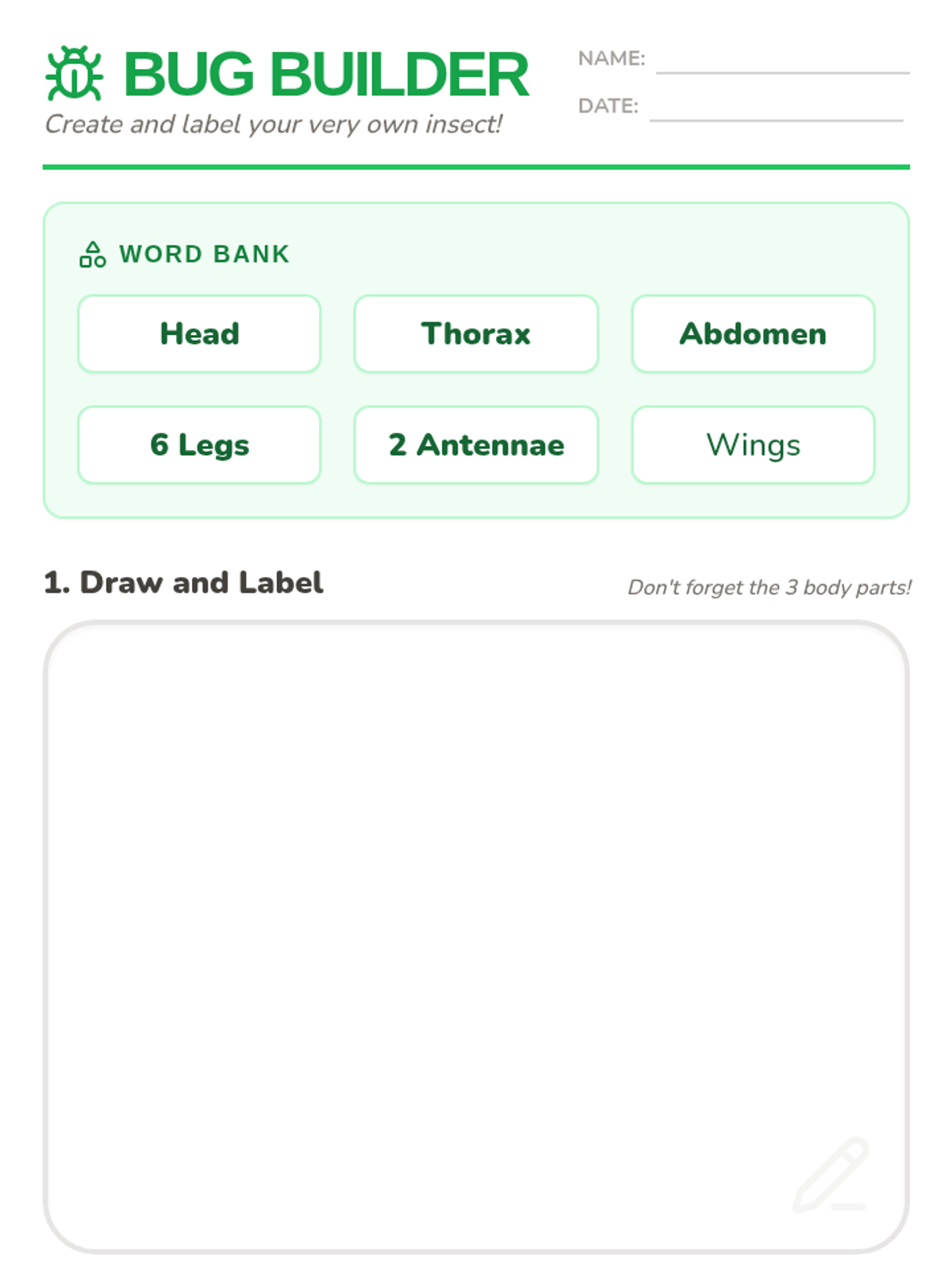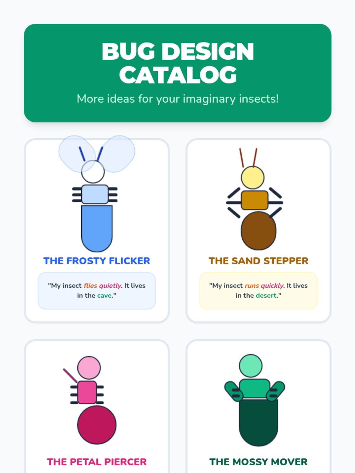 Students learn the anatomy of an insect (head, thorax, abdomen, 6 legs, 2 antennae) and apply this knowledge by designing, labeling, and describing their own colorful insect.