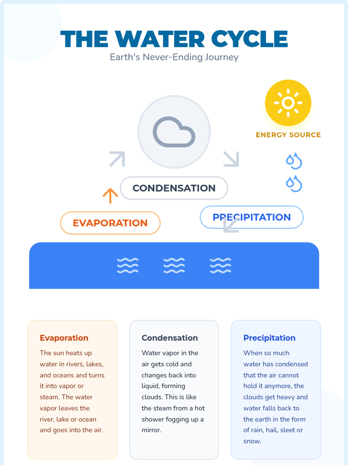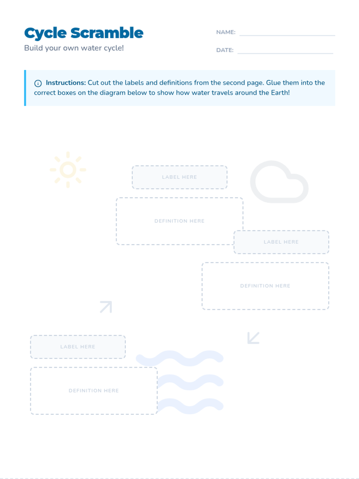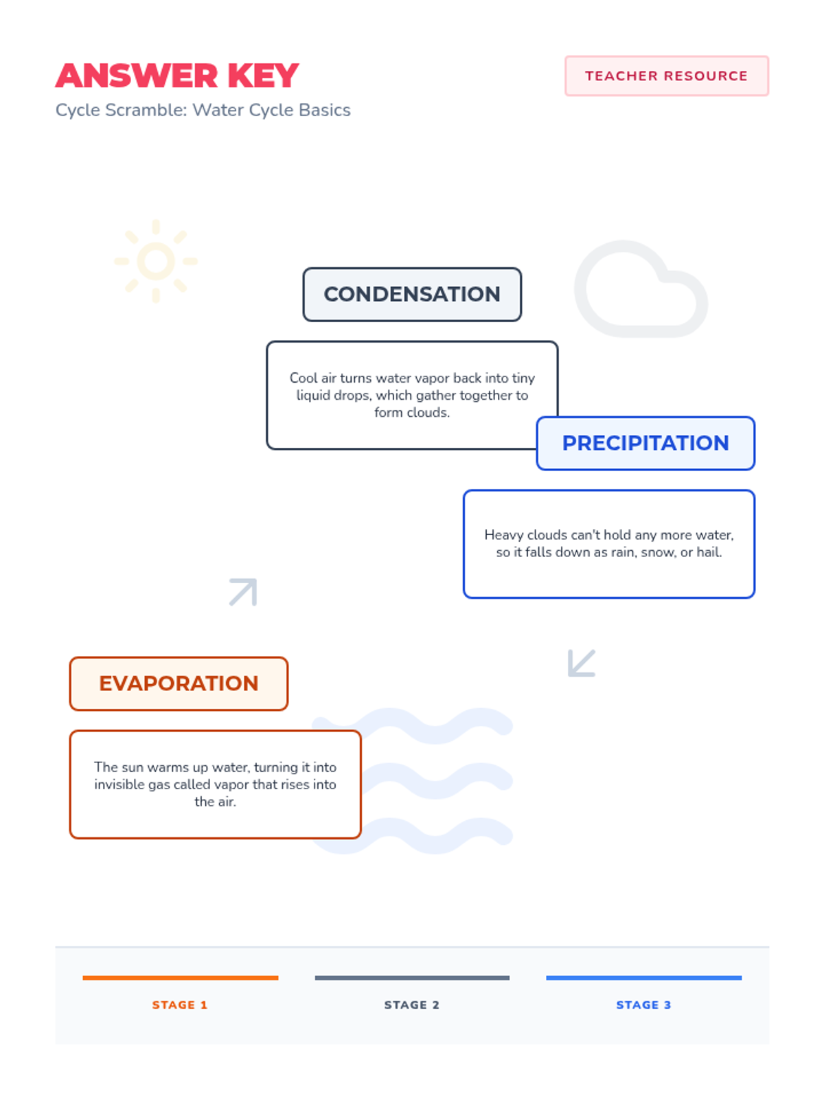 A foundational lesson on the three main stages of the water cycle: evaporation, condensation, and precipitation. Includes a visual anchor chart and a hands-on labeling activity.