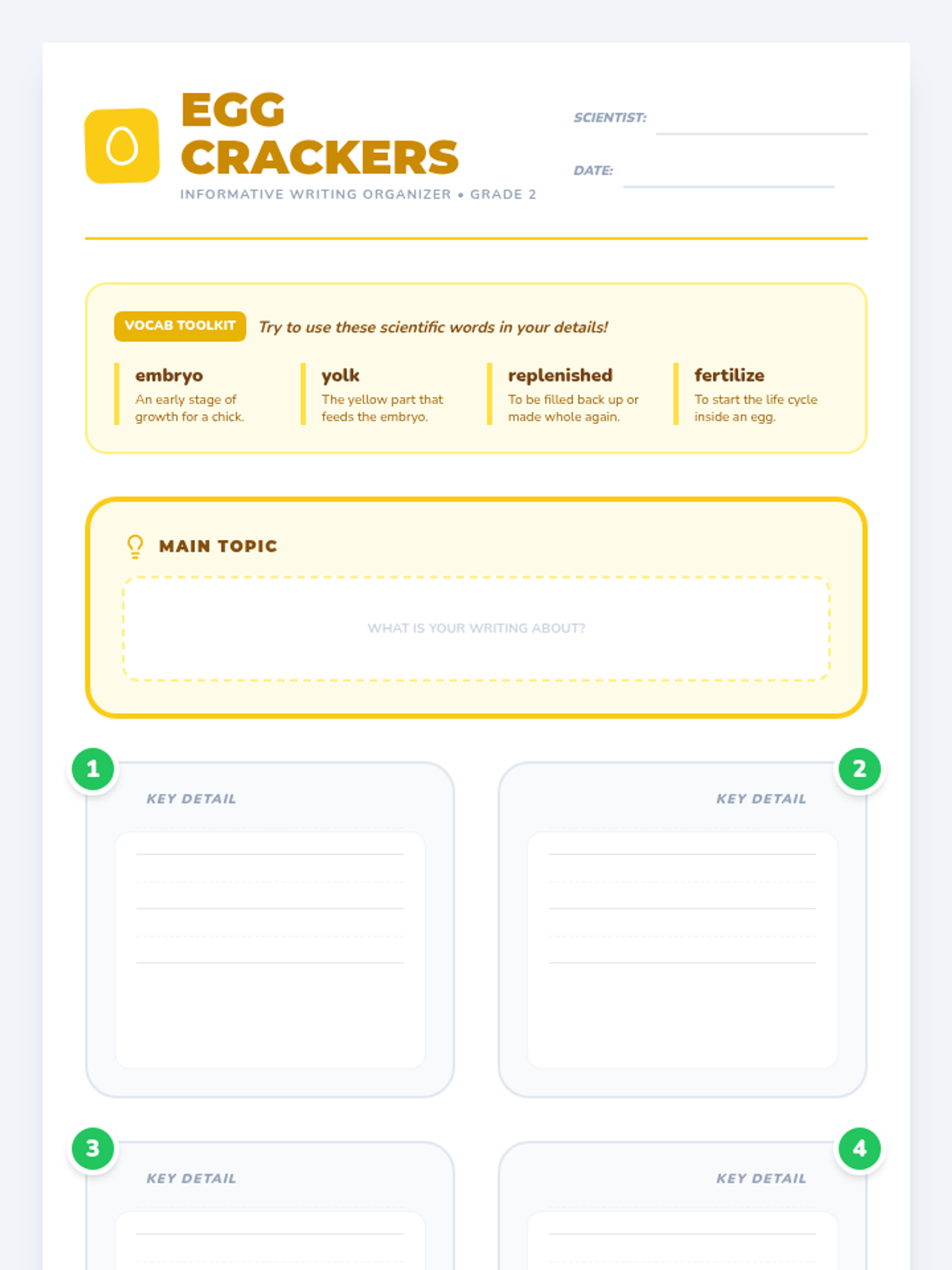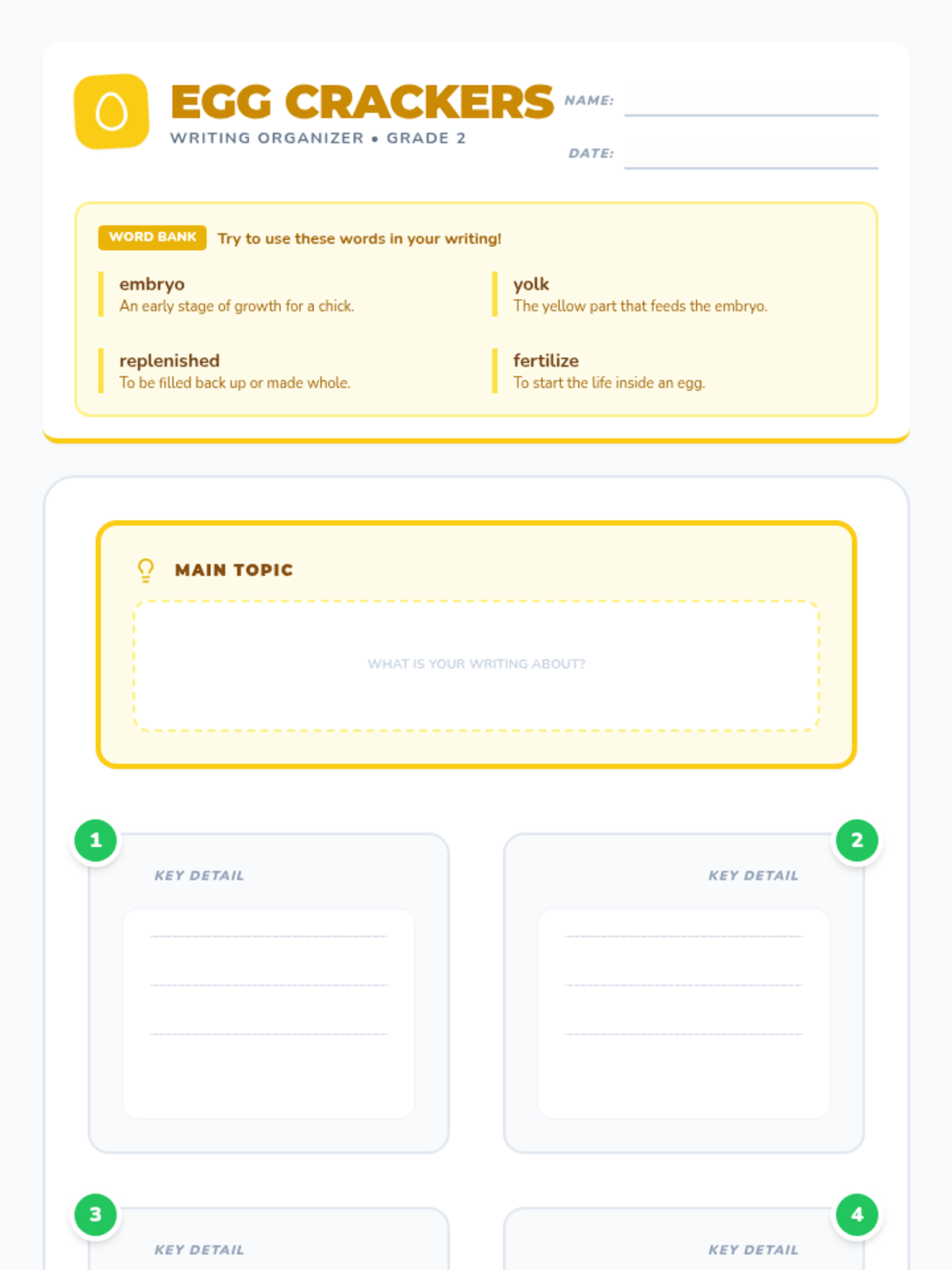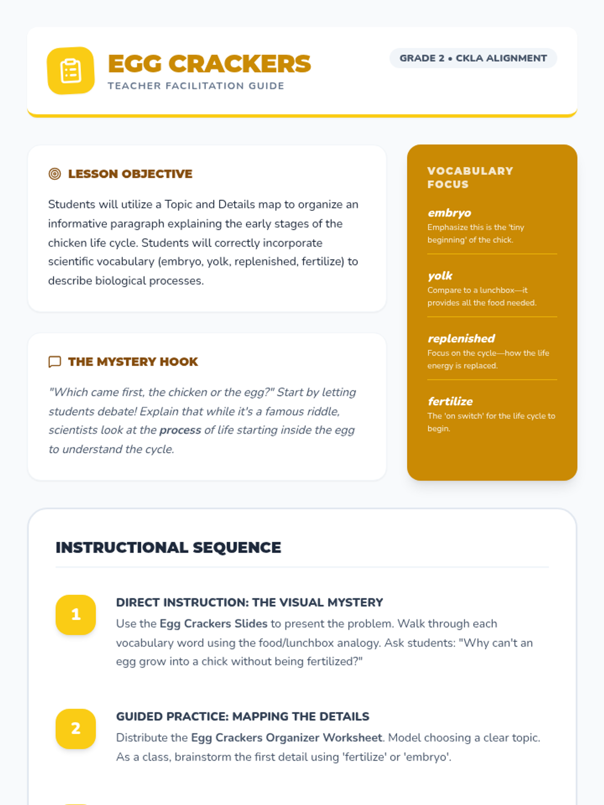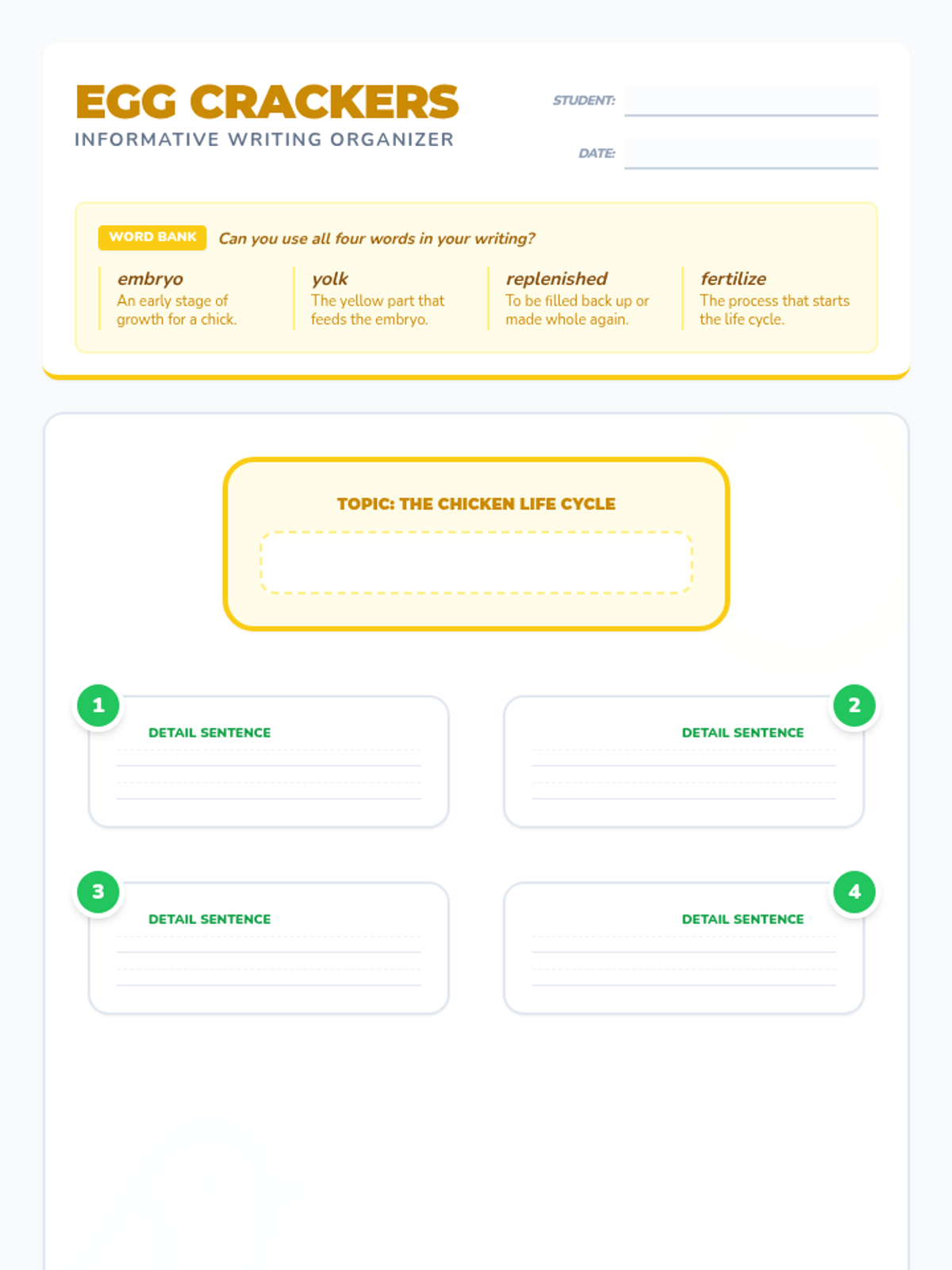 In this lesson, students explore the life cycle of a chicken and the mystery of the chicken or the egg. They use a topic and details map to organize their informative writing while mastering key vocabulary like embryo, yolk, and fertilize.
