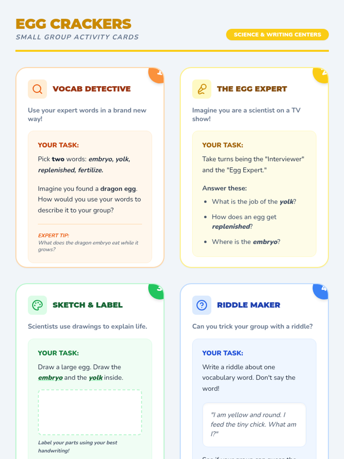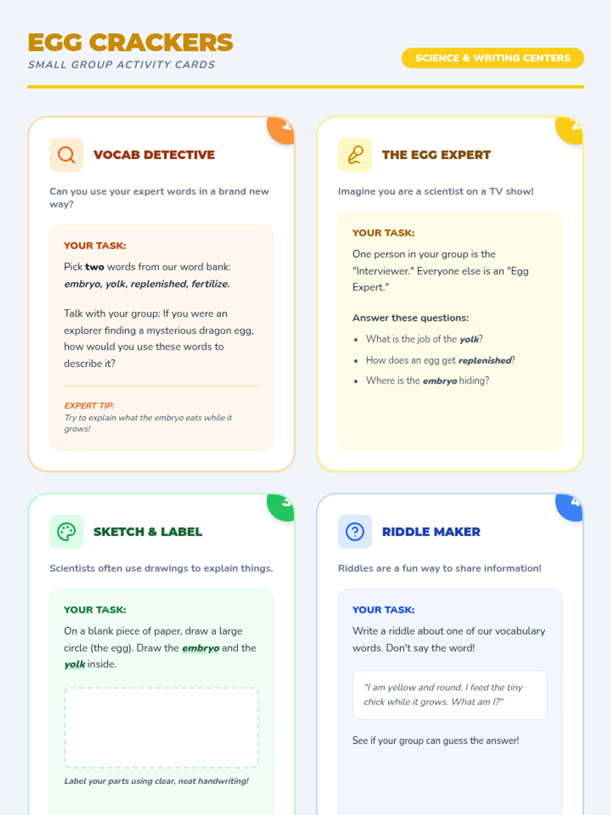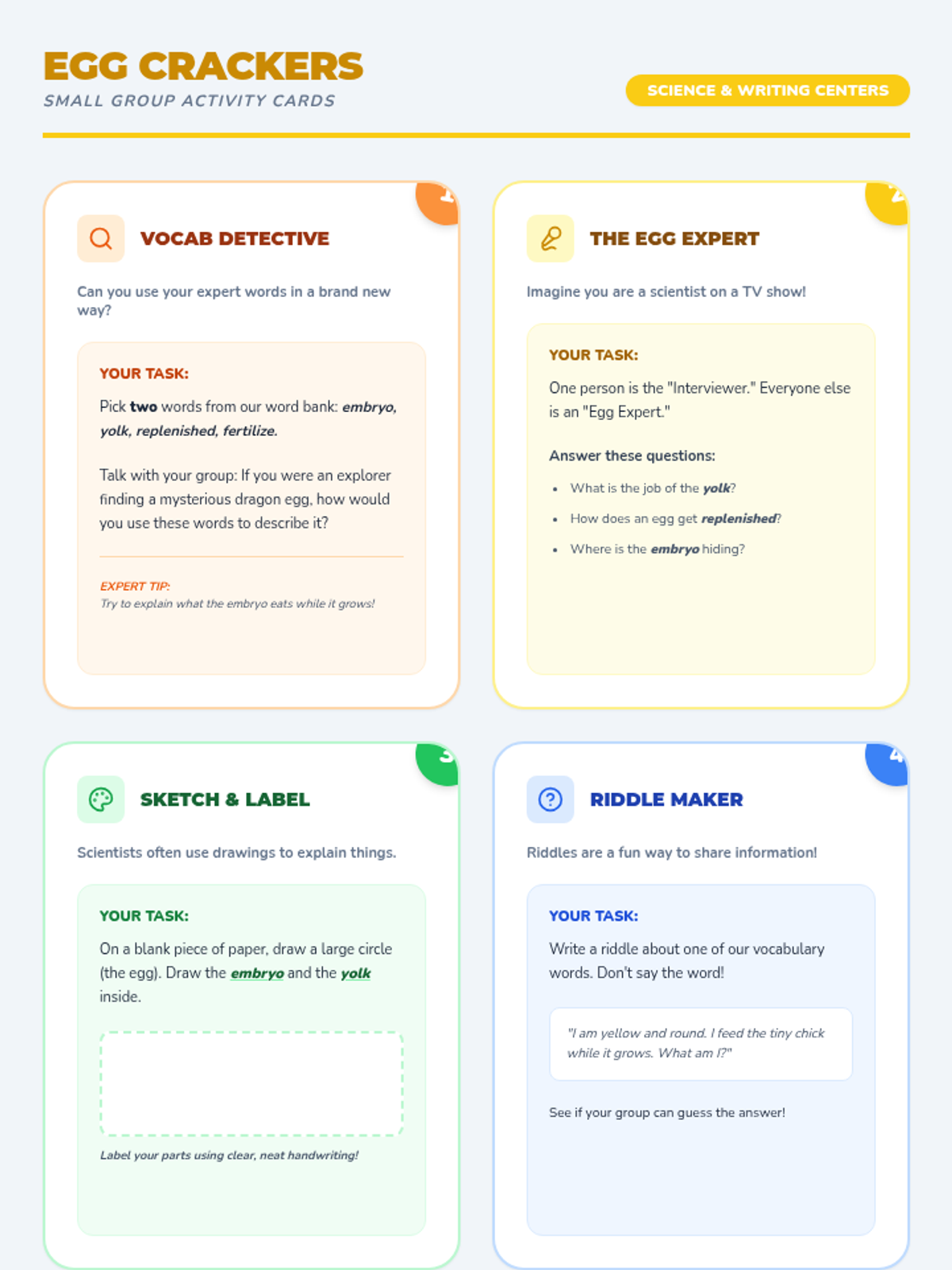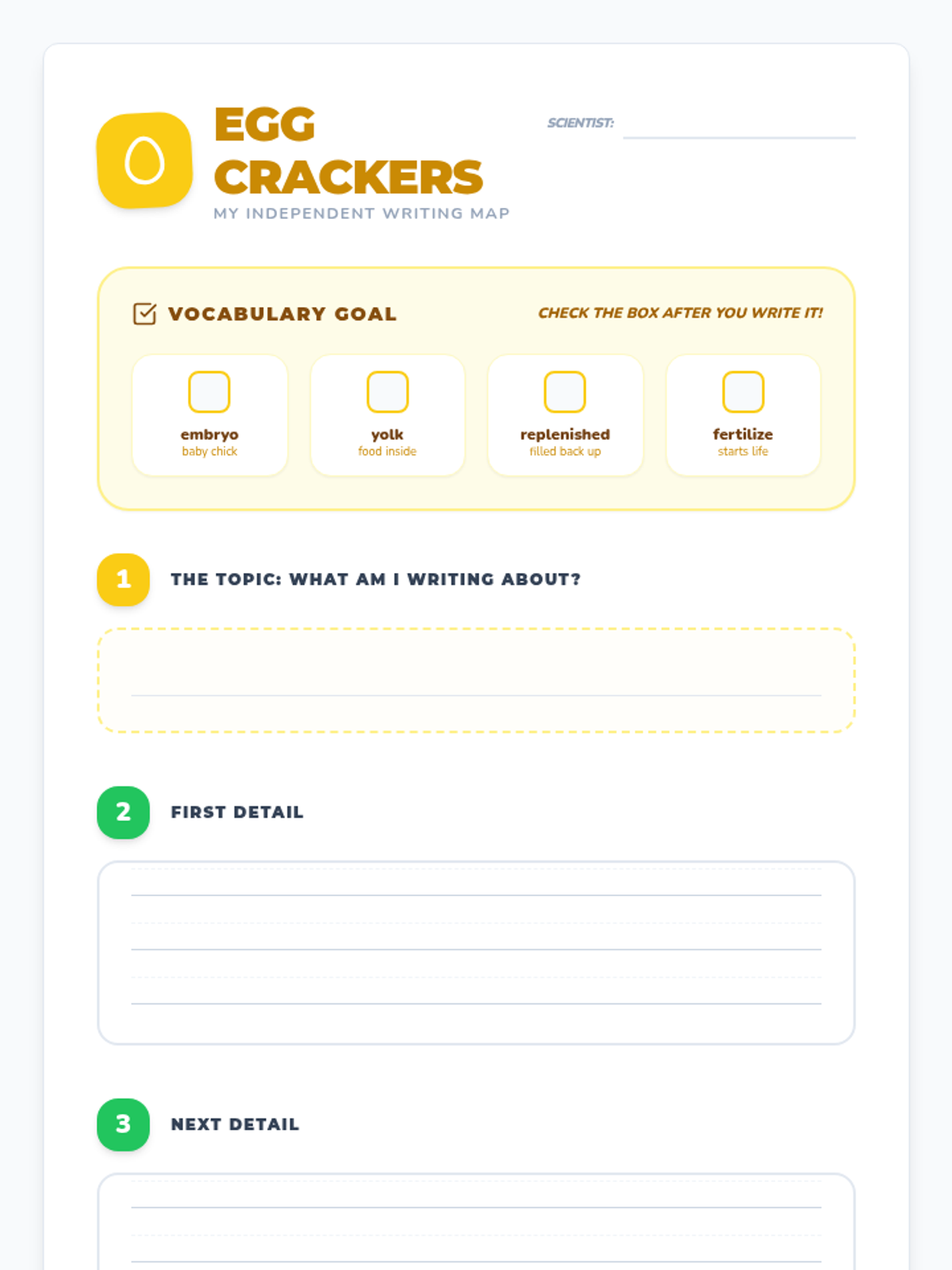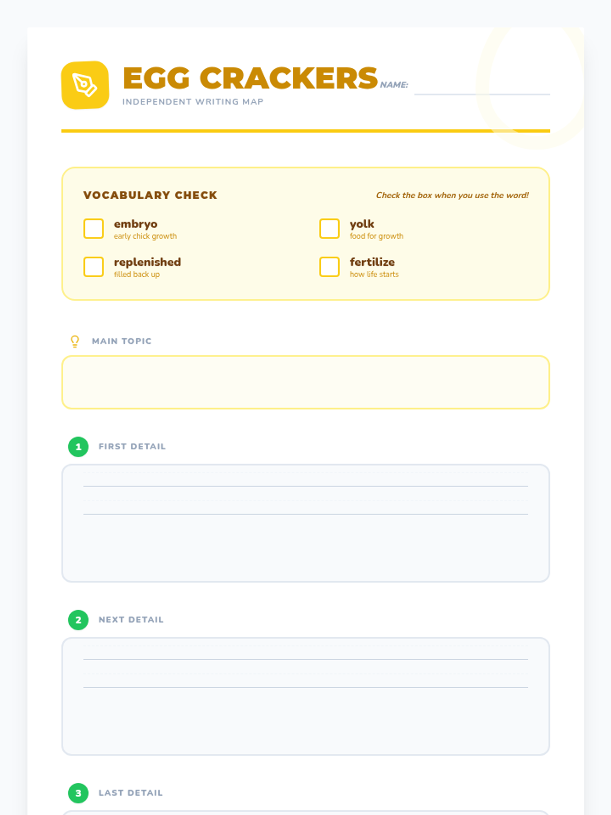 In this lesson, students explore the life cycle of a chicken and the mystery of the chicken or the egg. They use a topic and details map to organize their informative writing while mastering key vocabulary like embryo, yolk, and fertilize.