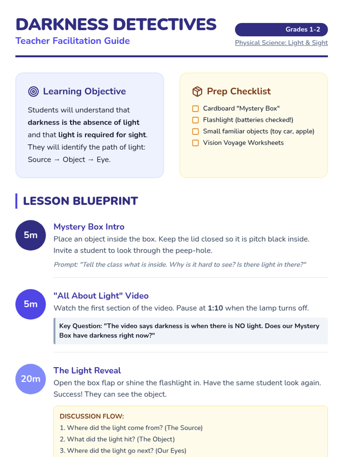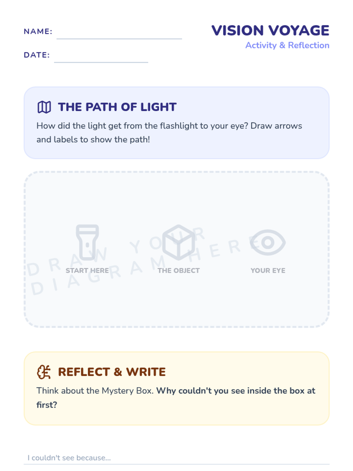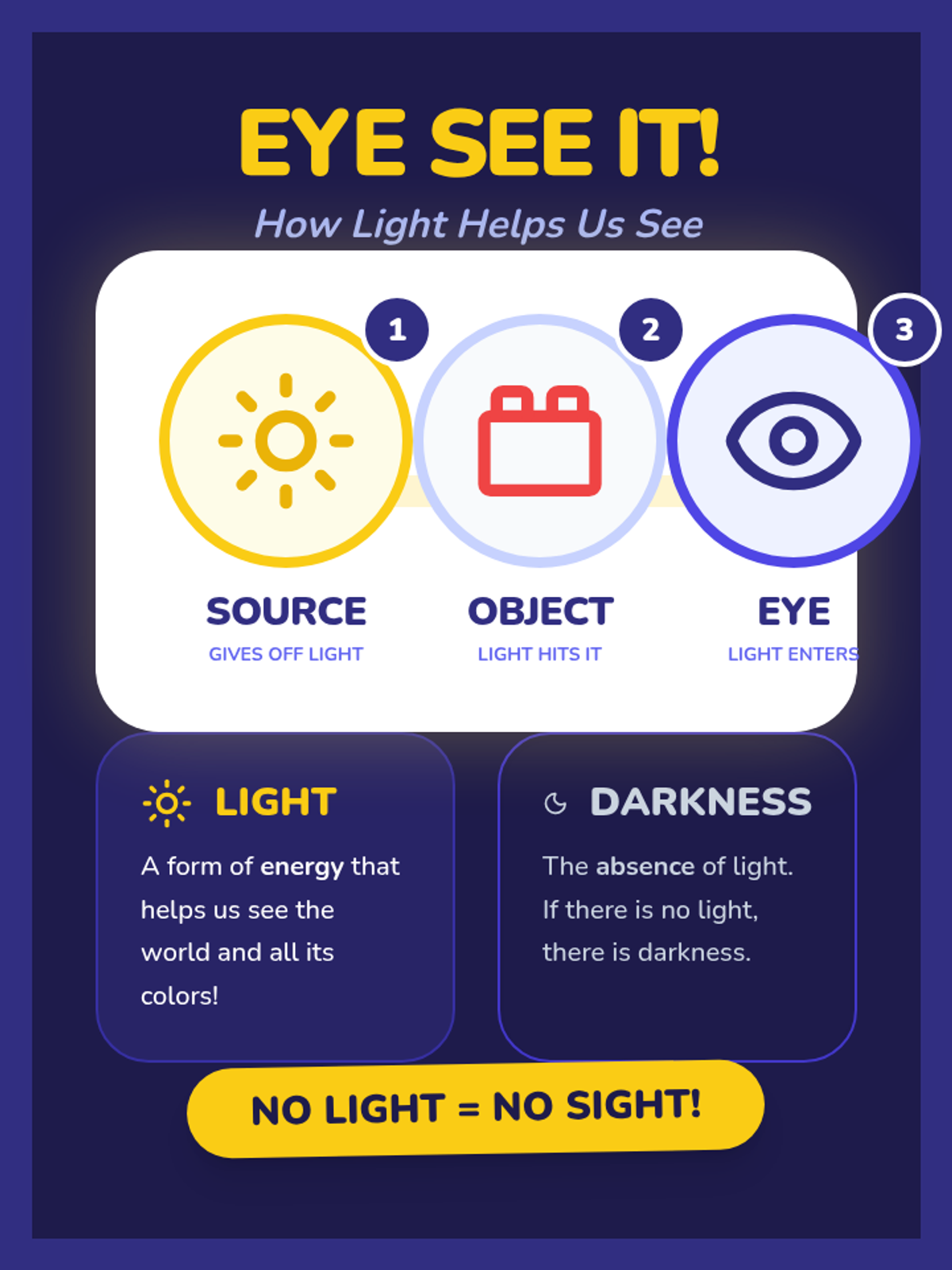 A hands-on exploration of light and sight where students discover that darkness is simply the absence of light and that we need light to see the world around us.