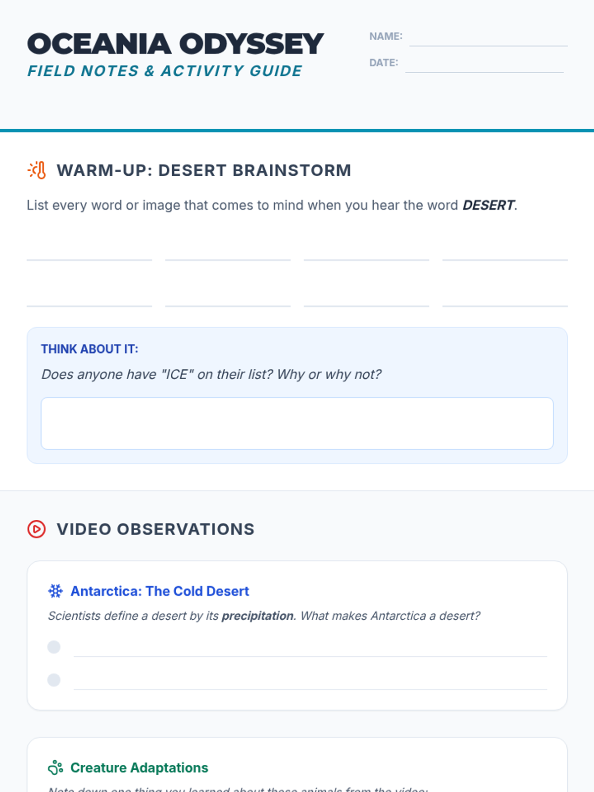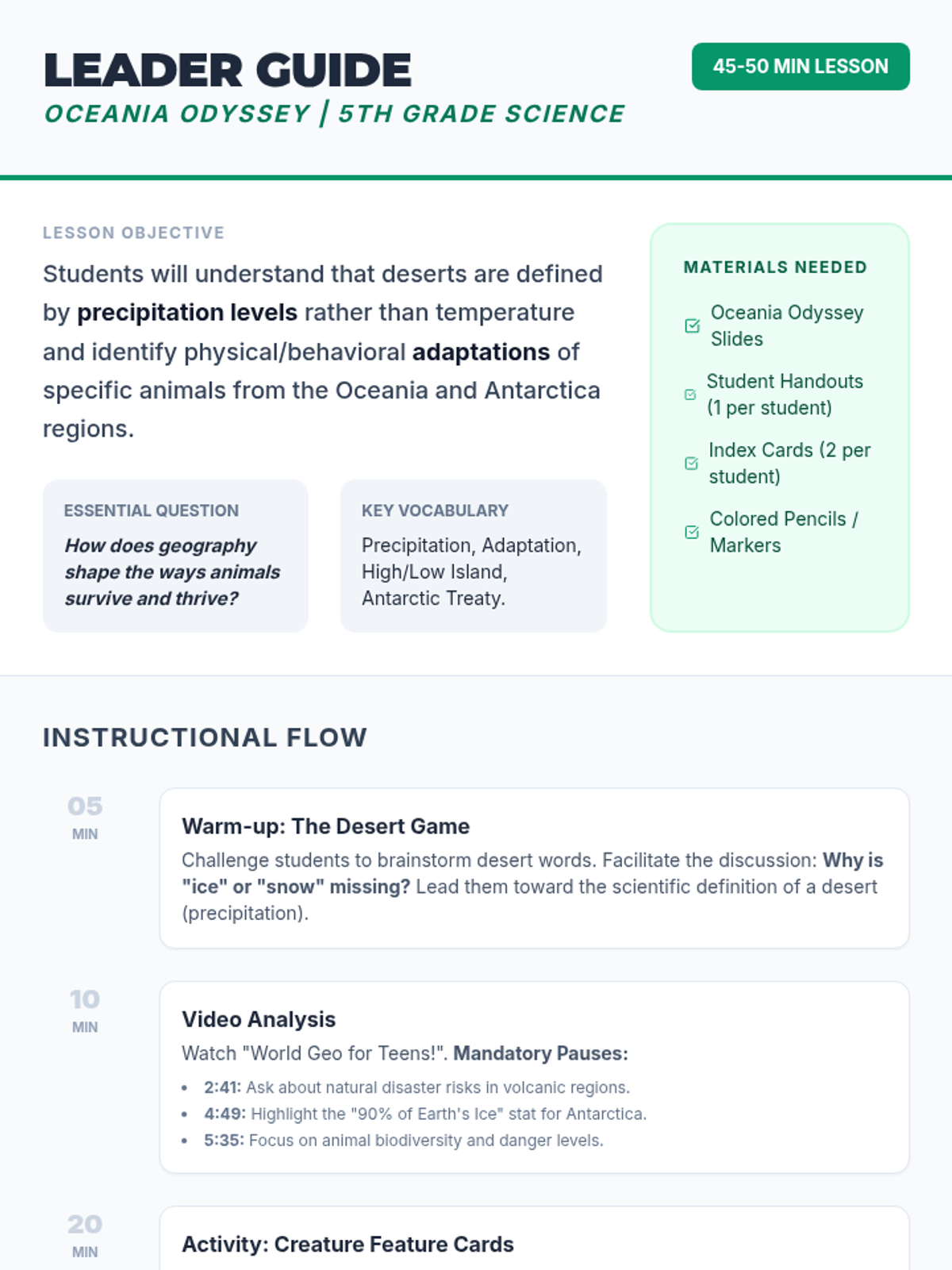 A 5th-grade science lesson exploring the climate of Antarctica as a cold desert and the unique biological adaptations of animals found throughout Oceania and Antarctica.