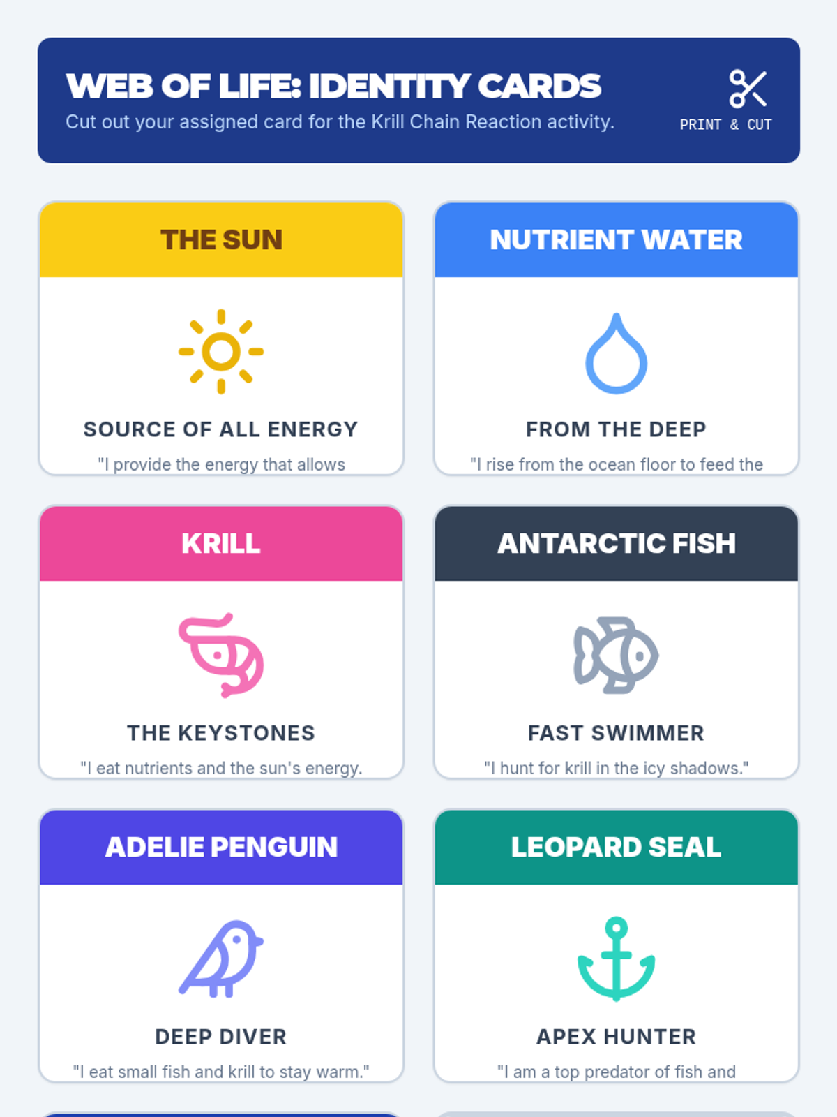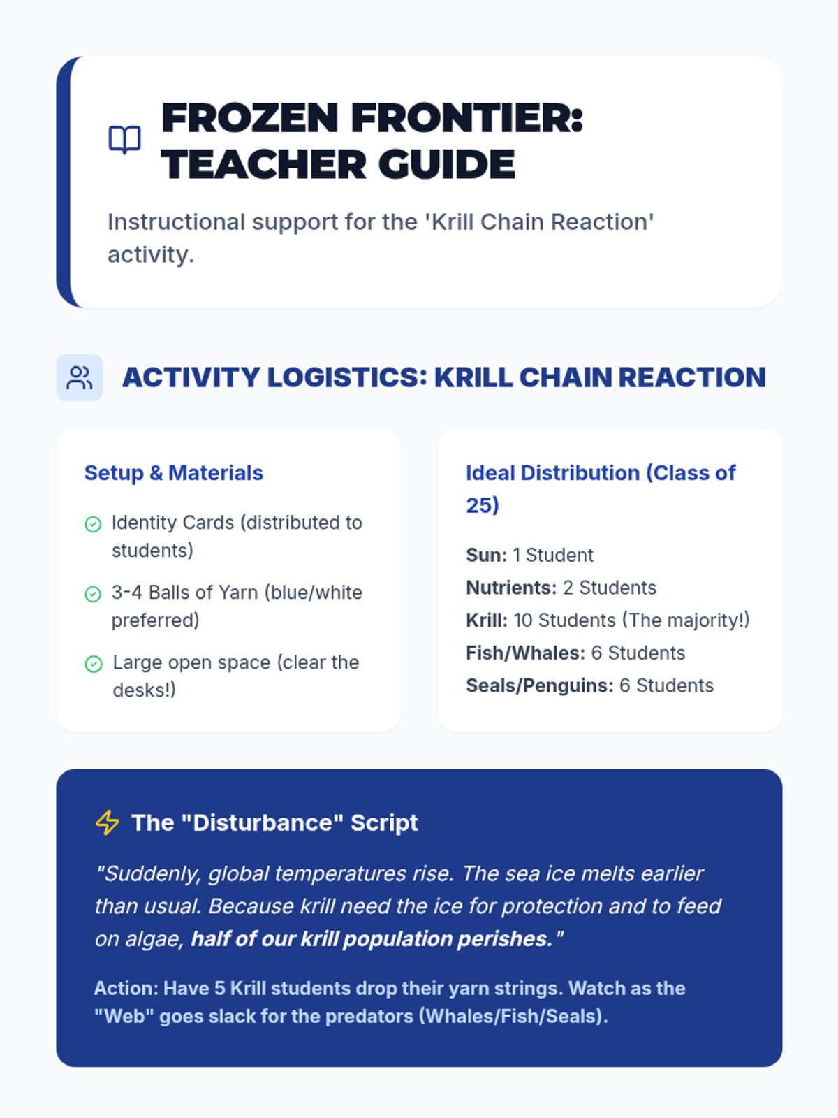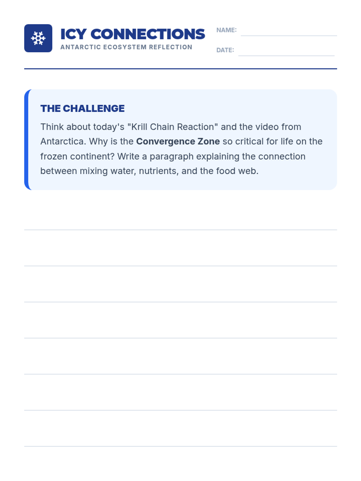 Students will explore the Antarctic ecosystem, focusing on the convergence zone and the critical role of krill in the food web through a hands-on 'Chain Reaction' activity.