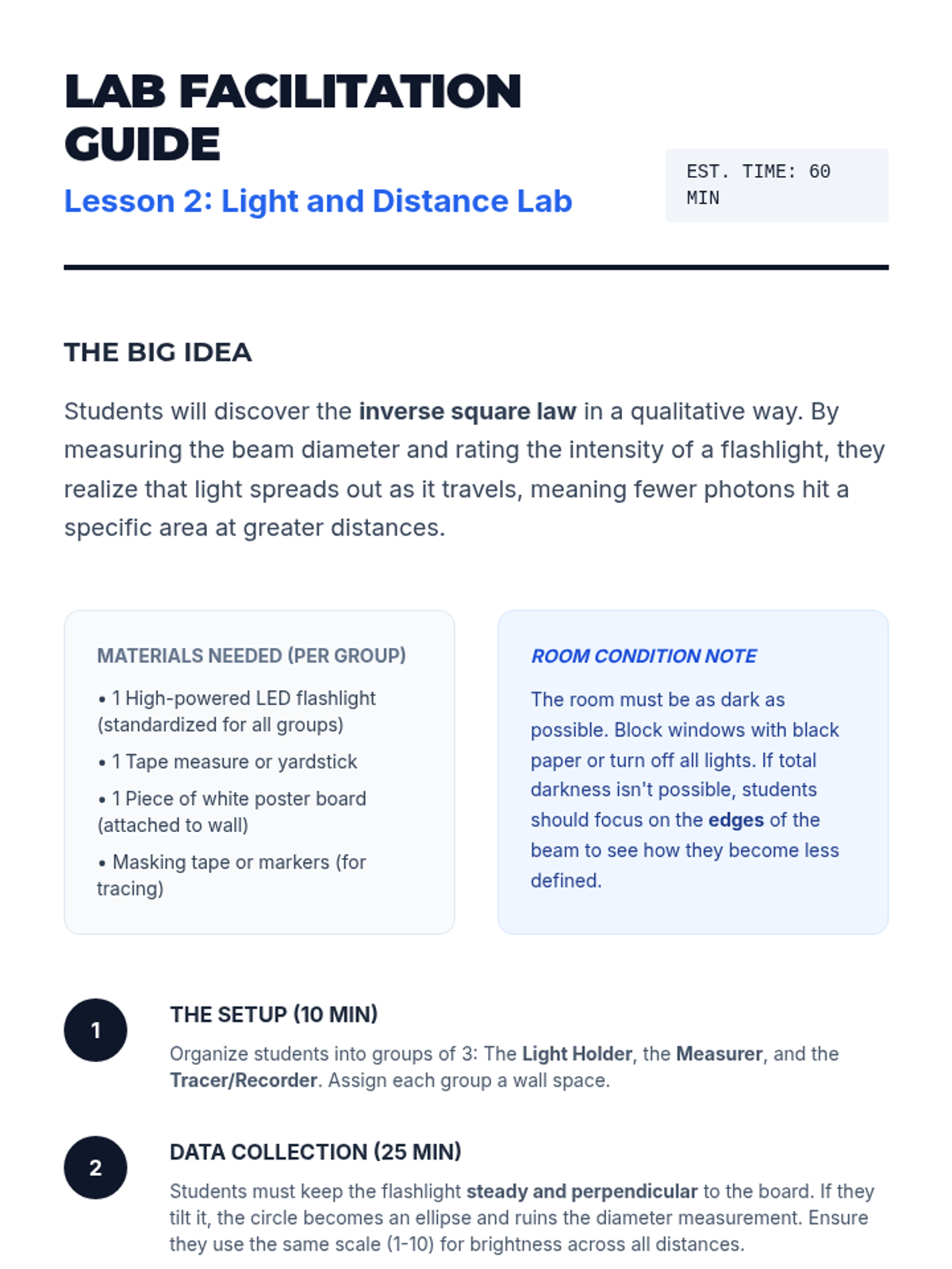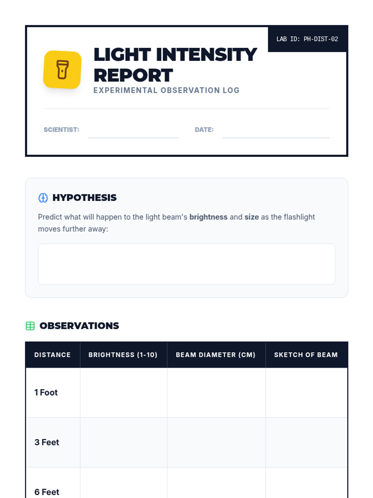 Students conduct a hands-on experiment using flashlights to observe how distance affects the apparent brightness and size of a light source.