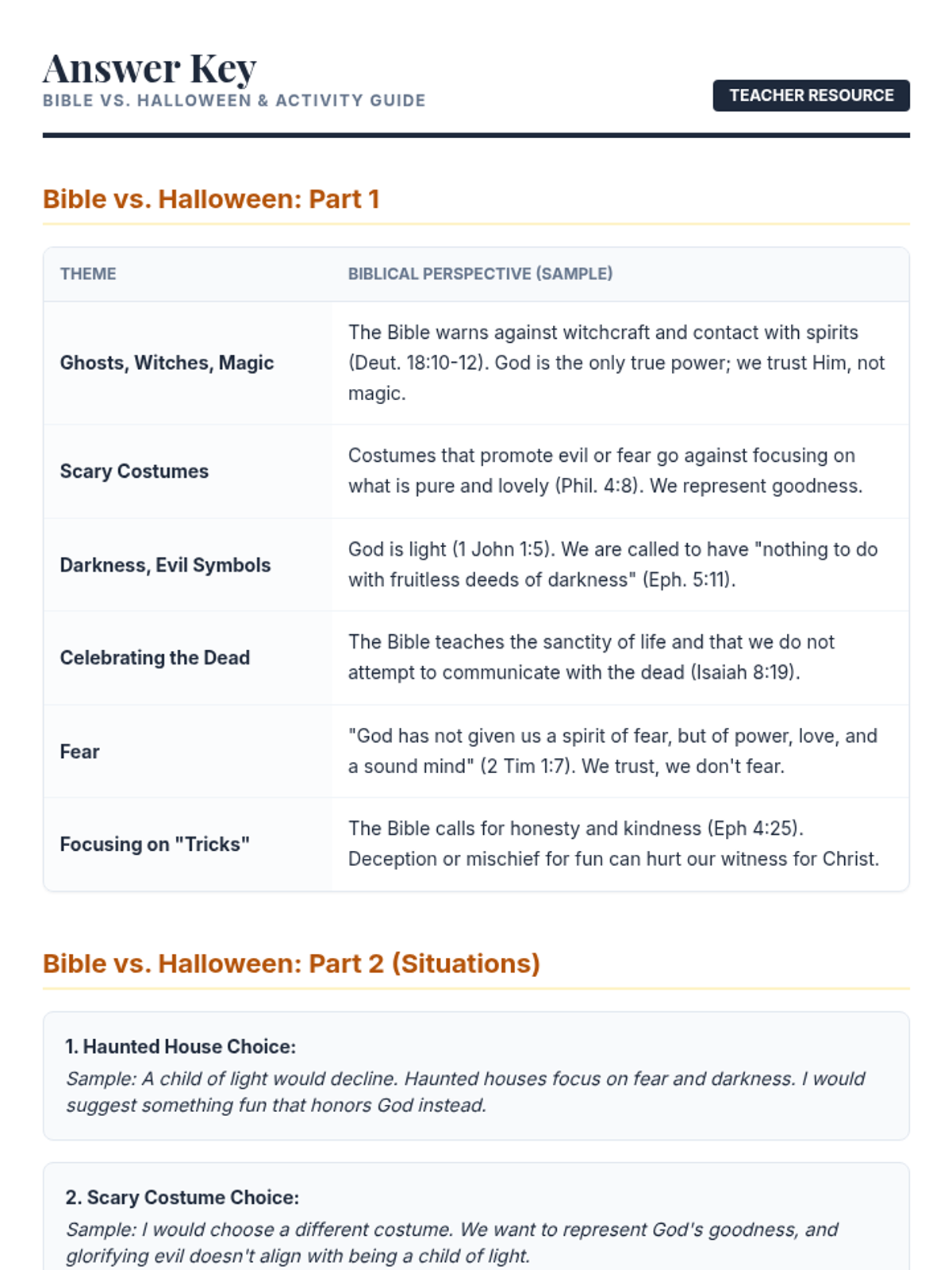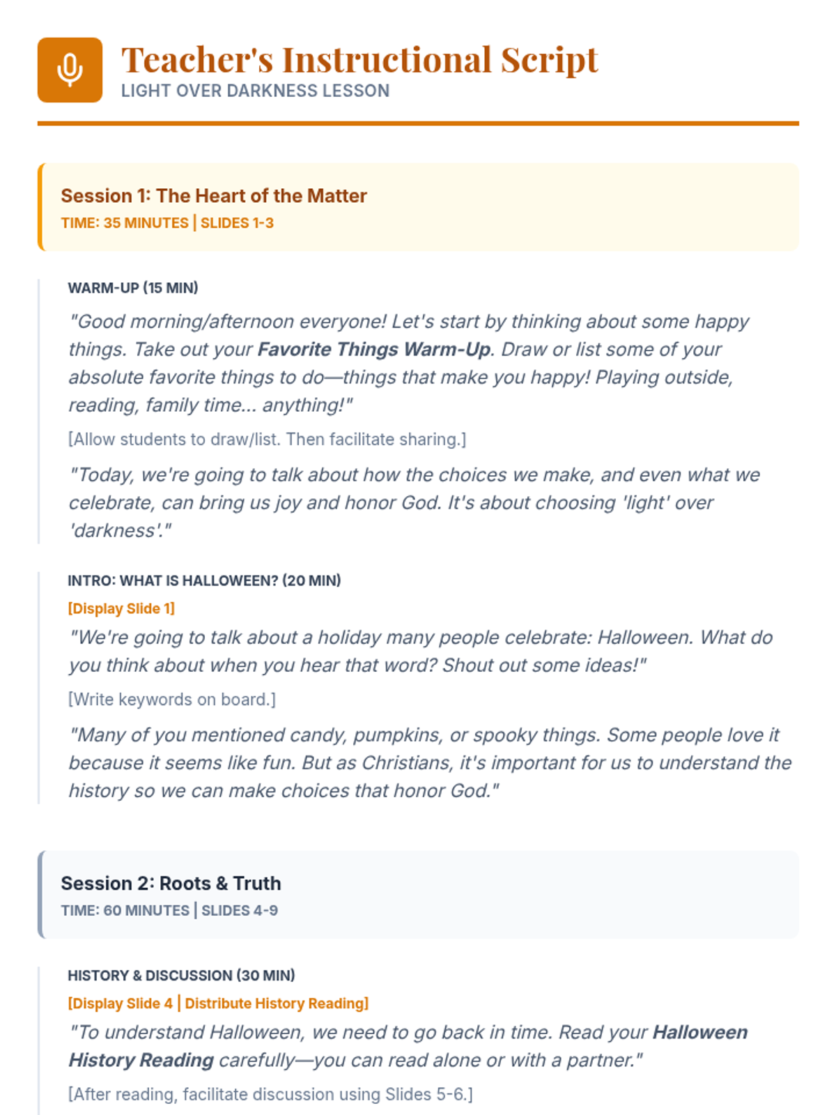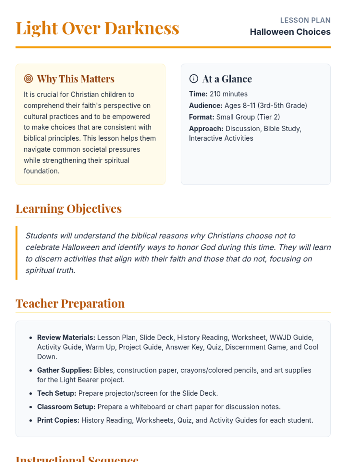 A comprehensive 210-minute Bible lesson for Christian kids (ages 8-11) exploring the origins of Halloween through a biblical lens, emphasizing choosing light over darkness and honoring God.