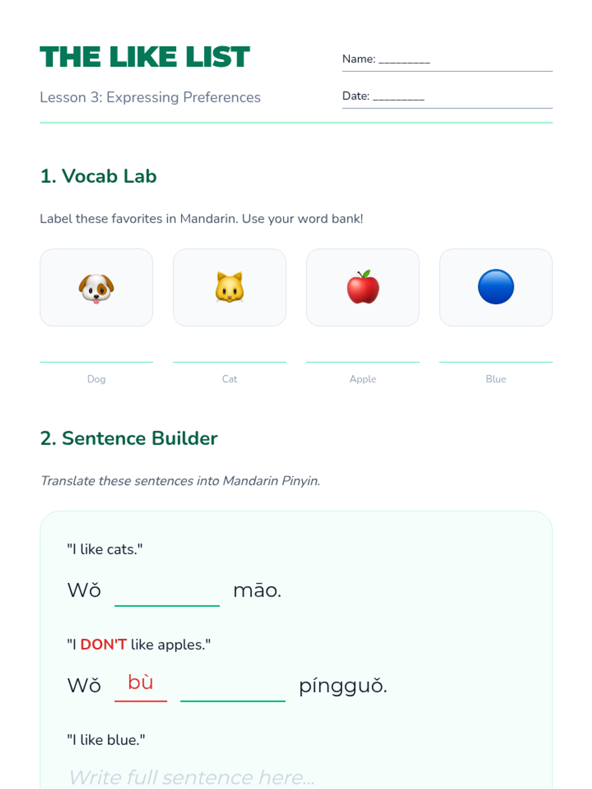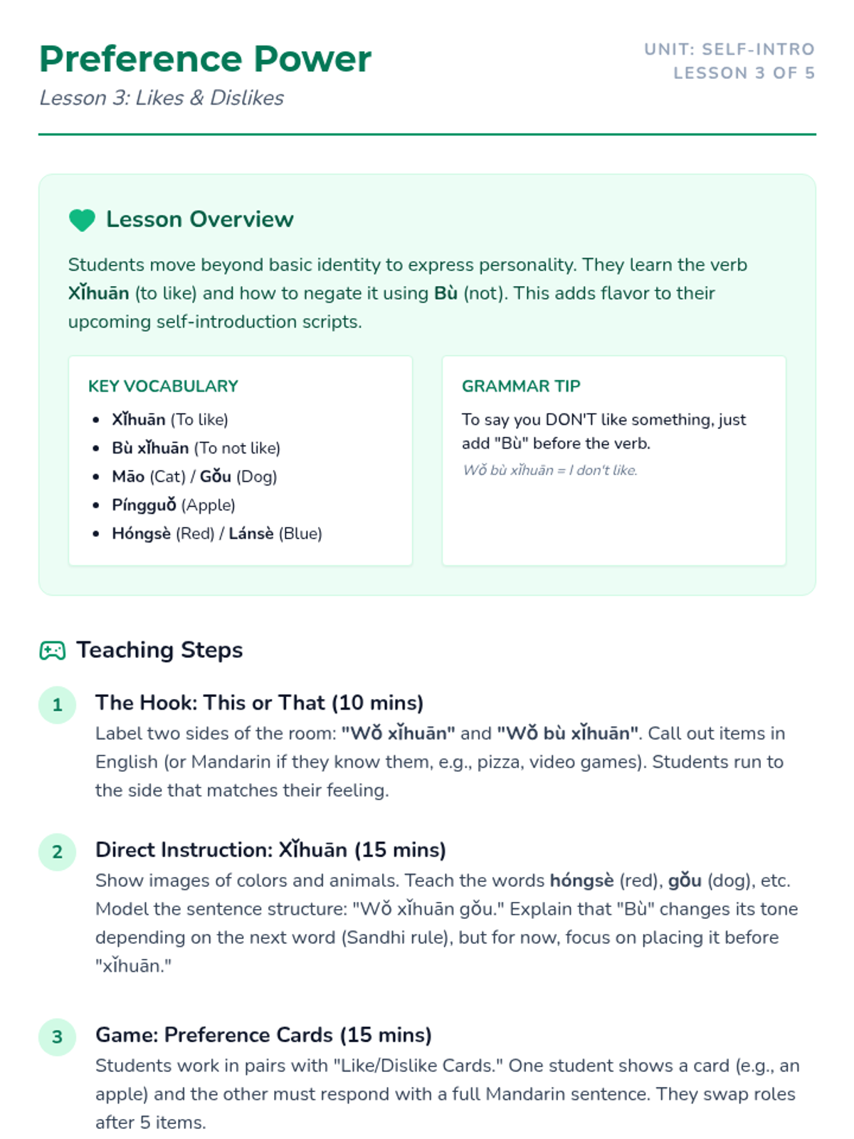 Students learn the verb 'to like' (xihuan) to express simple preferences for colors, animals, or foods. They practice forming positive and negative sentences.
