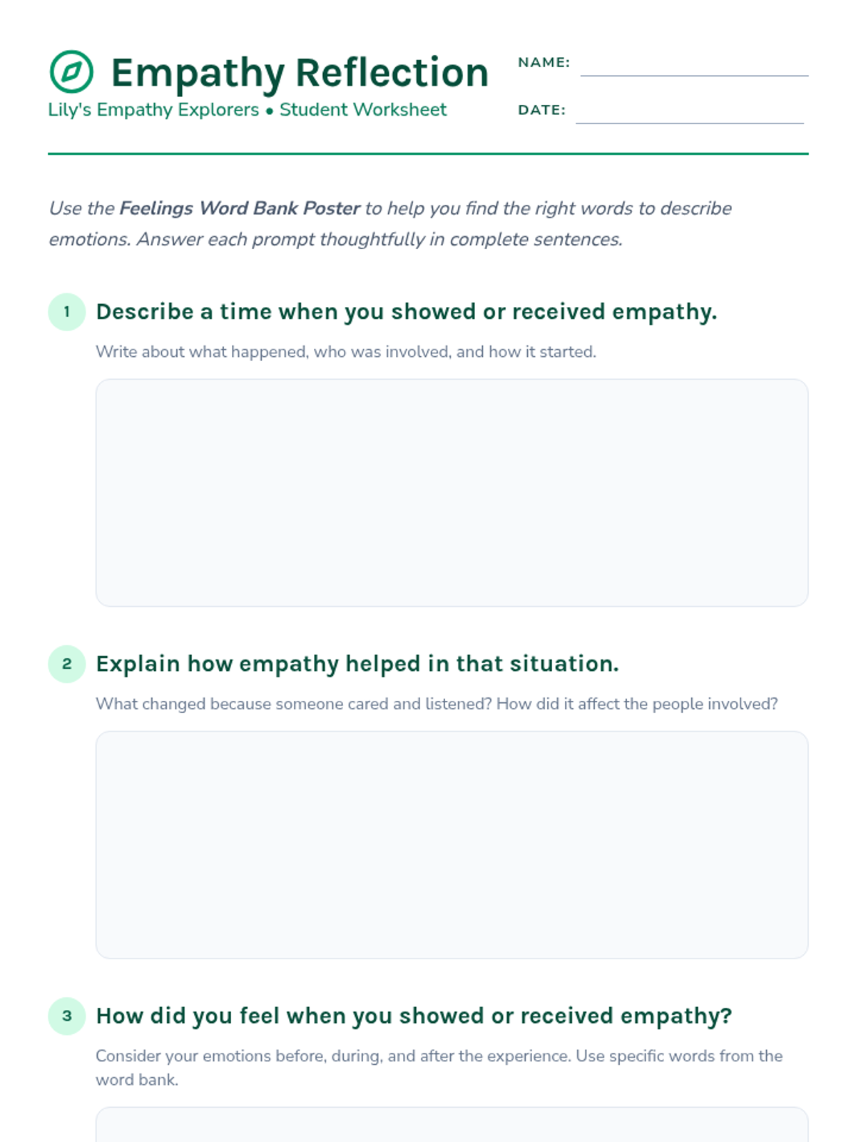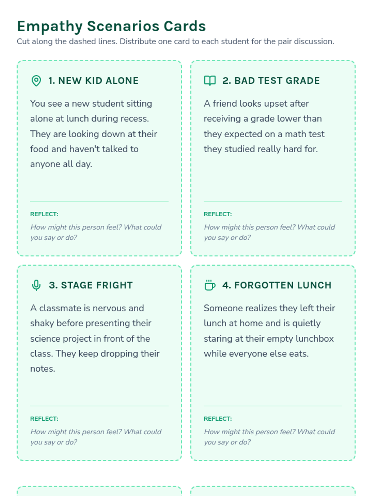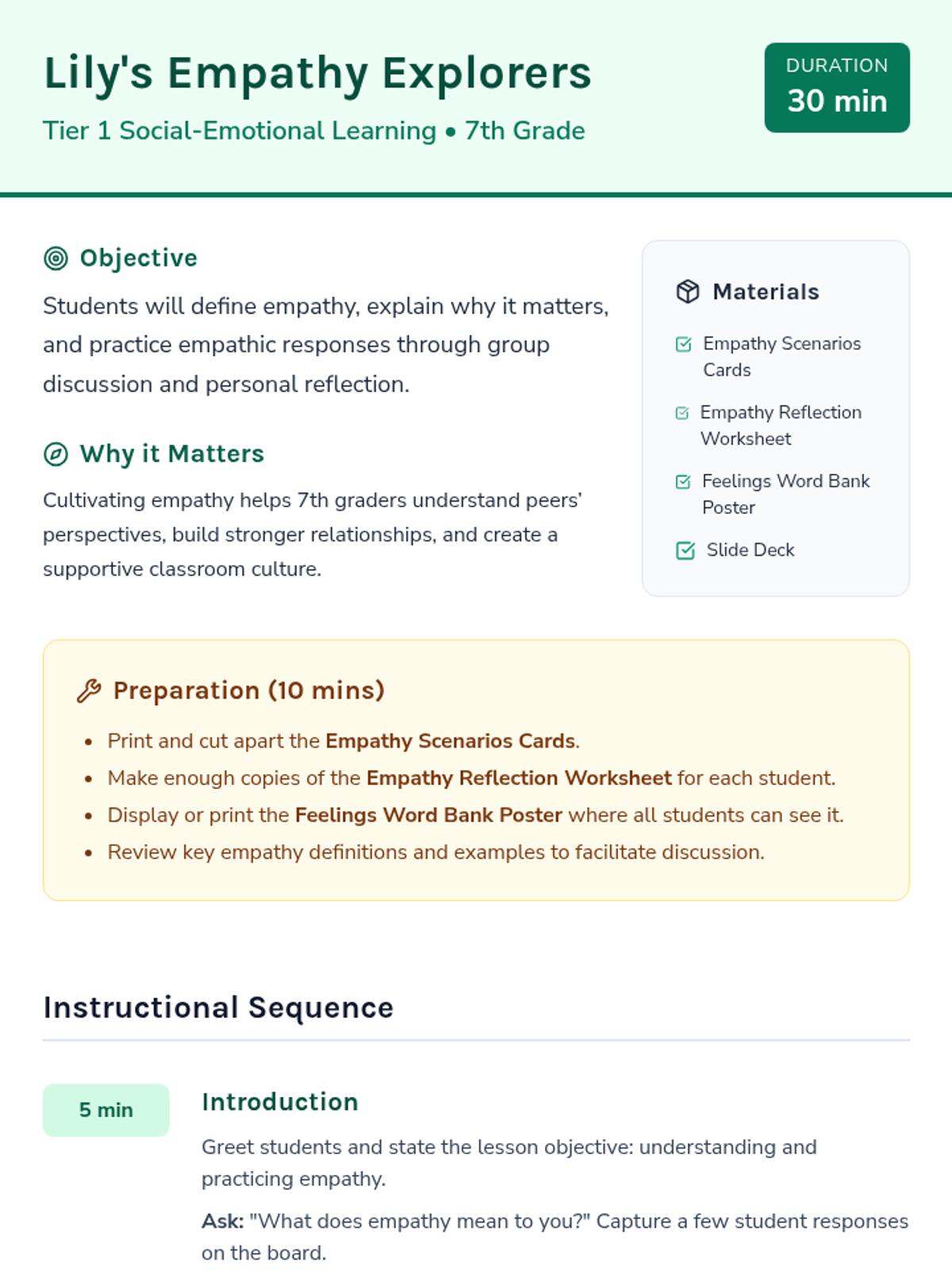 A 30-minute Tier 1 SEL lesson for 7th graders focusing on defining, understanding, and practicing empathy through interactive scenarios and personal reflection.