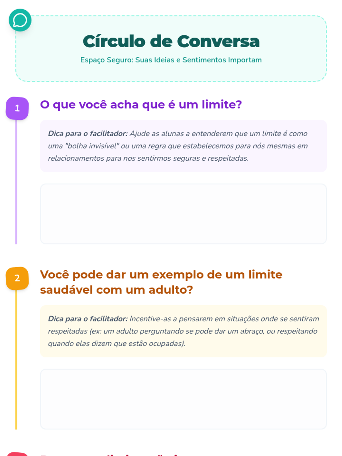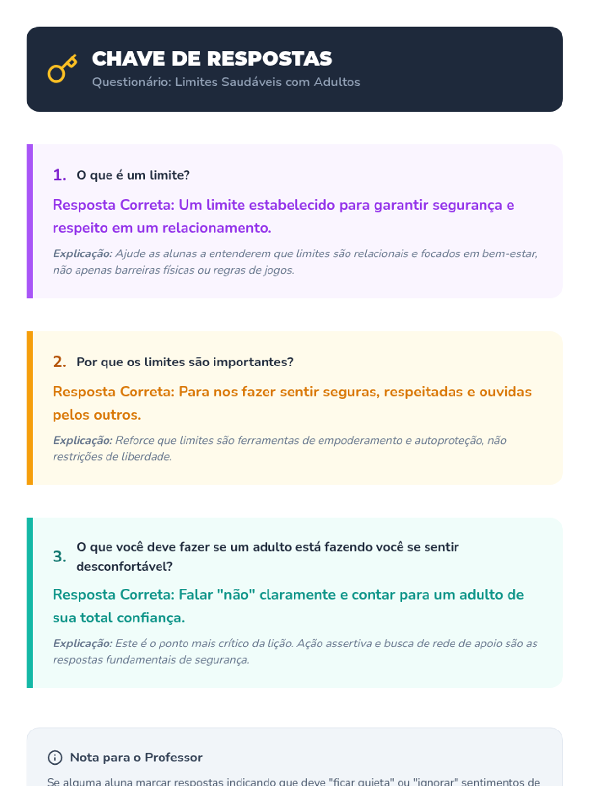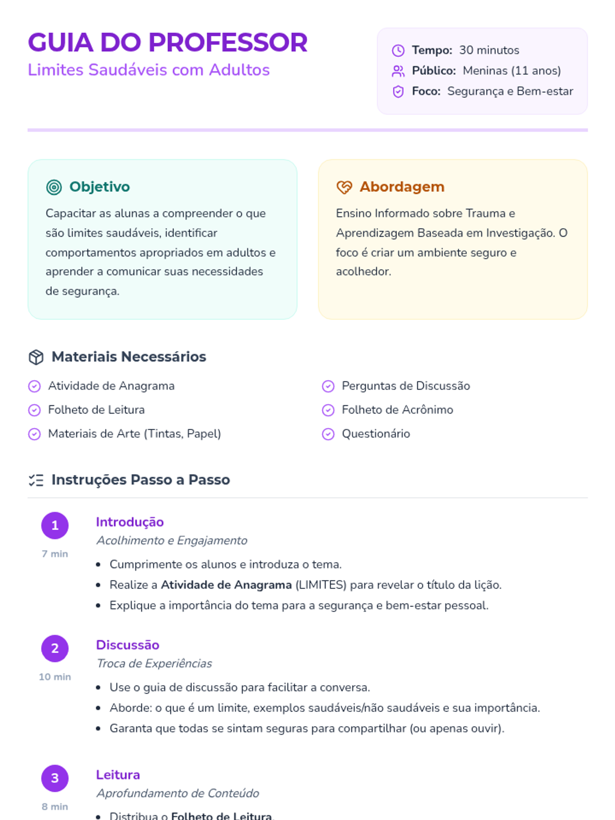 Uma lição de 30 minutos para meninas de 11 anos sobre como identificar, estabelecer e manter limites saudáveis com adultos para garantir segurança e bem-estar.