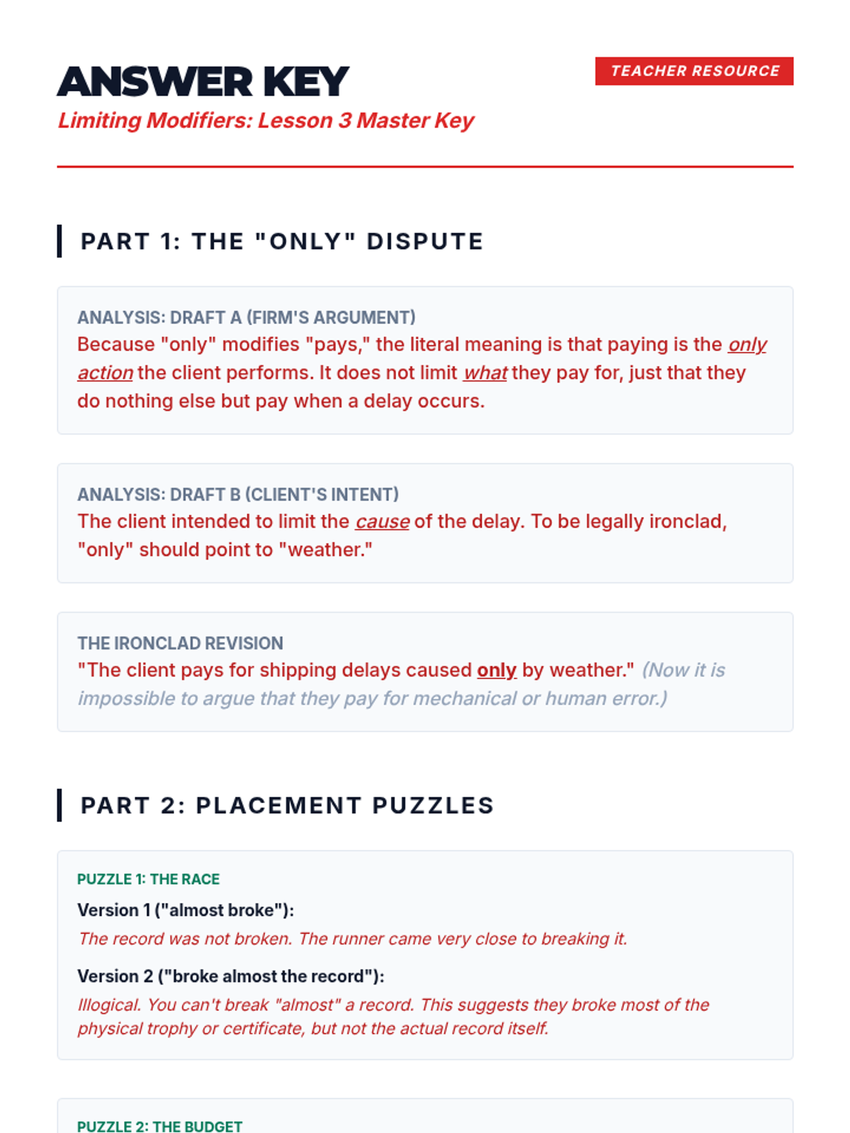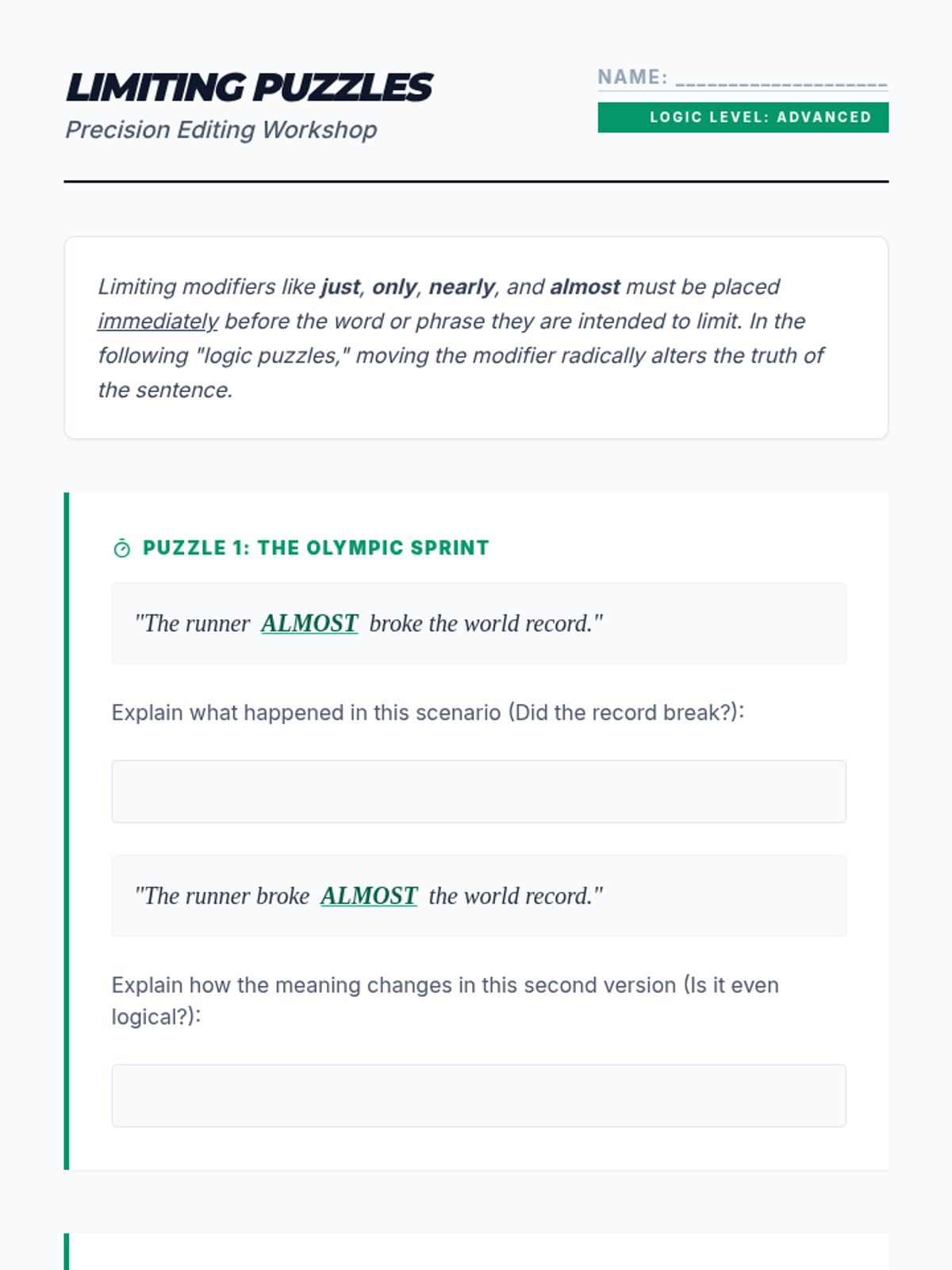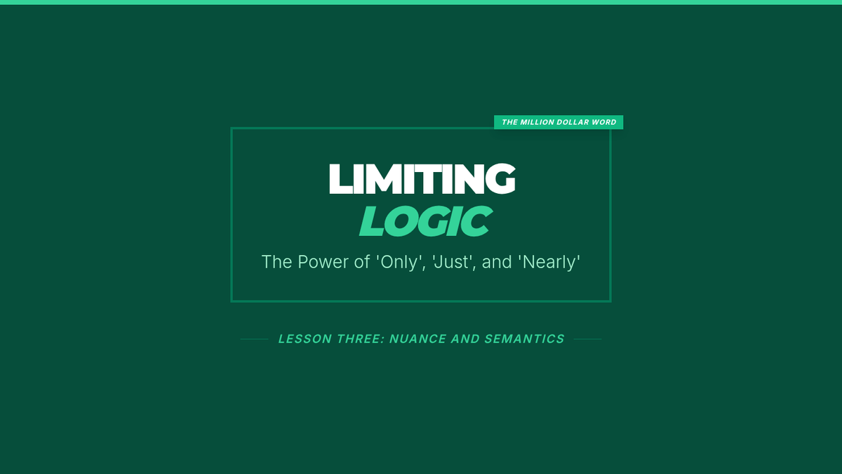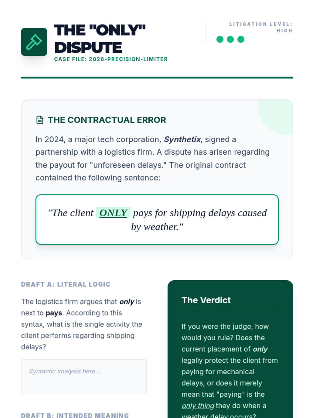 Explores the subtle impact of limiting modifiers like 'only' and 'just' through logic puzzles and a legal contract scenario.
