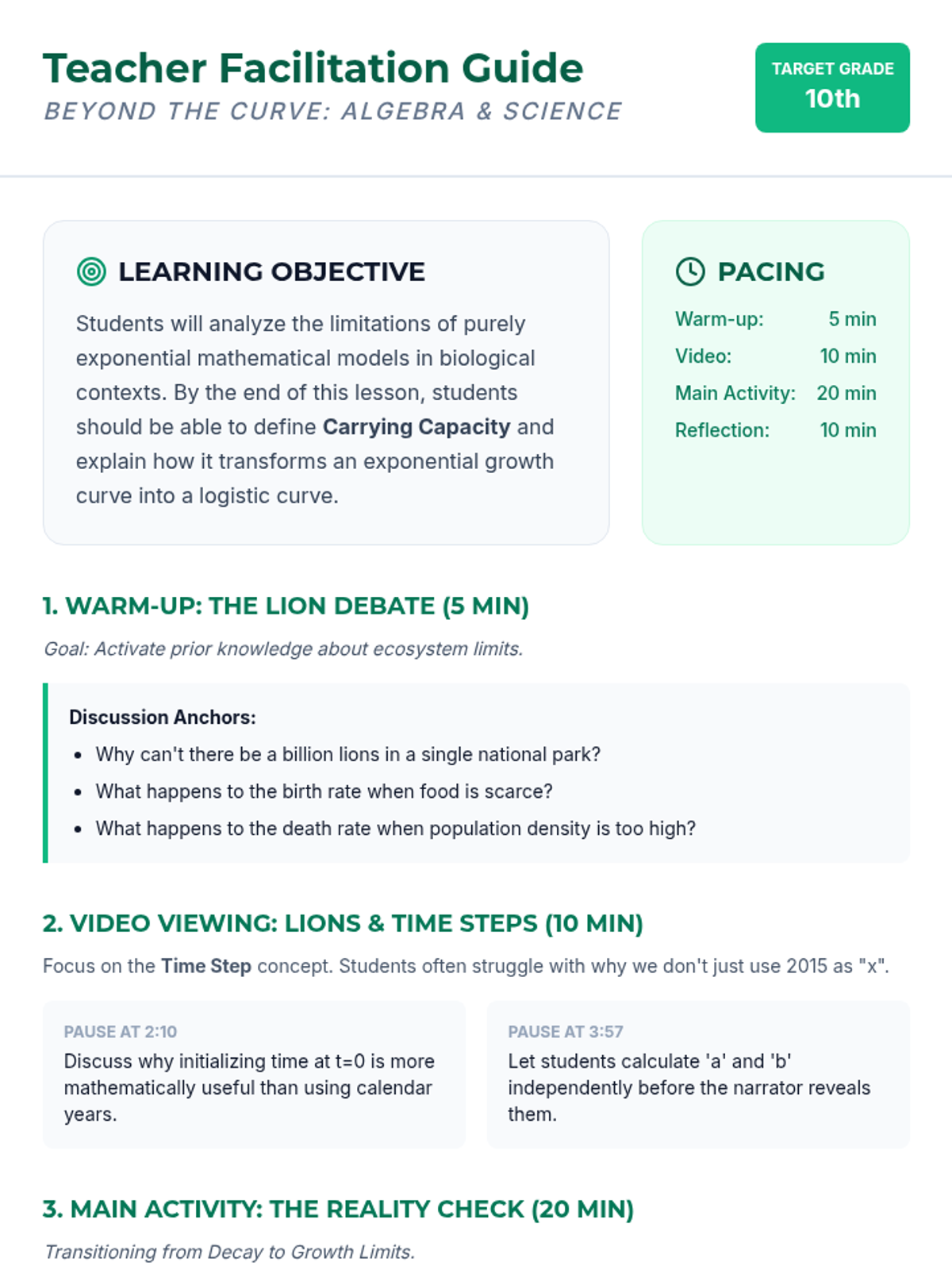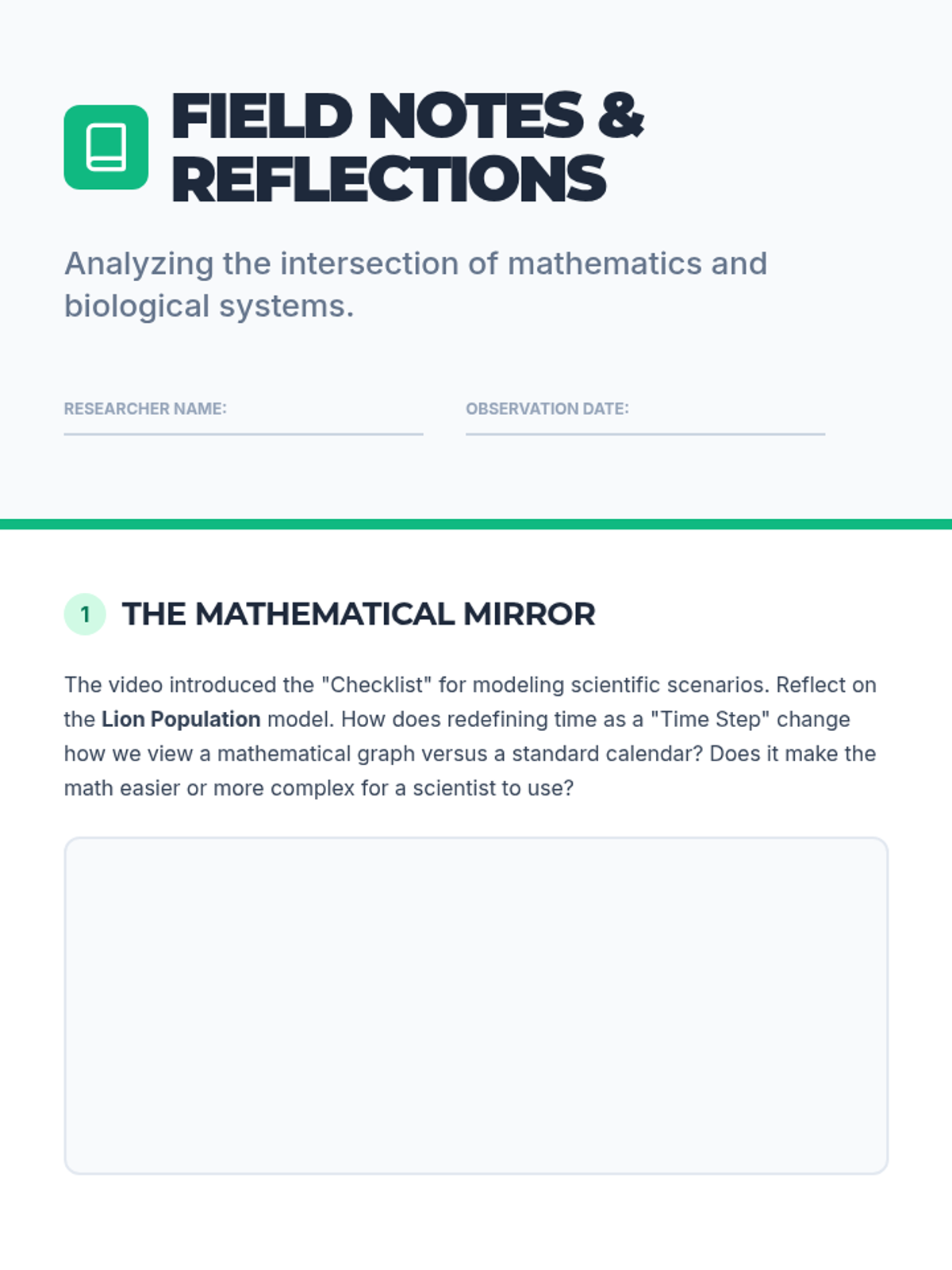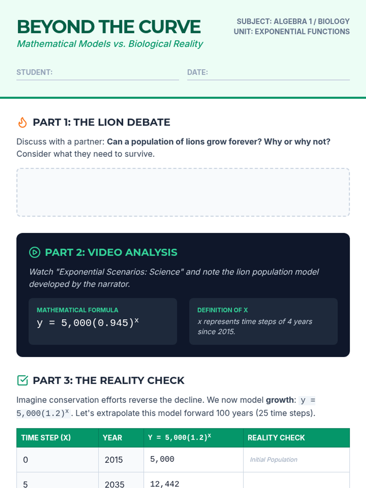 Students will investigate the limitations of exponential models by analyzing a lion population scenario. They will transition from purely mathematical extrapolation to scientific reality by exploring 'Carrying Capacity' and sketching logistic growth curves.