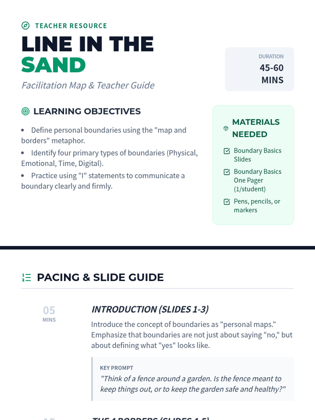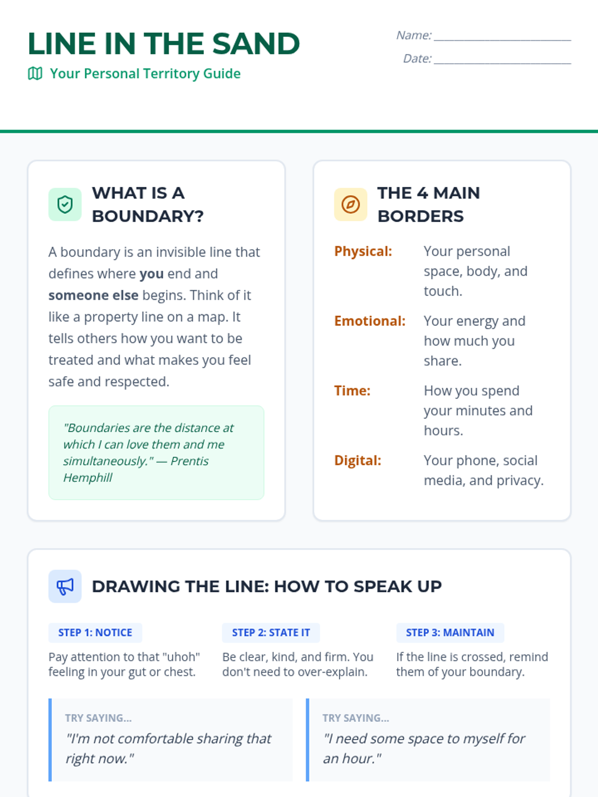 A foundational lesson introducing the concept of personal boundaries, why they matter, and how to communicate them effectively using a 'map and borders' metaphor.