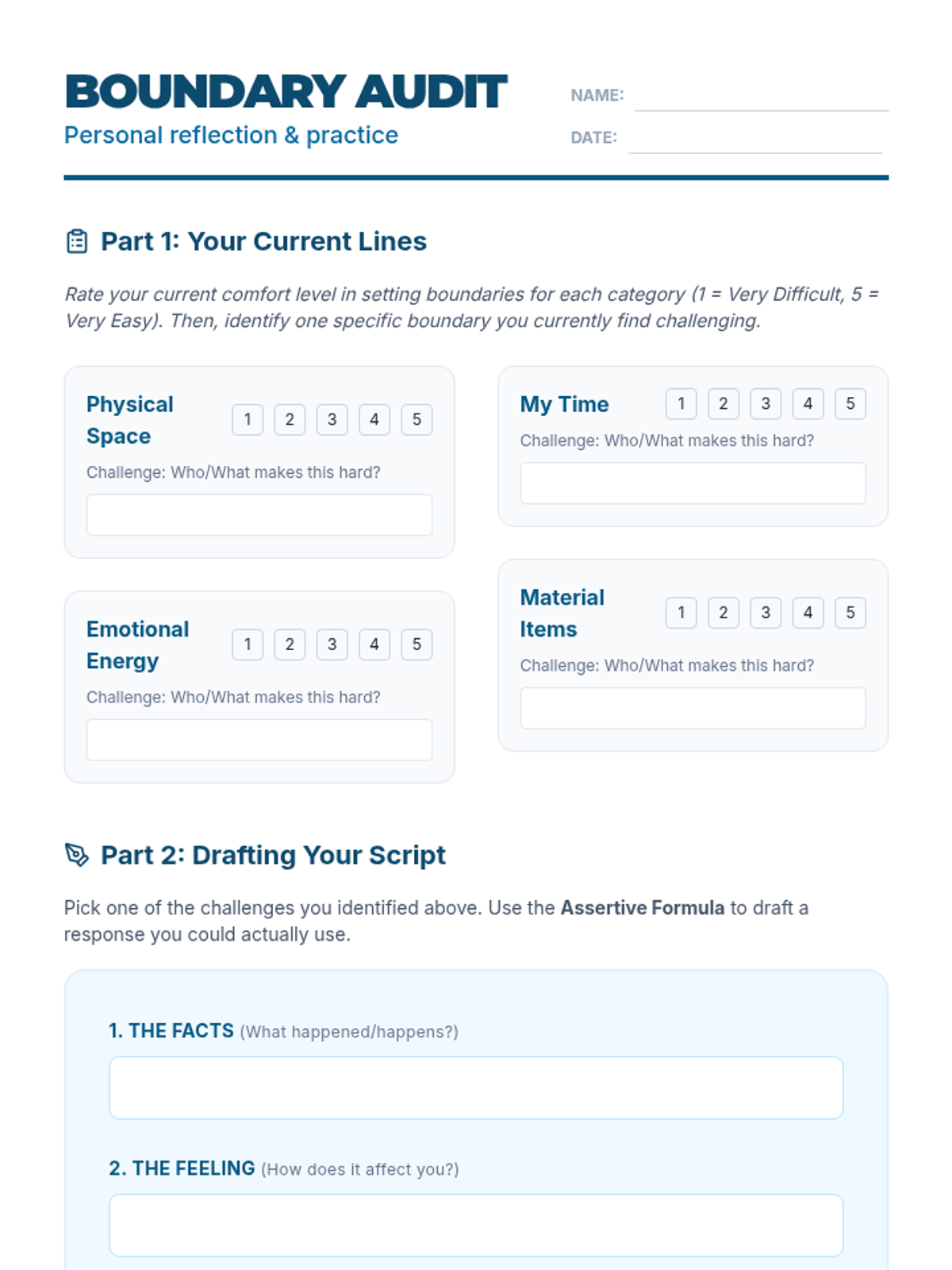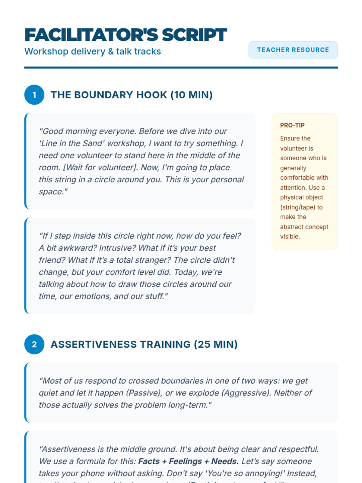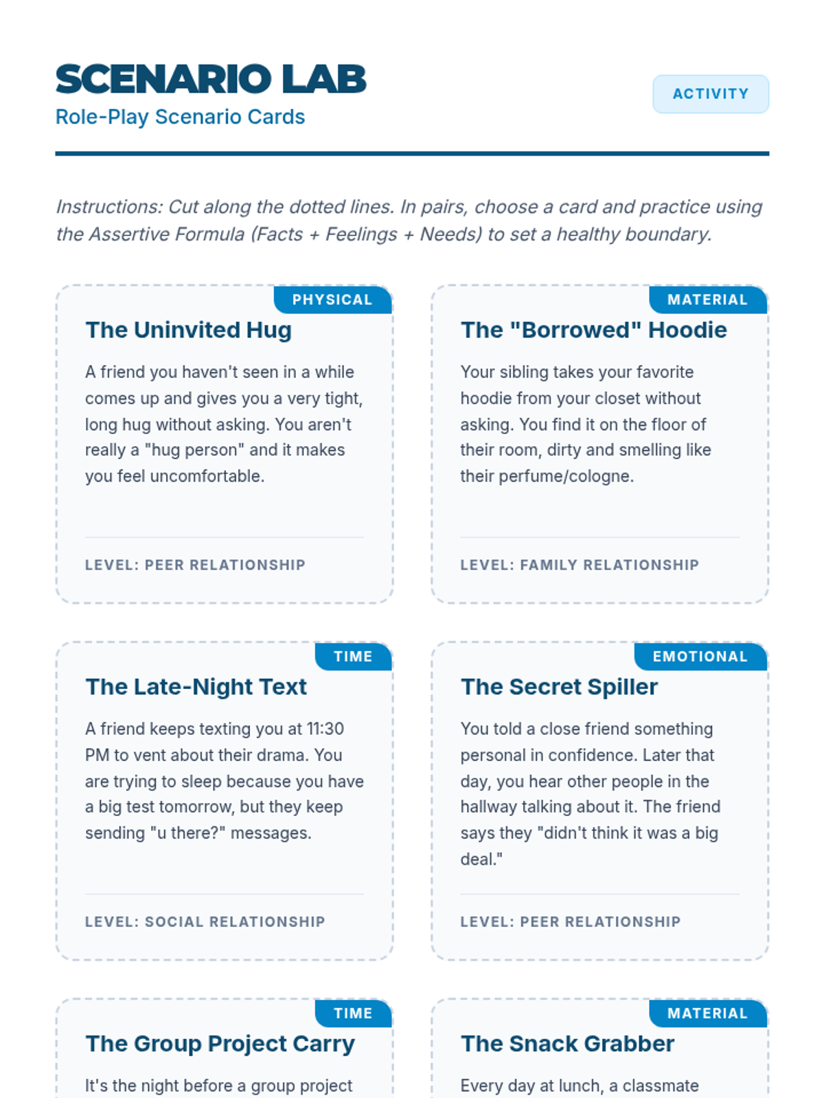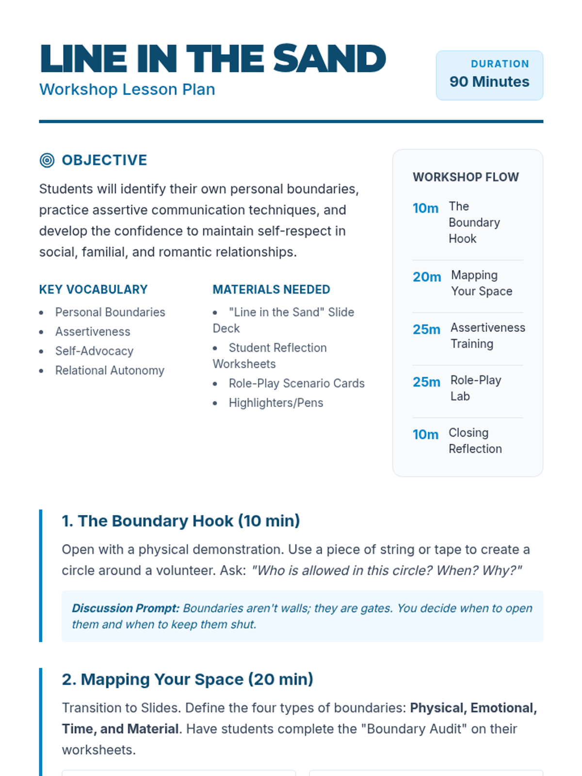 A comprehensive workshop designed for high school students to master the art of personal boundaries. Through interactive role-plays and assertive communication training, students learn to protect their mental well-on and build respectful relationships.