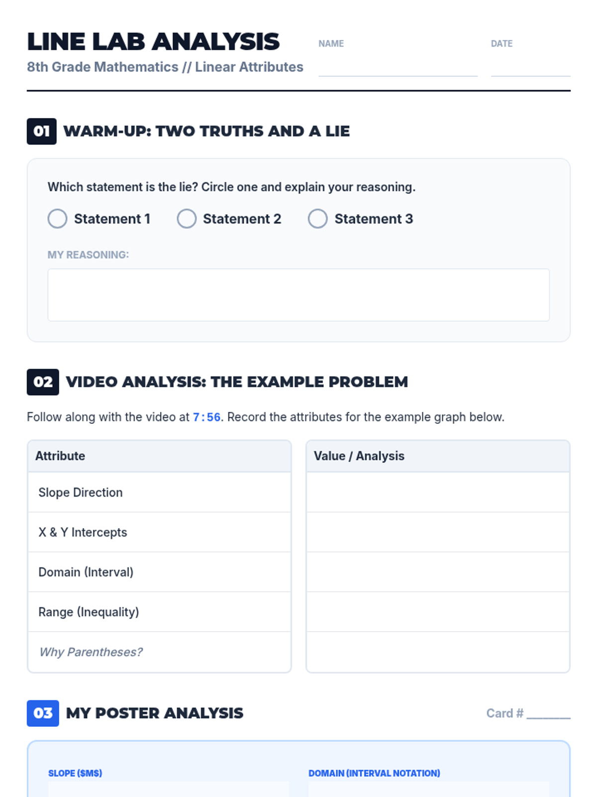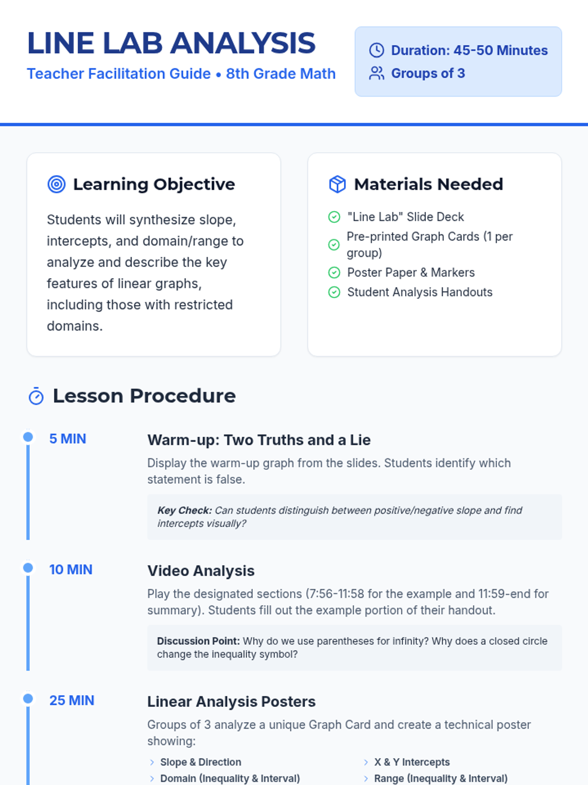 An 8th-grade math lesson where students analyze linear graphs by synthesizing slope, intercepts, and domain/range using a collaborative poster activity and a detailed video guide.