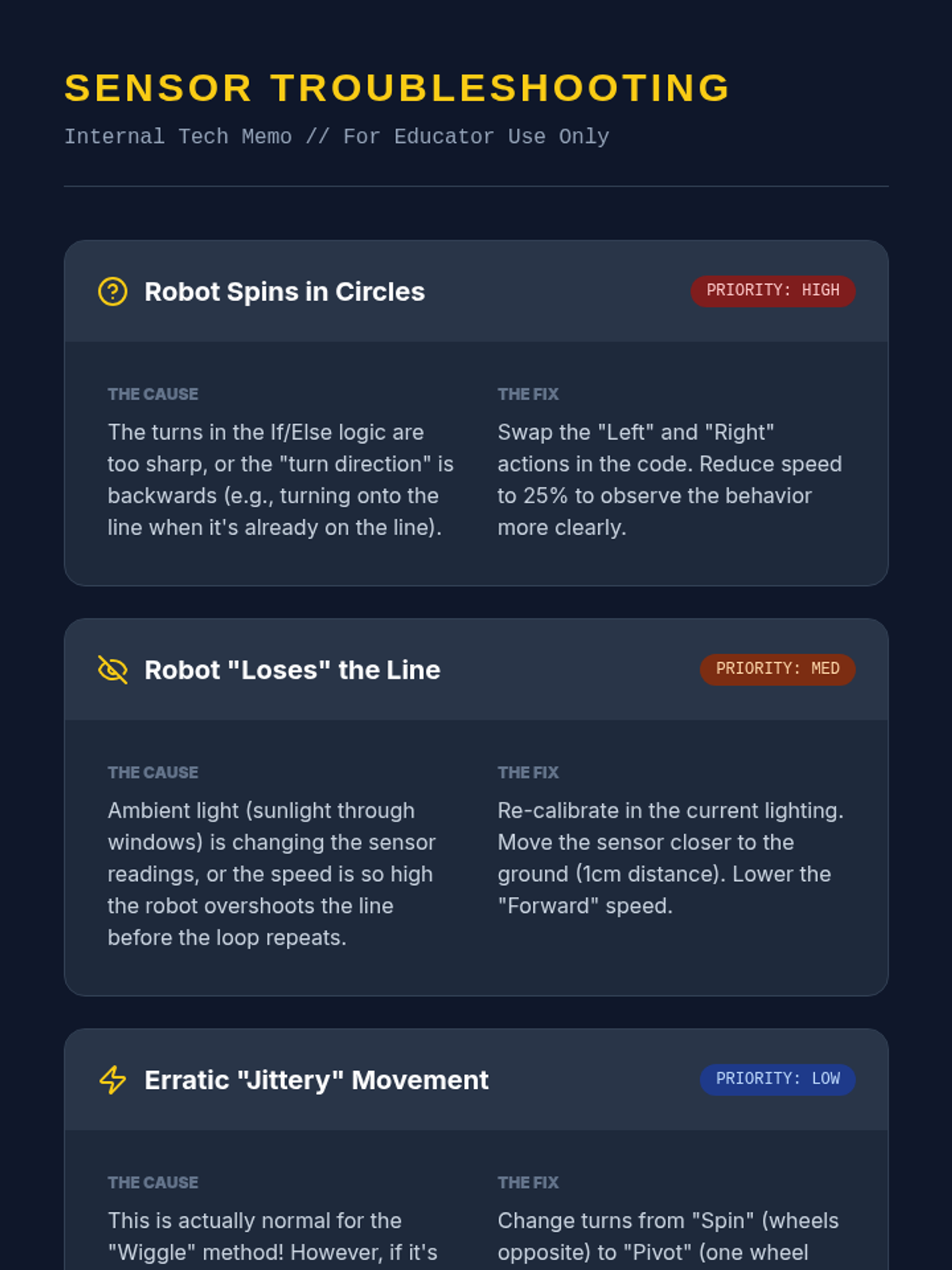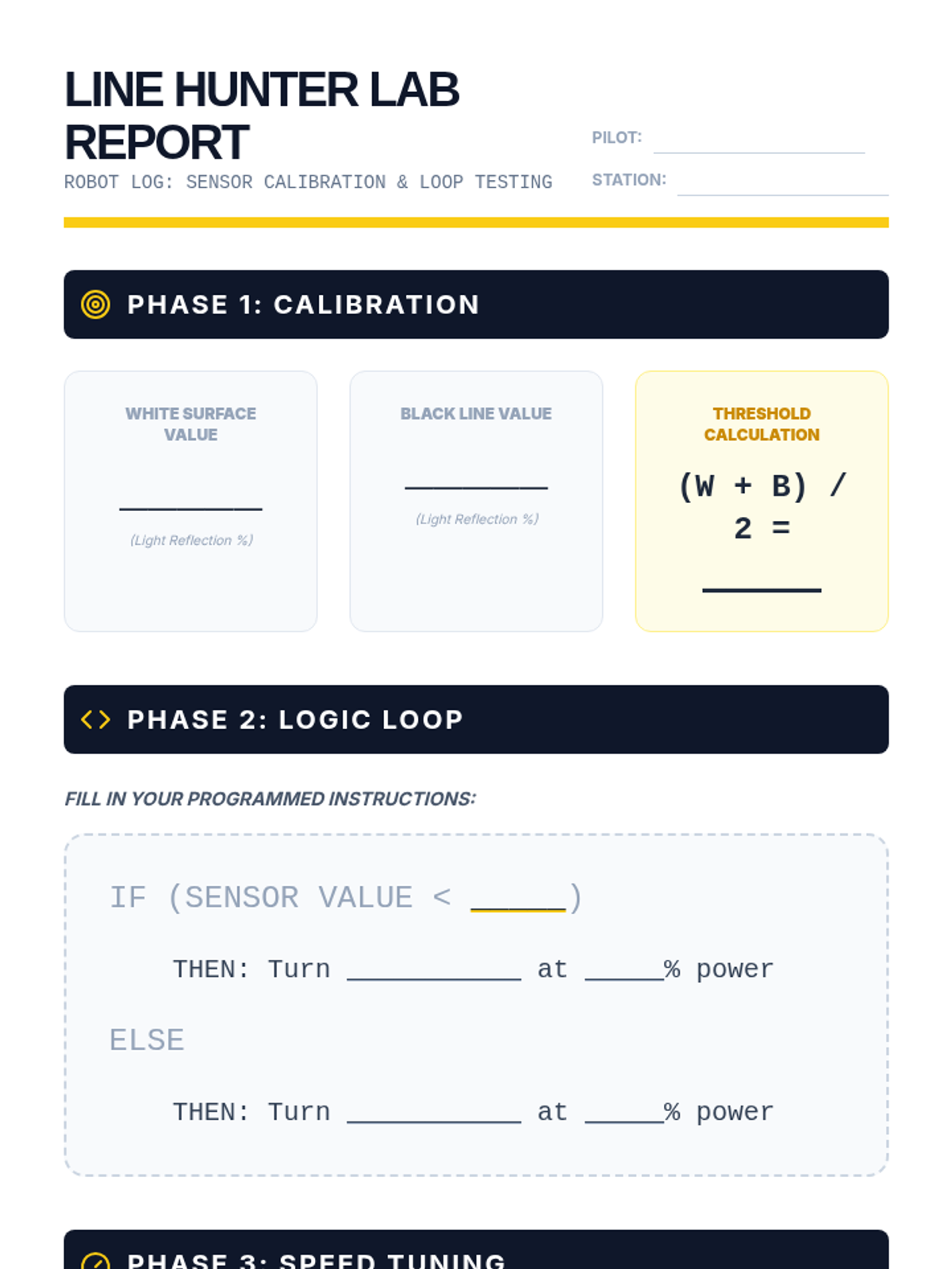 Learners program a robot to follow a black line on a white background using light sensors, investigating the 'wiggle' method and feedback loops.