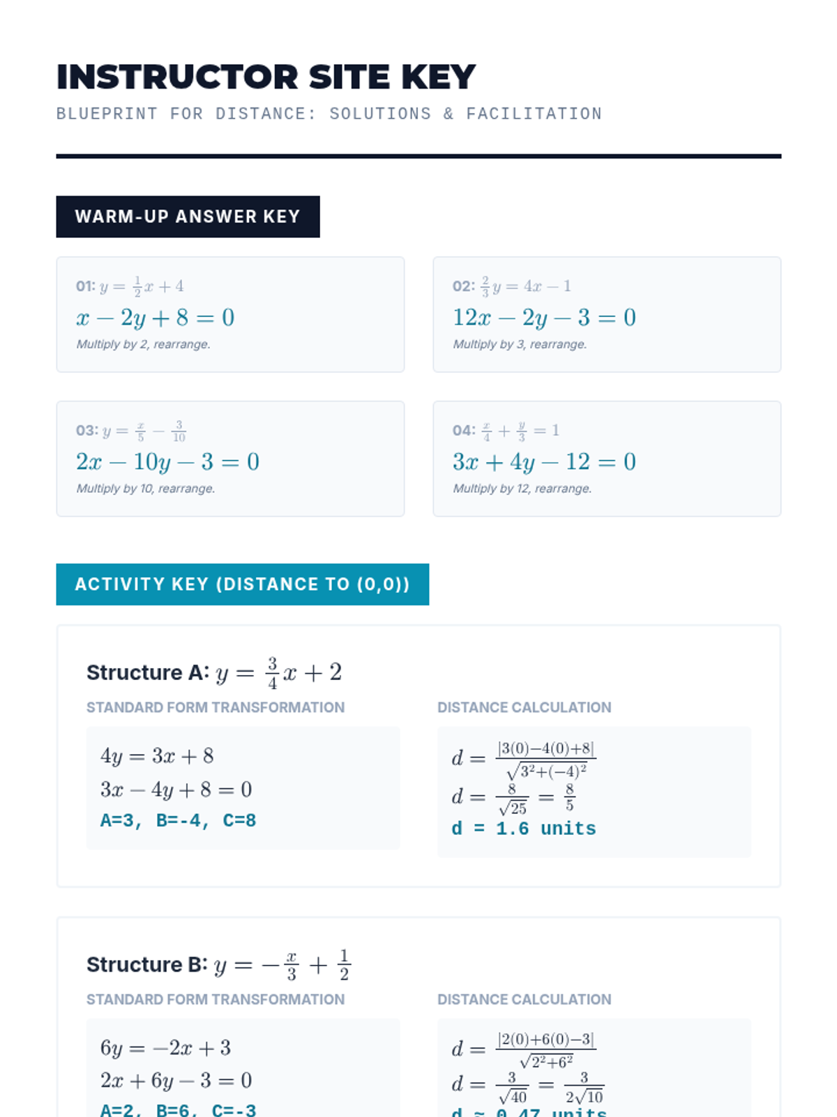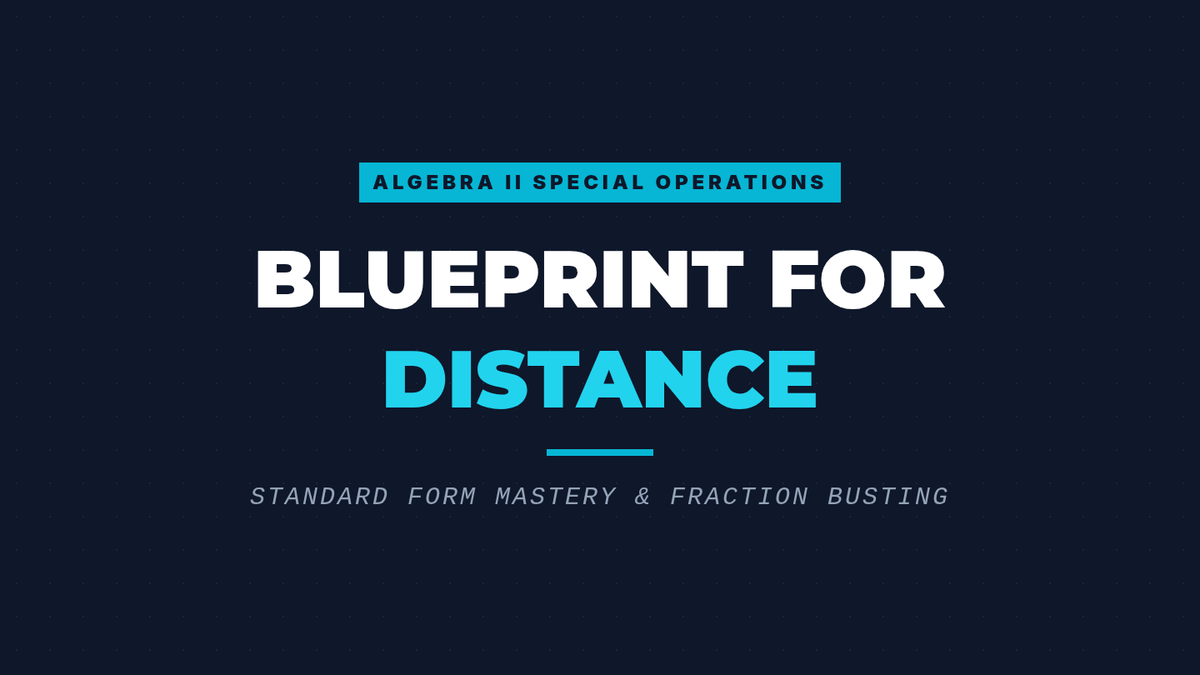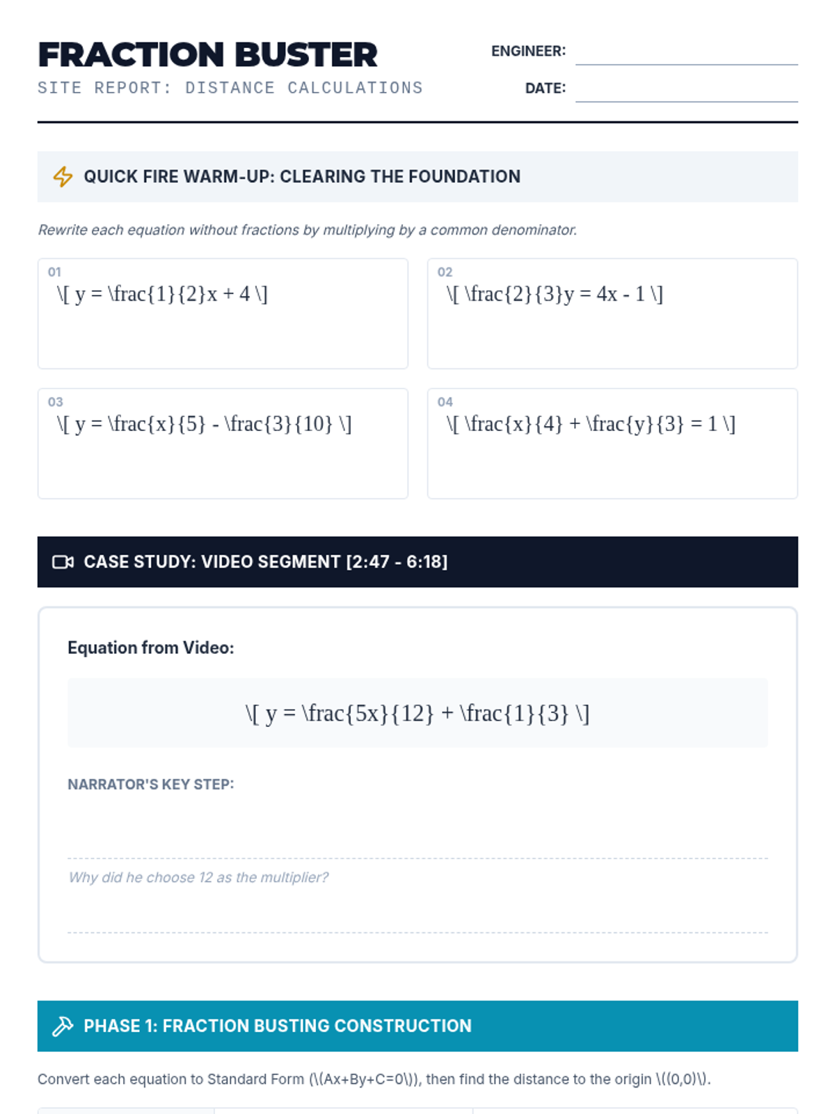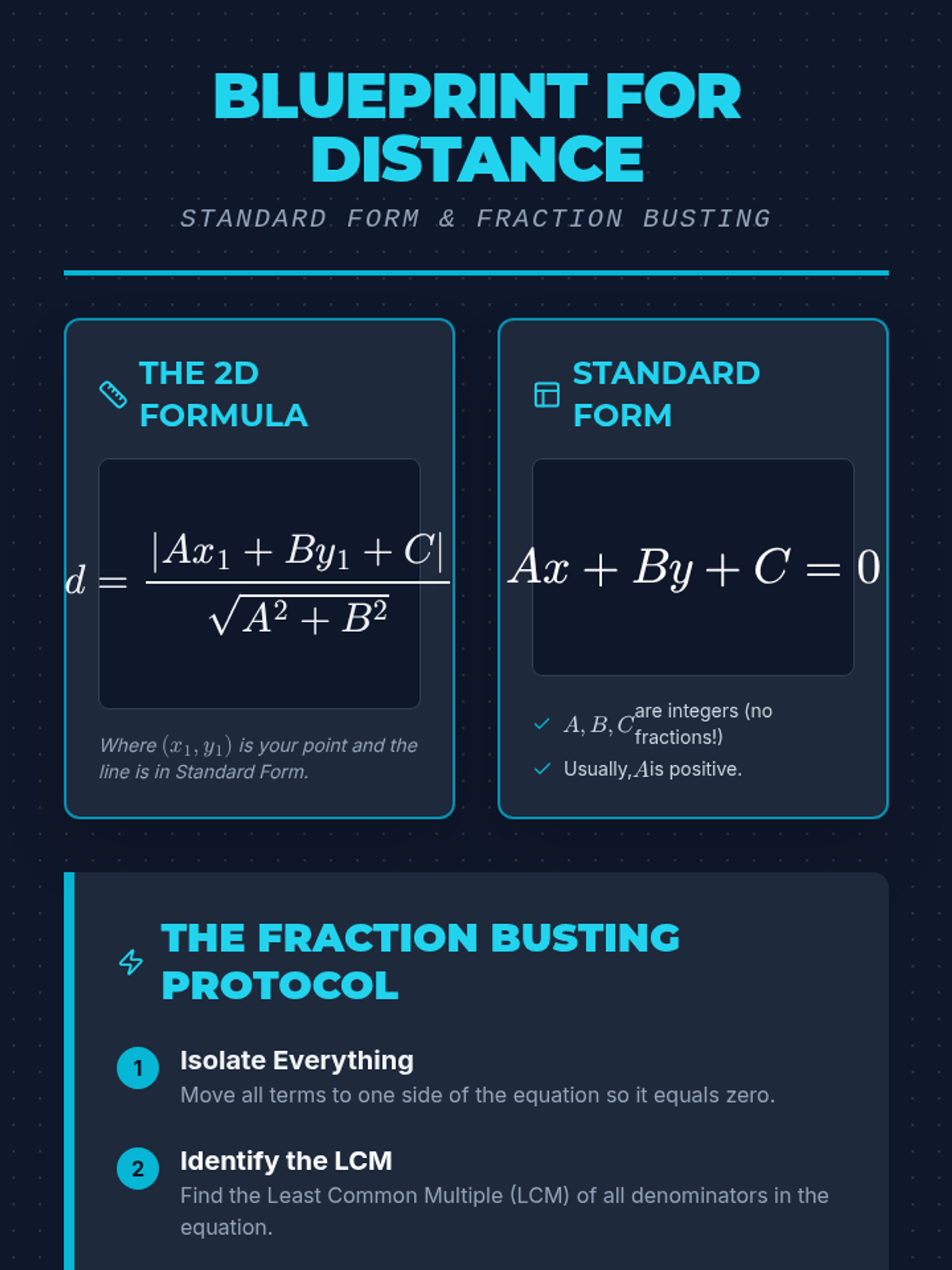 A lesson focused on transforming linear equations with fractions into standard form to calculate the perpendicular distance to a point, specifically the origin. Includes practice with 'fraction busting' techniques and applying the 2D distance formula.