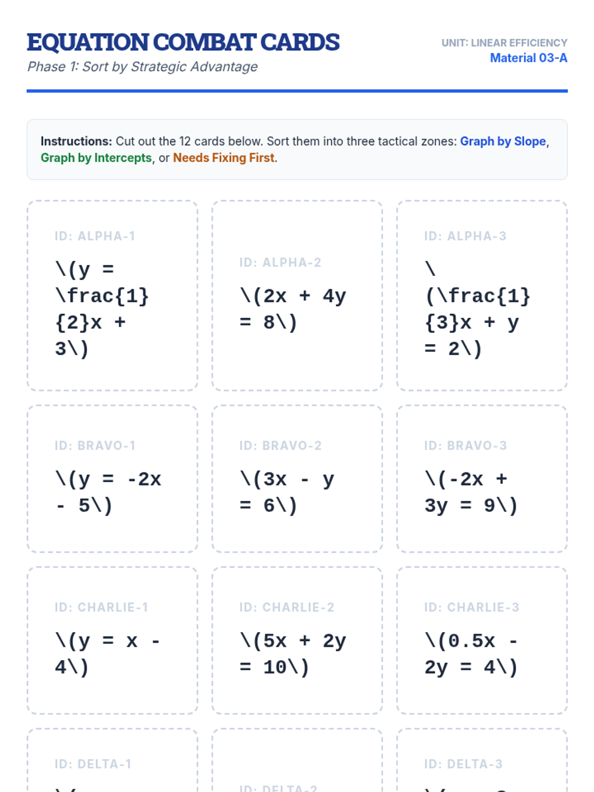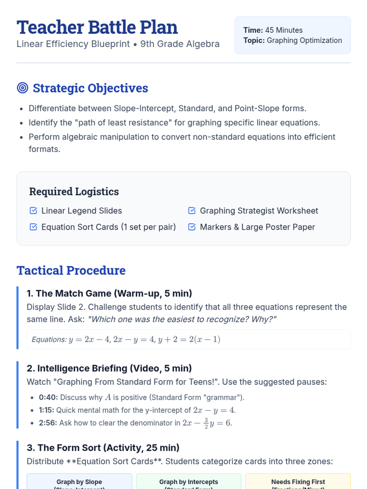 Students compare linear forms (Slope-Intercept, Standard, and Point-Slope) to evaluate which format offers the most efficient graphing path. The lesson features a 'Form Sort' activity and the creation of a Graphing Decision Tree.