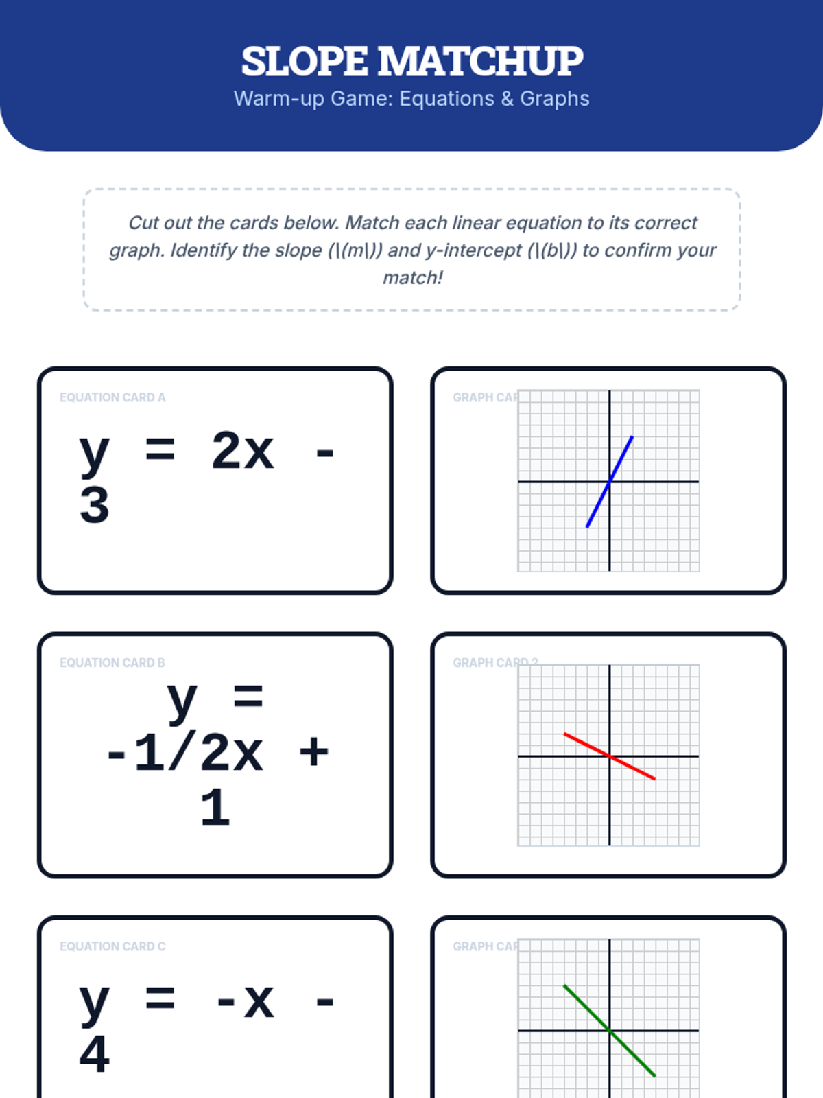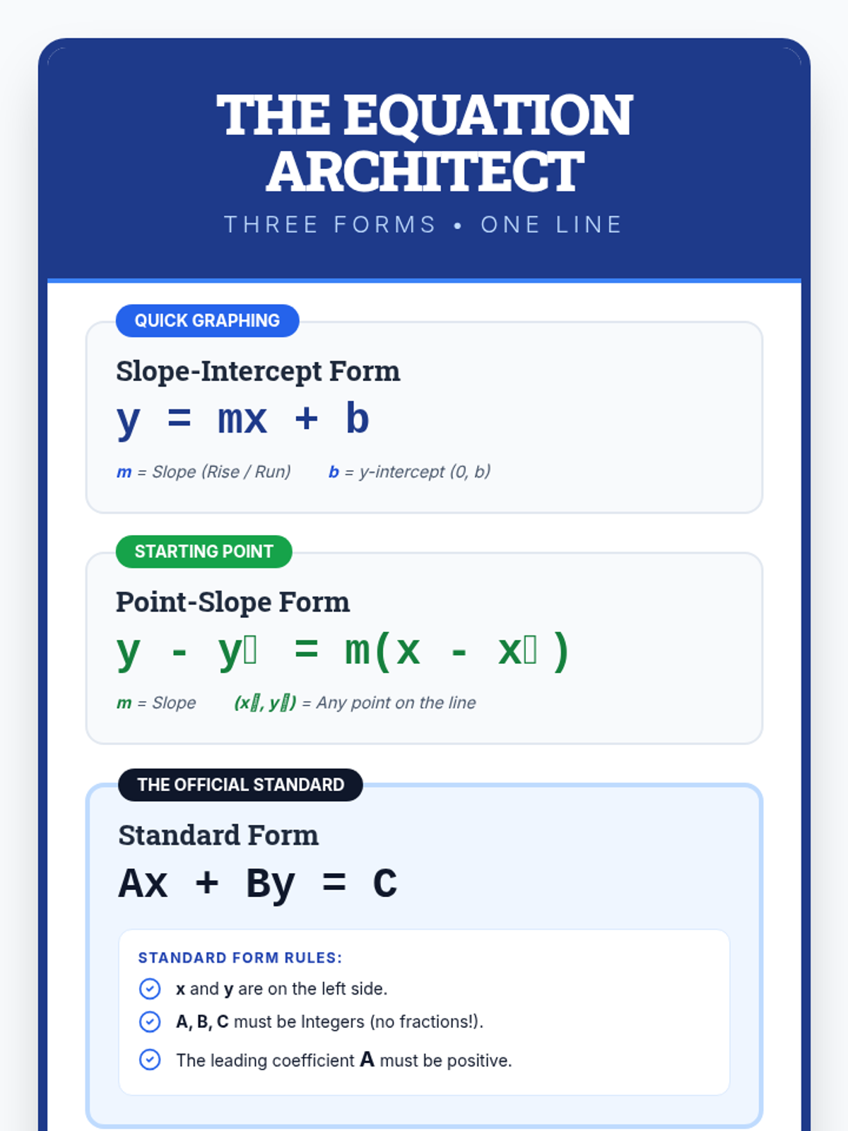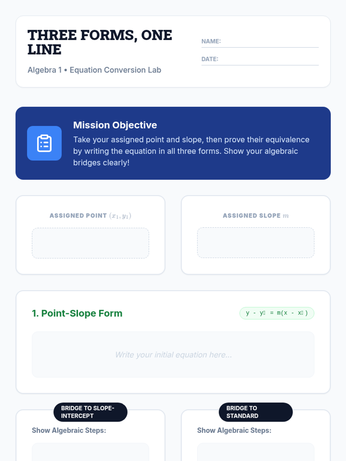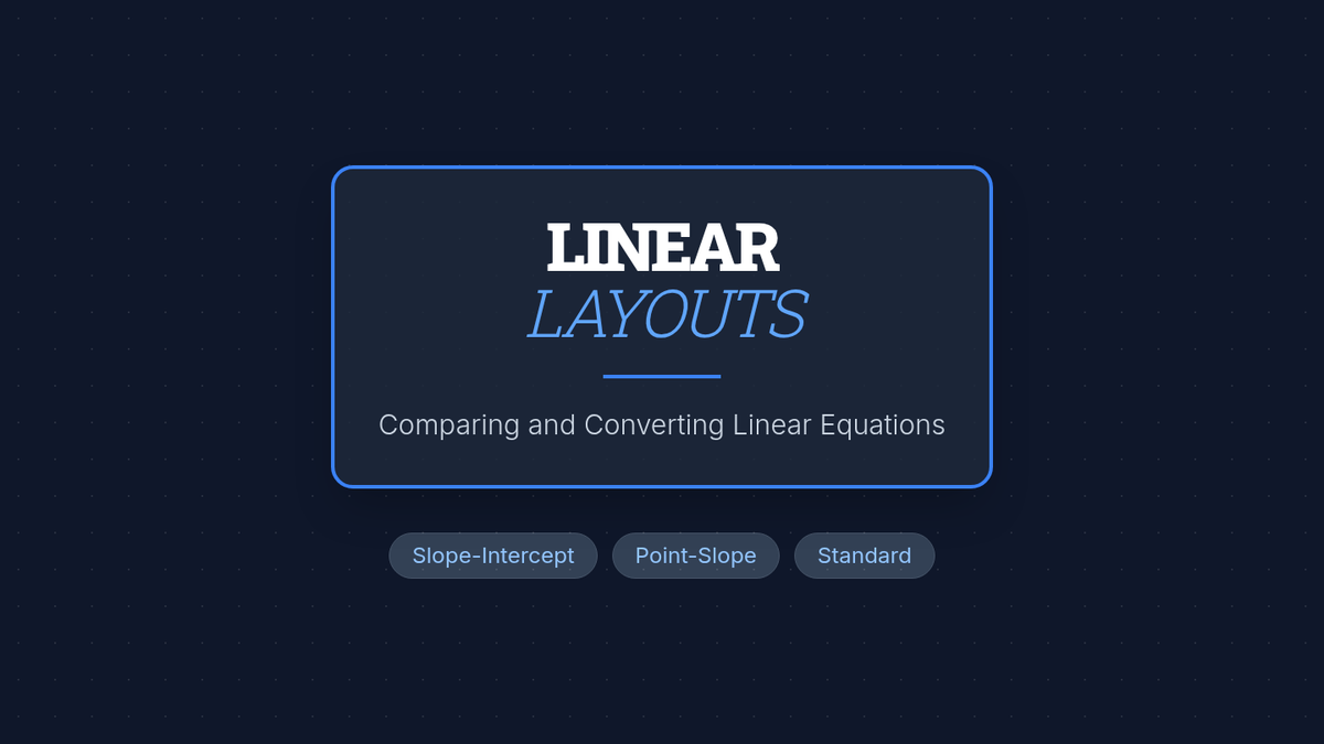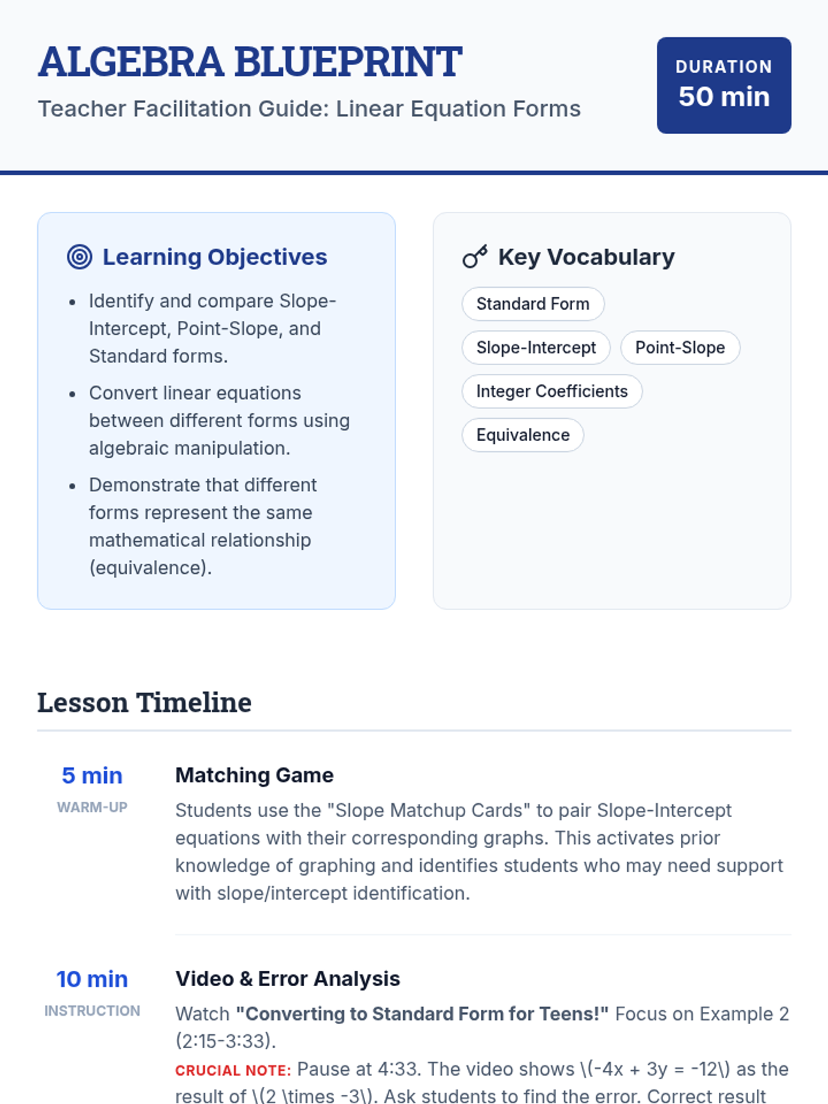 A comprehensive lesson for 9th-grade students to master the three forms of linear equations: Slope-Intercept, Point-Slope, and Standard. Students will watch a targeted video on conversion, analyze mathematical errors, and create posters demonstrating how a single line can be represented in multiple equivalent ways.